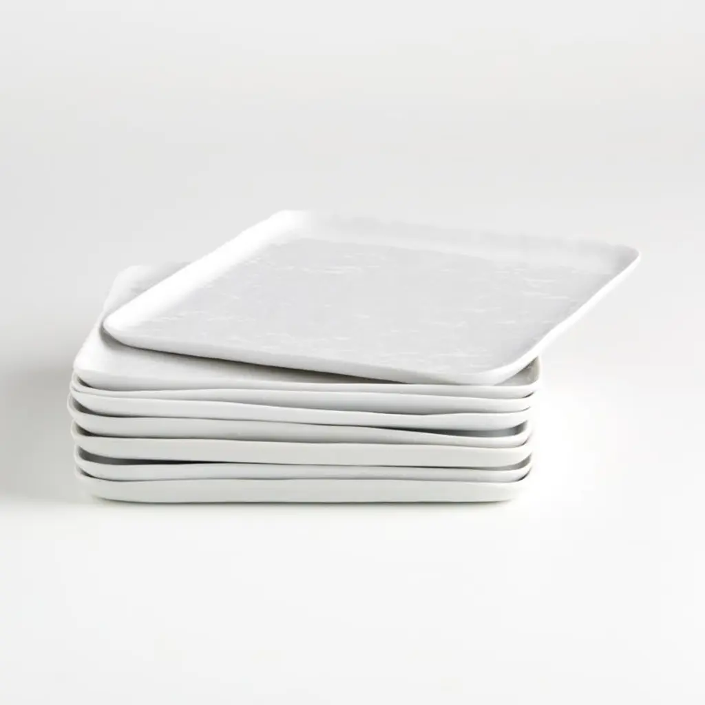 Contemporary porcelain whiteware represents a fusion of refinement and rusticity. The slim profile of this salad plate takes on organic overtones with freeform rims and a finely "hammered" surface that ripples the light. Smooth enough to not harm tables, the unglazed ceramic bottom gives each piece an artisanal look.