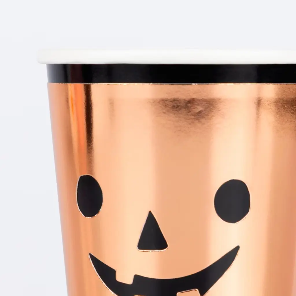 It's that pumpkin party time of year again, and these Halloween cups are ready to shine. Who says pumpkins have to be orange? These happy pumpkin Halloween paper cups offer a stylish twist in gleaming copper, bringing instant charm to your Halloween party table. With bold black details and a shimmering metallic finish, they're the perfect blend of playful and polished, ideal for hot and cold drinks.. Suitable for kids and adults alike, making them perfect for spooky sipping time. Whether you're hosting a kids party, a cosy family gathering or a grown up celebration, these party cups are sure to impress.
