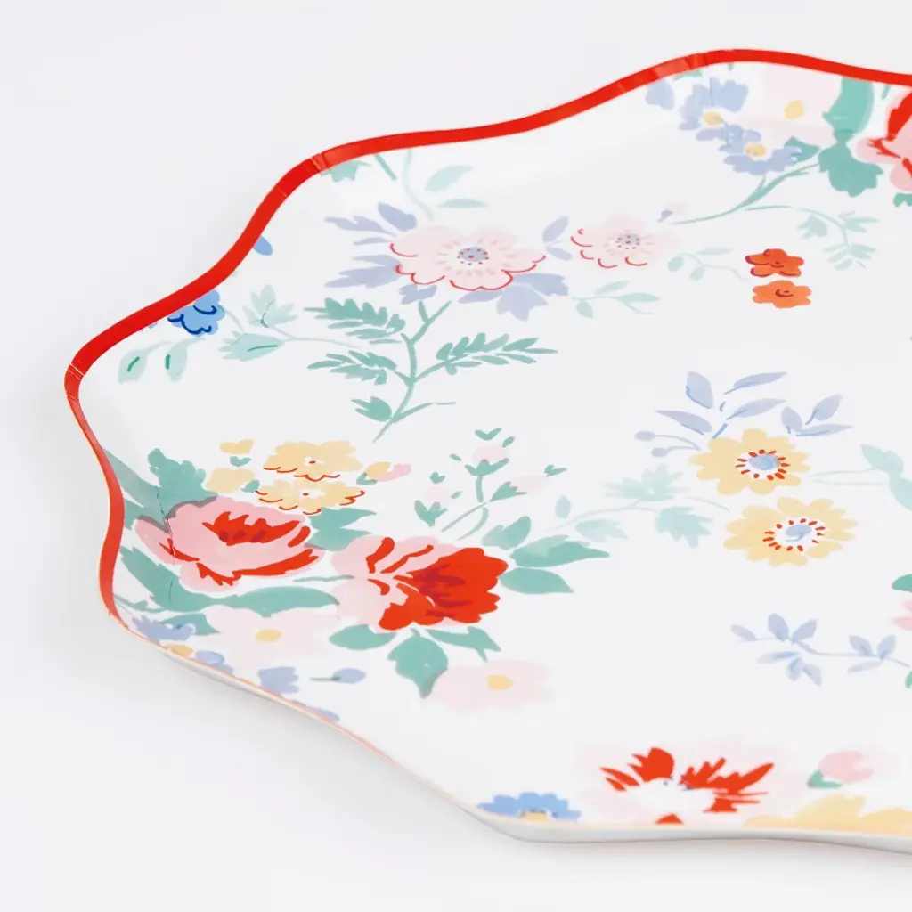 Dainty posy bouquets in soft vintage hues bring effortless charm to these beautifully illustrated side plates. Inspired by timeless floral prints with a fashion-forward twist, each of these paper plates features scattered blooms that feel both nostalgic and fresh. A beautiful wavy red edge adds a bold, stylish detail that frames the florals perfectly. The design is both delicate and distinctive, perfect for those who adore vintage with a modern touch, making them a standout in your floral party decorations.