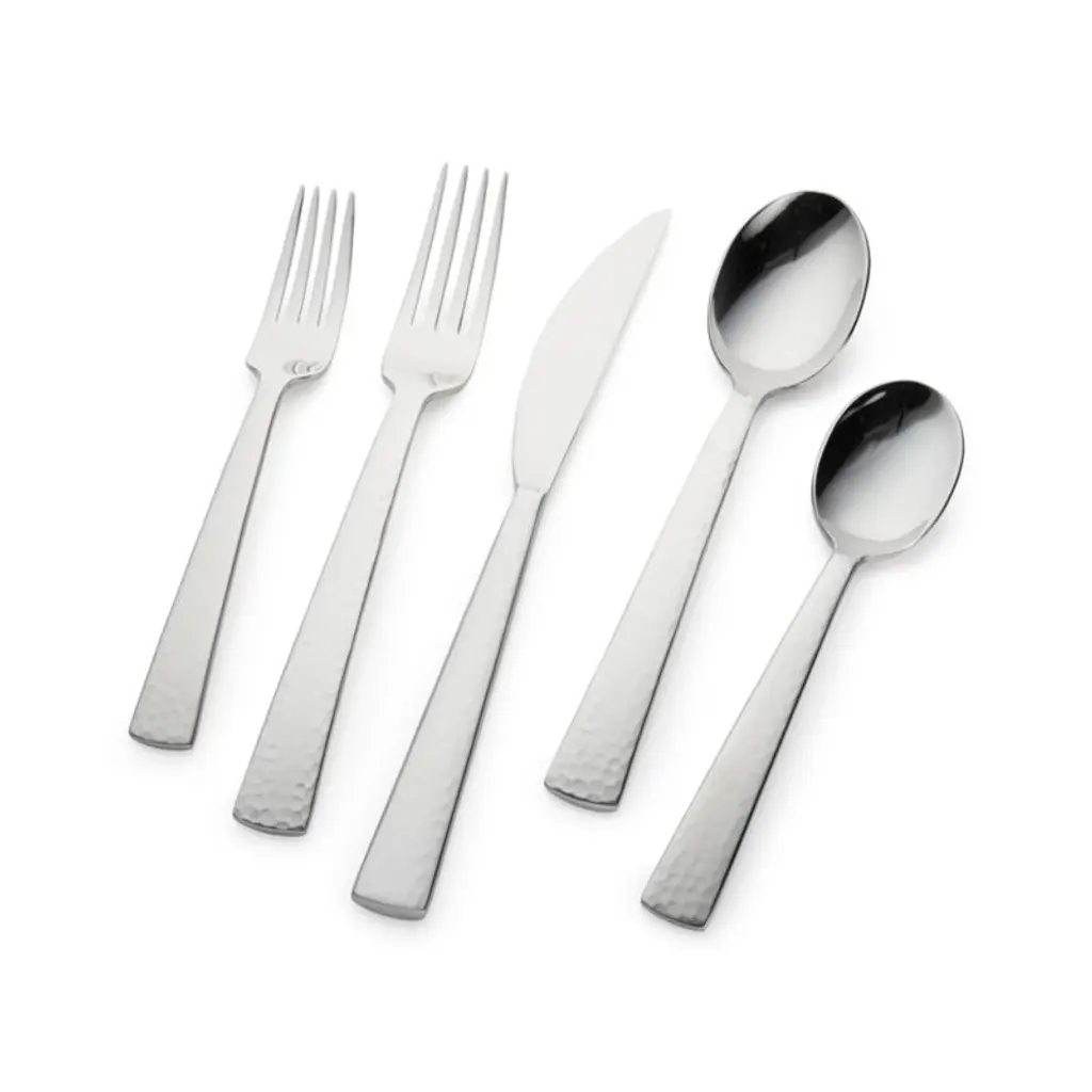 Modern blades, bowls and tines meet the tradition of the hammered finish in a fusion of new and old in this set stainless steel place setting. The hammering and mirror finish create a textural effect of light and shadow. A Crate and Barrel exclusive, this five-piece set includes a salad fork, dinner fork, dinner knife, dinner spoon and tea spoon. For a coordinated table, pair the flatware with our Mesa serving set.