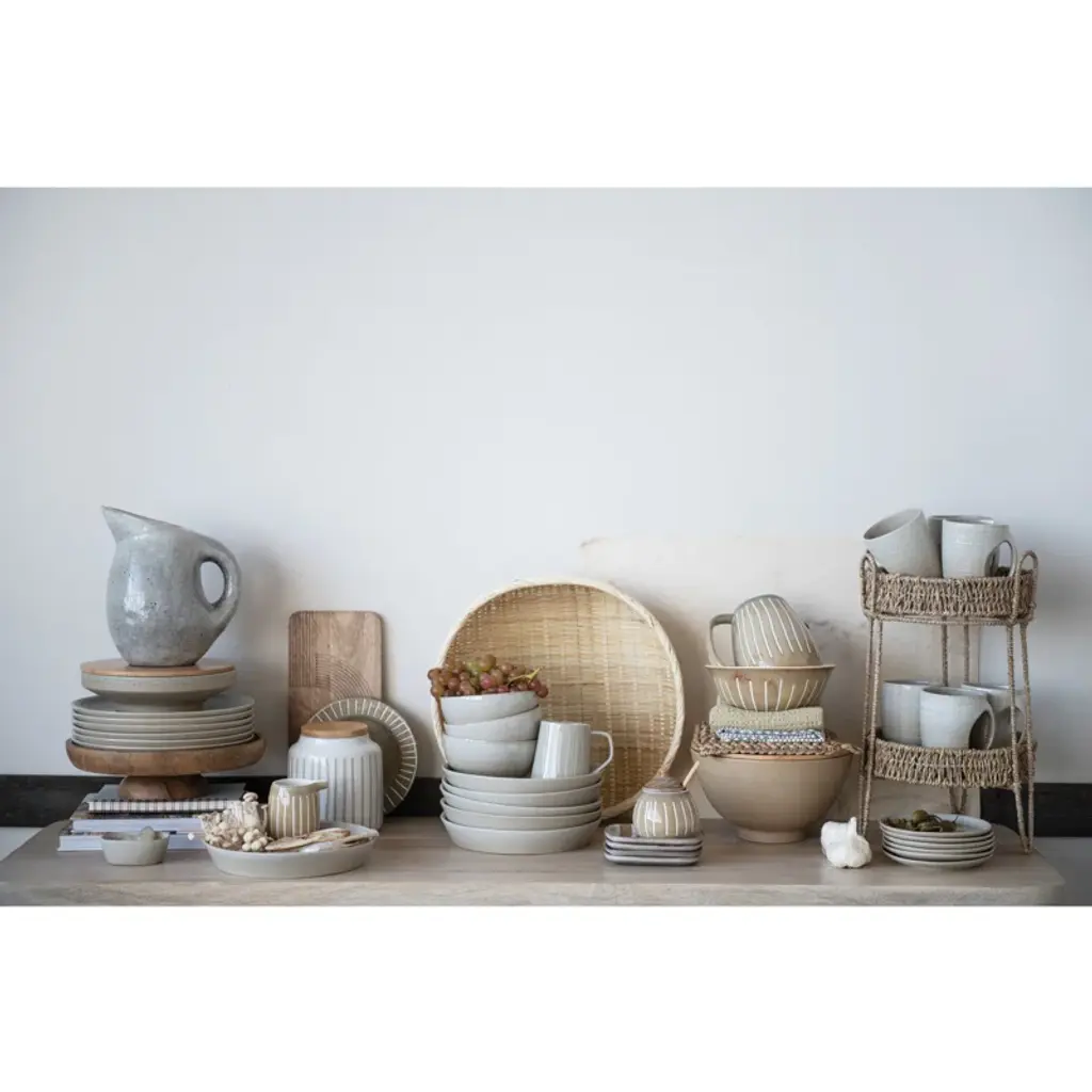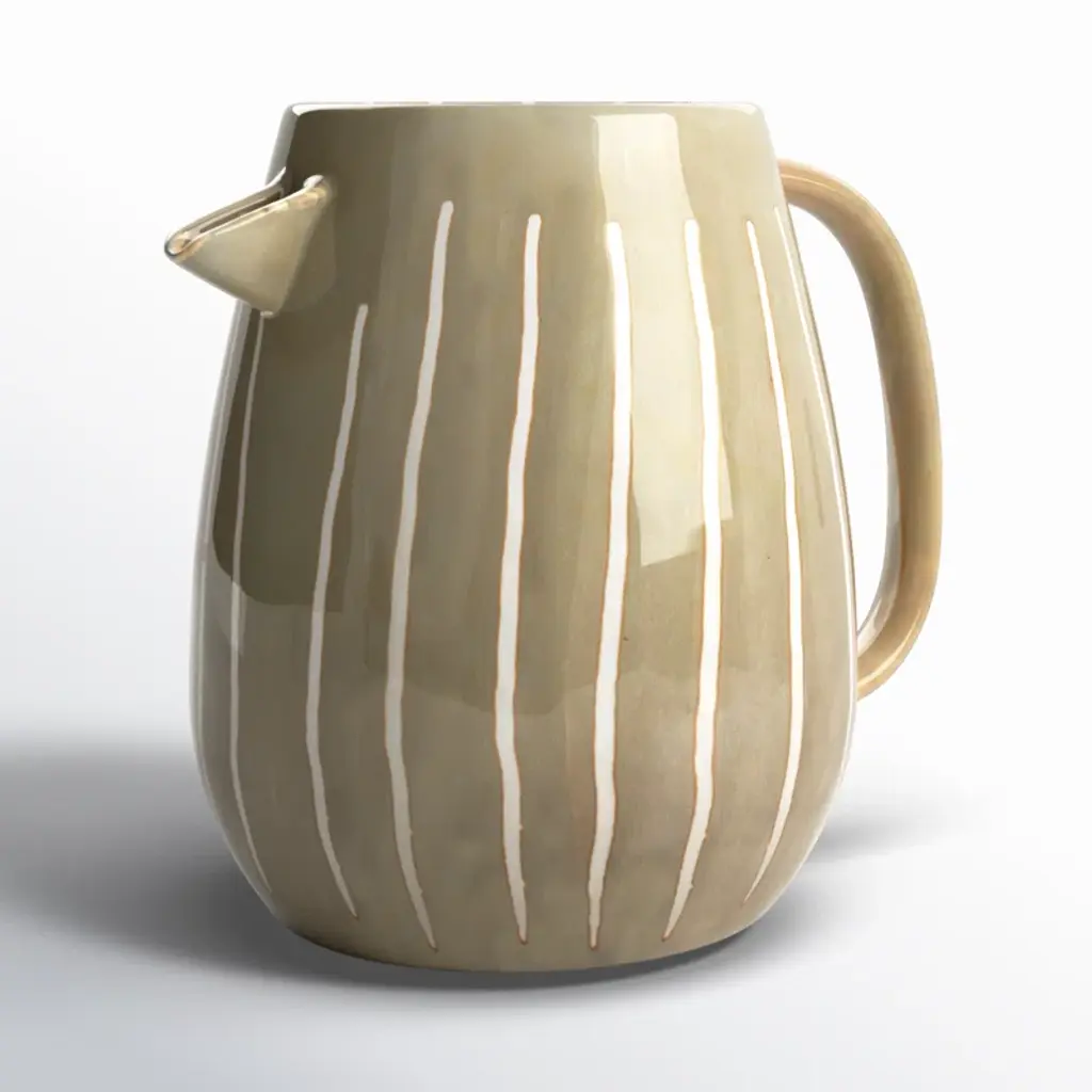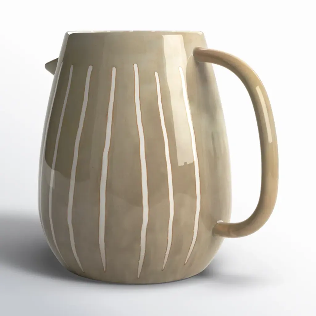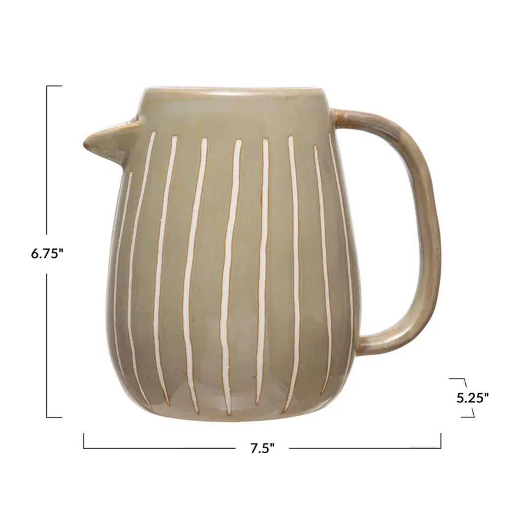 This beautiful stoneware pitcher has both a vintage and timeless feel to it. Its pattern makes it both stand out from normal decor, and fit in seamlessly with other neutral kitchen items. This is perfect for homemade lemonade with kids, or tea with friends.