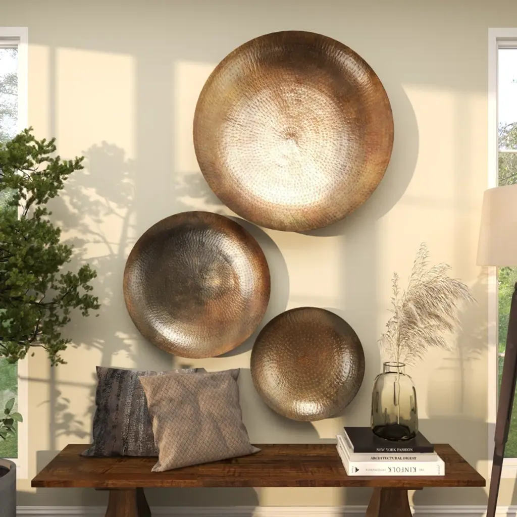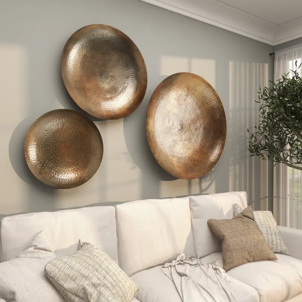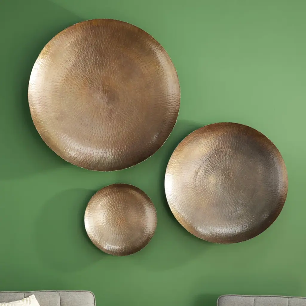 You can hang this plate set of 3 wall sculptures in your living room as an elegant trio or use each plate separately to enhance multiple spaces. This item ships in 1 carton. Display the plates as a wall art set or display them separately. Can be hung vertically using the d-rings; nails and screws not included. Suitable for indoor use only. This item ships fully assembled in one piece. Made in India. This bronze colored iron wall sculptures comes as a set of 3. Glam style.
