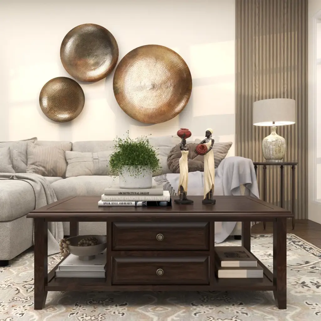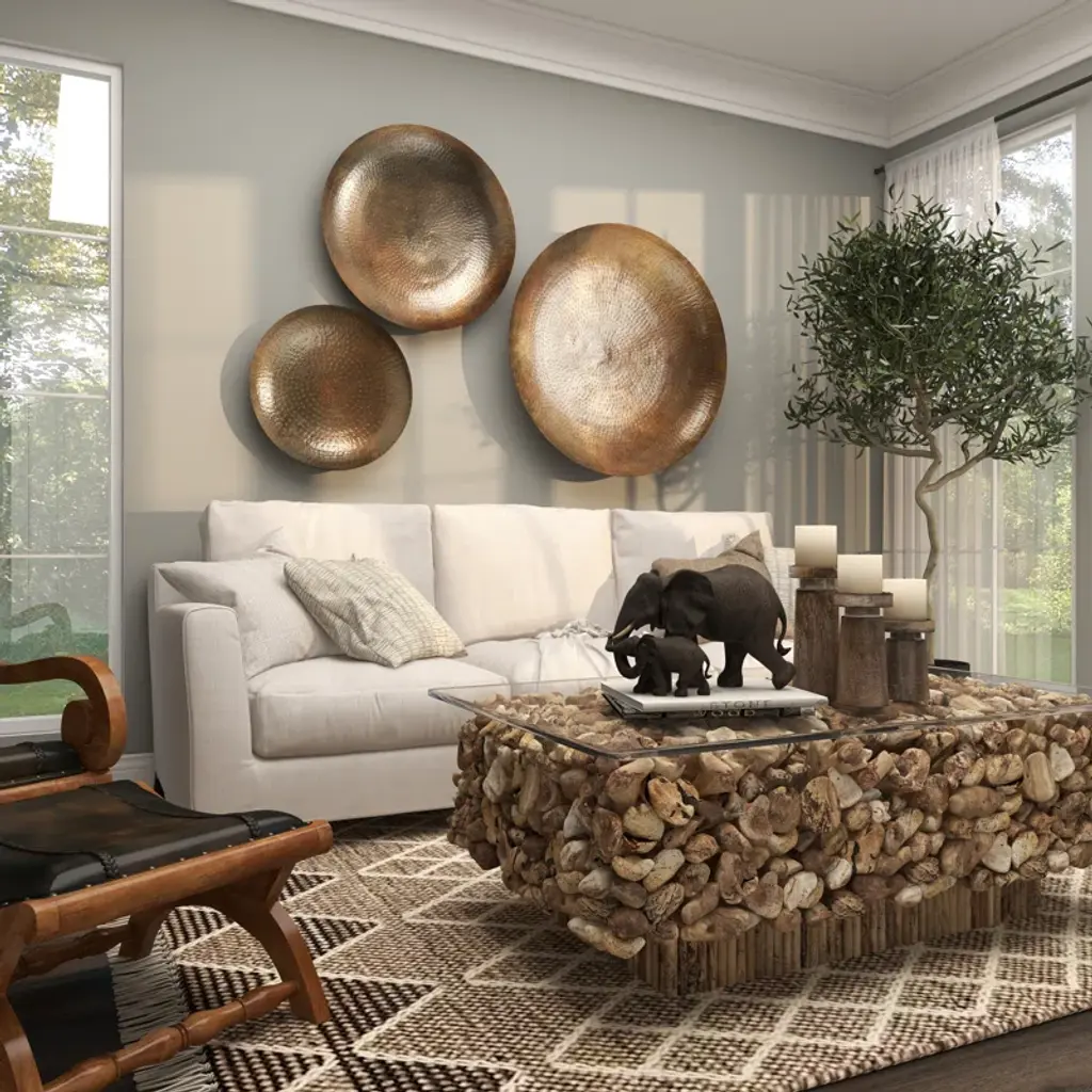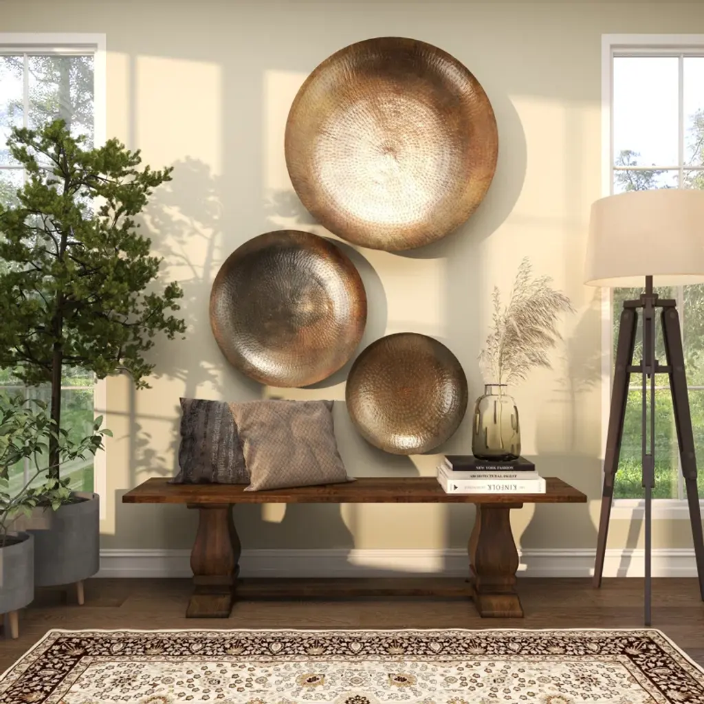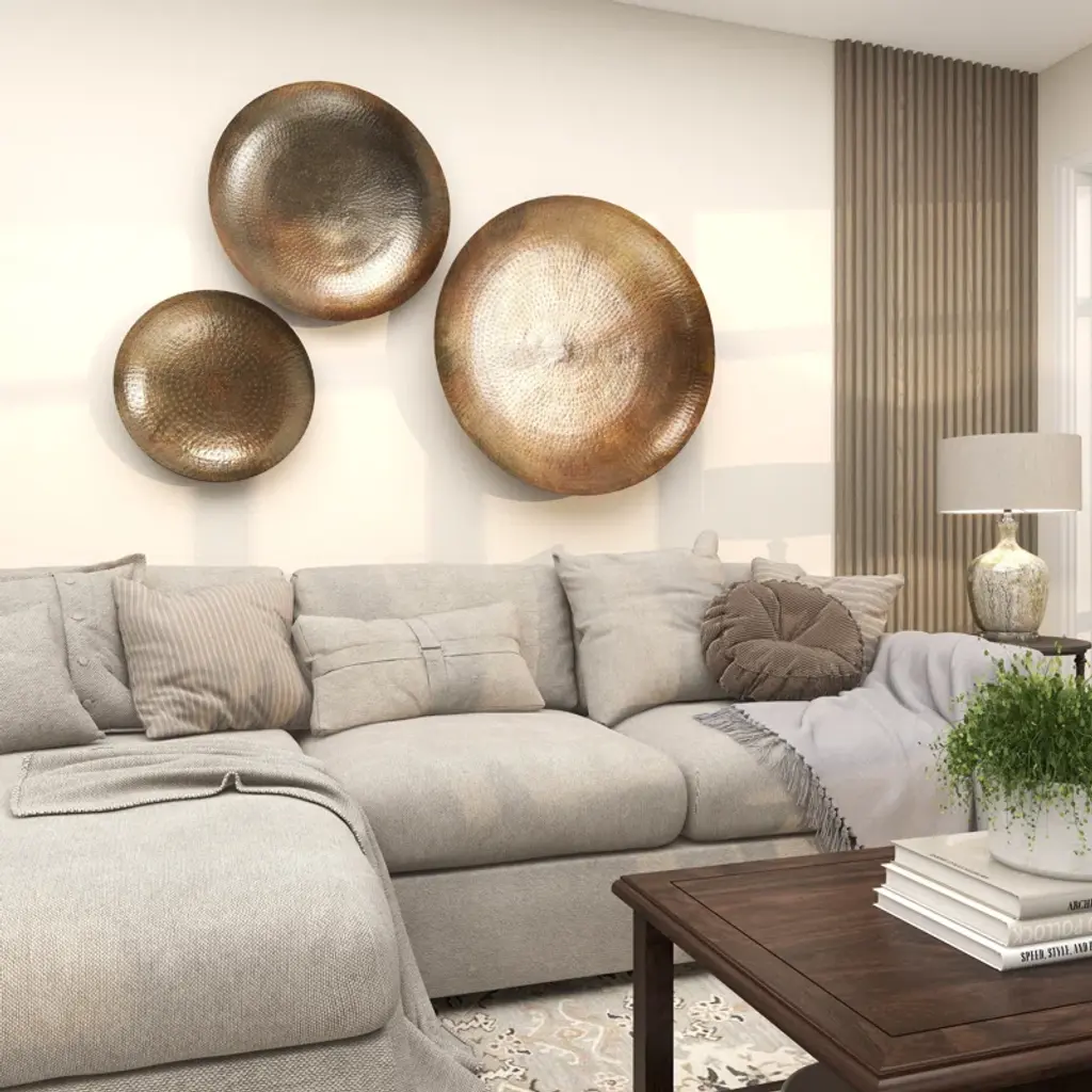 You can hang this plate set of 3 wall sculptures in your living room as an elegant trio or use each plate separately to enhance multiple spaces. This item ships in 1 carton. Display the plates as a wall art set or display them separately. Can be hung vertically using the d-rings; nails and screws not included. Suitable for indoor use only. This item ships fully assembled in one piece. Made in India. This bronze colored iron wall sculptures comes as a set of 3. Glam style.