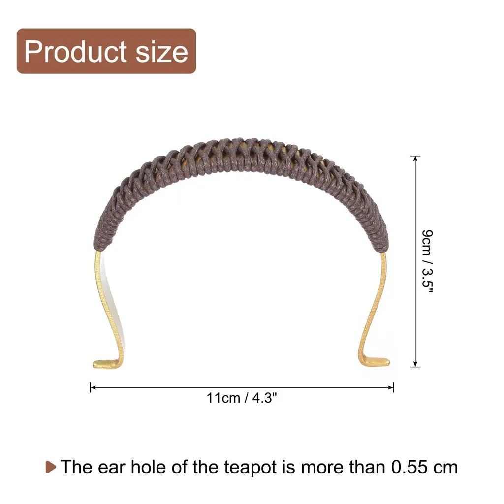 Description:Durable Construction: The teapot handle is made from durable iron and rope woven materials, and has a baked enamel finish with a copper-colored texture that feels comfortable in hand, resists wear and tear, providing long-lasting service.U-Shape Design: The U-shape handle design allows for a comfortable and secure grip, simple but practical, making it easier to pour without slipping even on a wet hand, great as a replacement for broken or damaged teapot handles.Easy Installation: Attach the handle to the teapot's body using the external buckle hooks, and ensure it is securely fastened to prevent any leaks while pouring, please measure the relevant dimensions before purchasing.Versatile Use: Great for use in homes, tea ceremonies, cafes, and restaurants where tea is served to customers, suitable for ceramic pottery teapots, kettles, and more.Specification:Material: IronColor: Gold/BrownFinish Type: Baking PaintTotal Size: 11 x 18 x 9 cm/4.3 x 7.1 x 3.5 inch (L*W*H)Applicable Span Spacing: 9 - 11 cm / 3.5 - 4.5 inchPackage Included: 1 pc x Tea Pot Handle