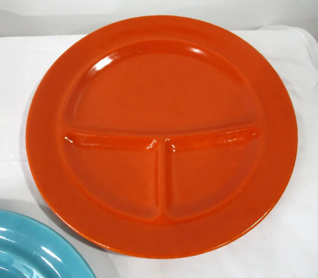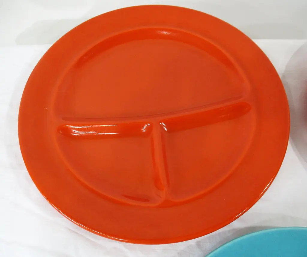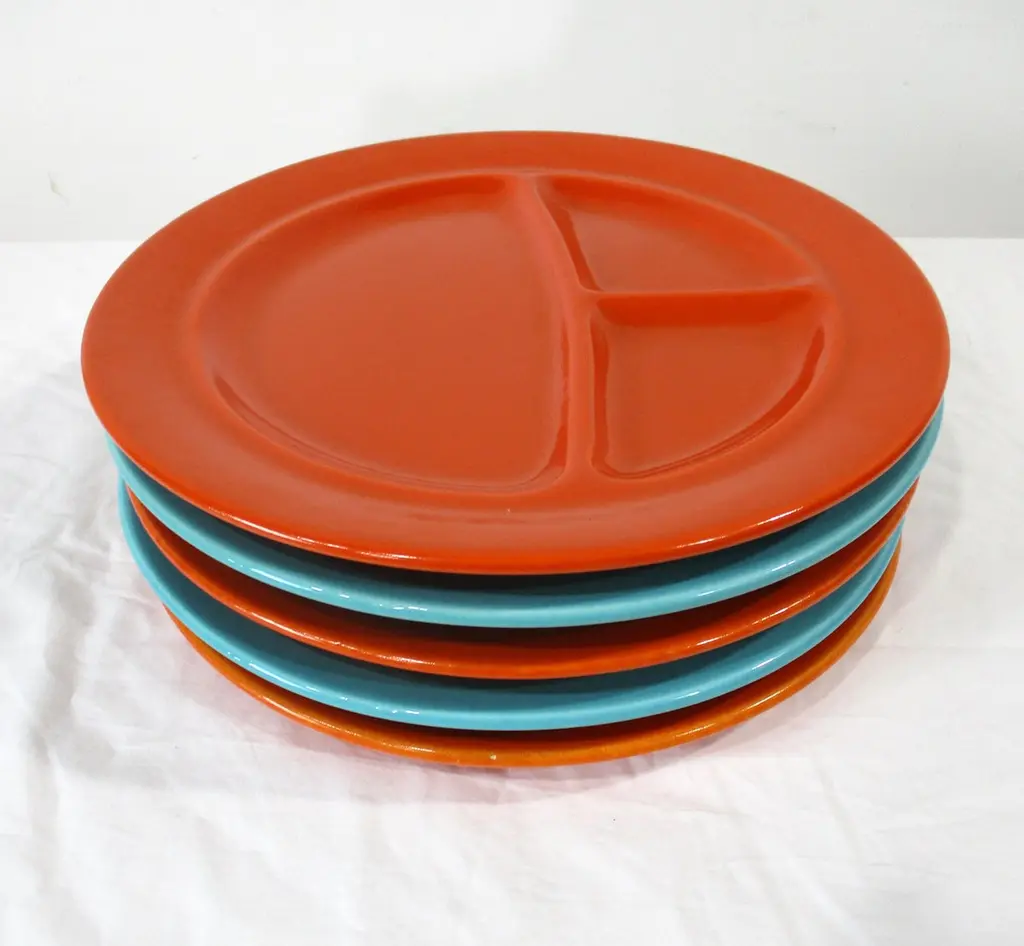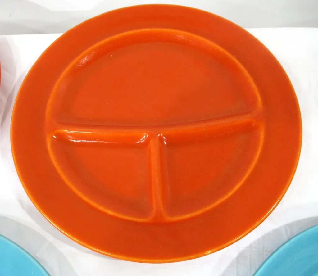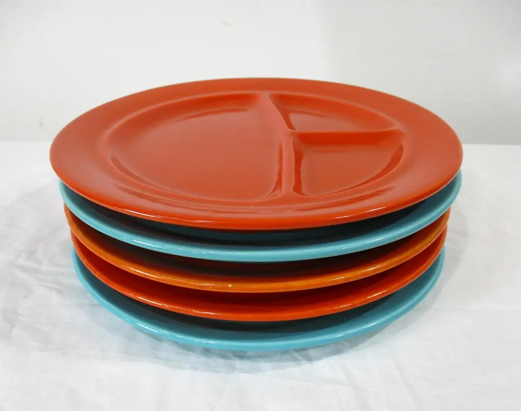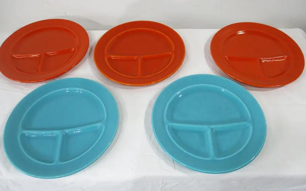 A set of five divided or grill dinner pottery plates , two in blue and three in a bright orange . Coined California Pottery because of the style and manufactured in the state by the Metlox Pottery company . One plate is an early production piece which is heavier that the others but matching in form . Sometimes called a meat and two since you would serve a protein in the large space and other items in the smaller . Retains the cast slip manufactures company marks to each plate , these are not recommended for your dish washer .