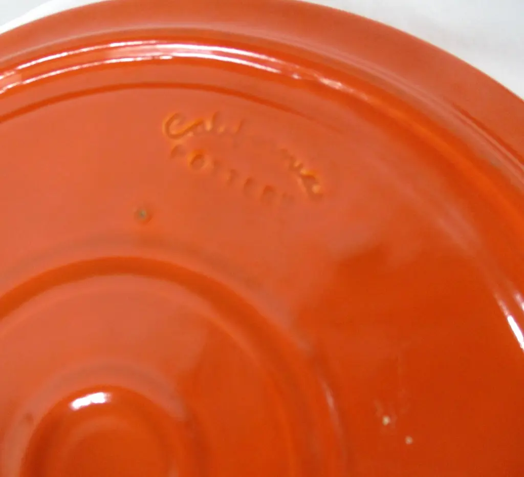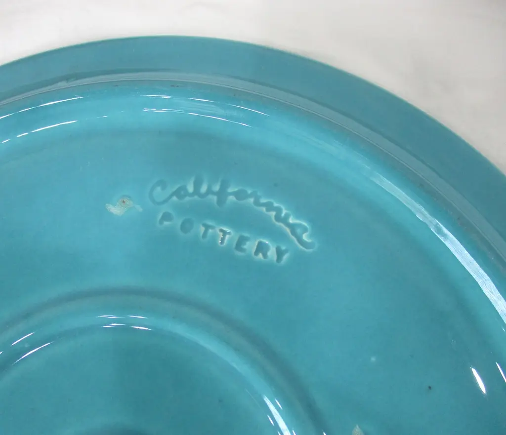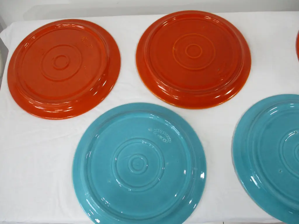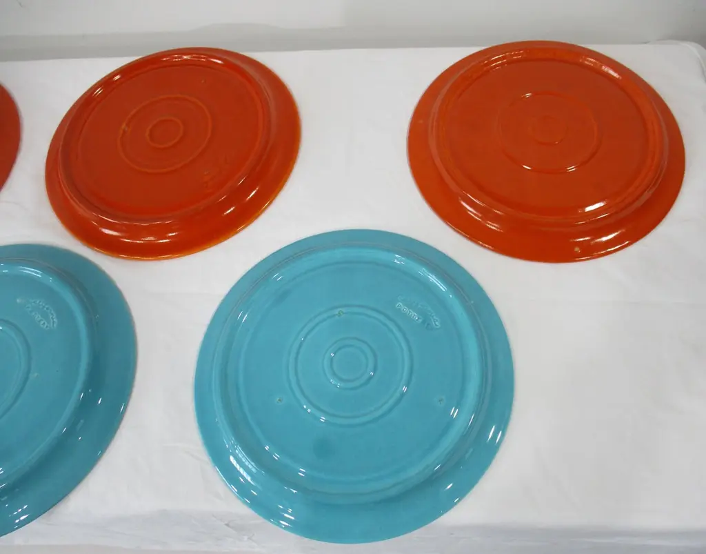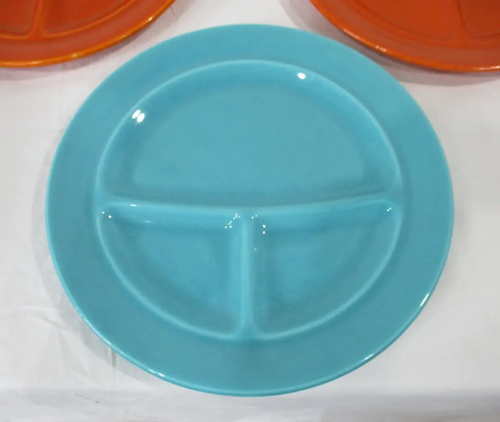 A set of five divided or grill dinner pottery plates , two in blue and three in a bright orange . Coined California Pottery because of the style and manufactured in the state by the Metlox Pottery company . One plate is an early production piece which is heavier that the others but matching in form . Sometimes called a meat and two since you would serve a protein in the large space and other items in the smaller . Retains the cast slip manufactures company marks to each plate , these are not recommended for your dish washer .