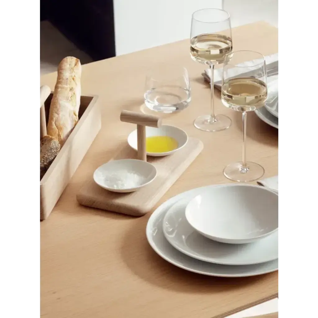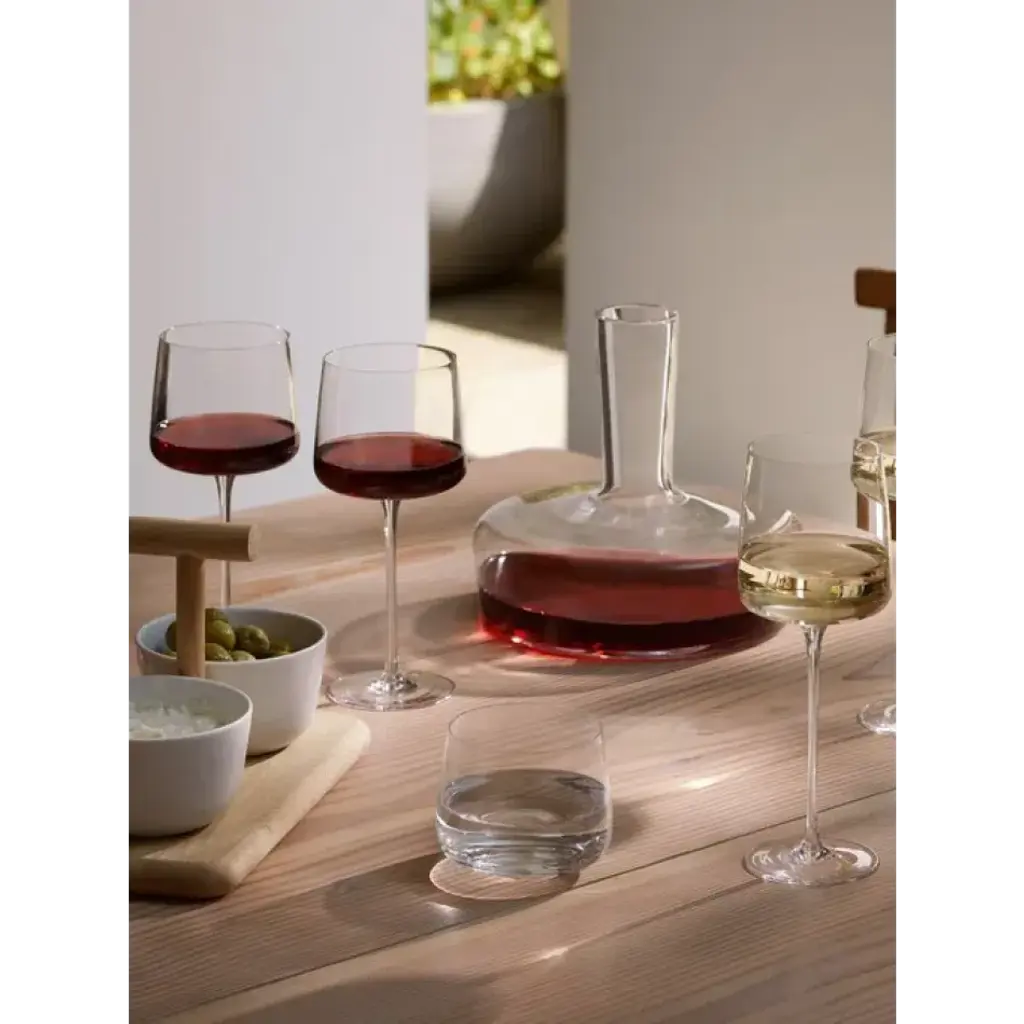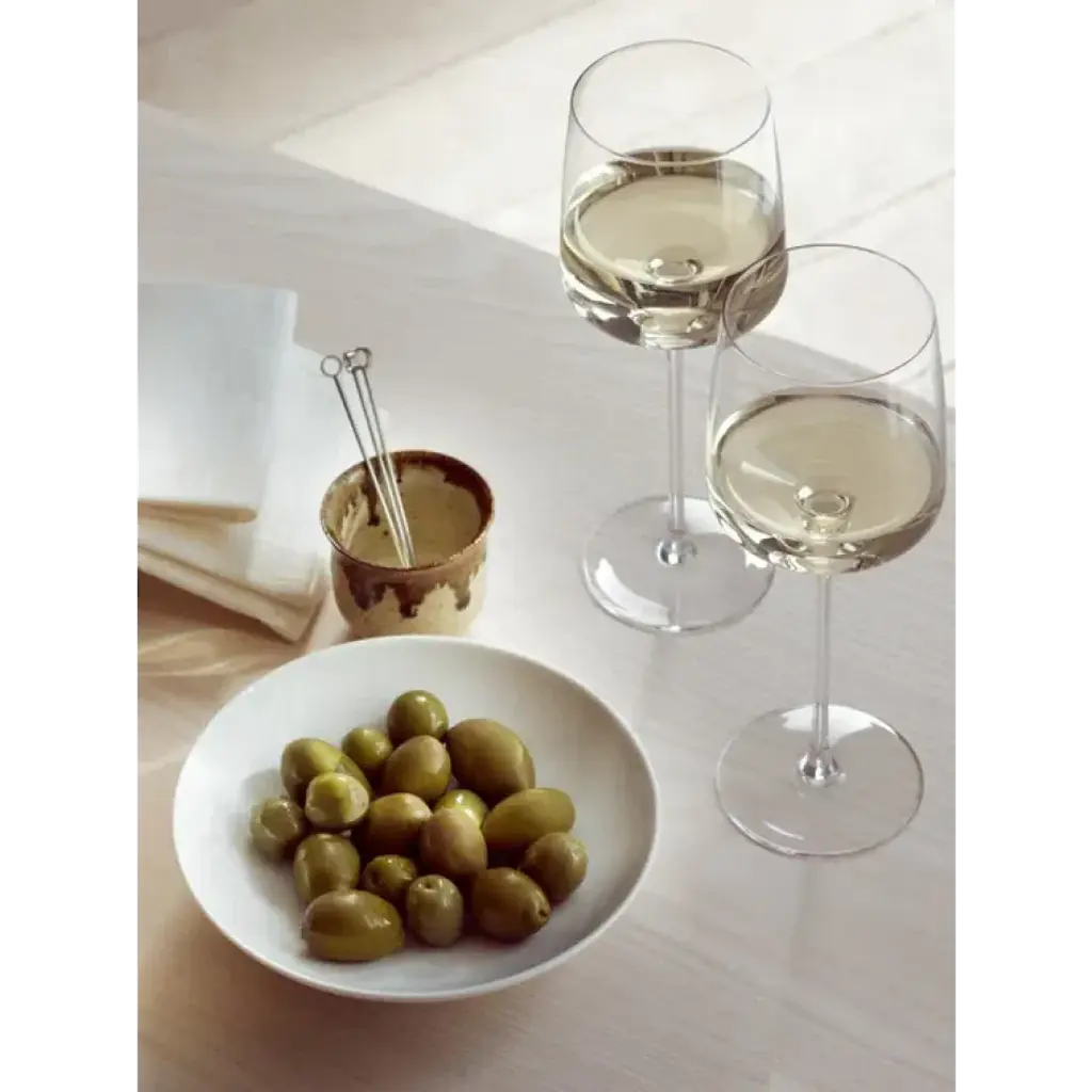 Contemporary white wine glasses with angular bowls, tall stems and fine rims.
