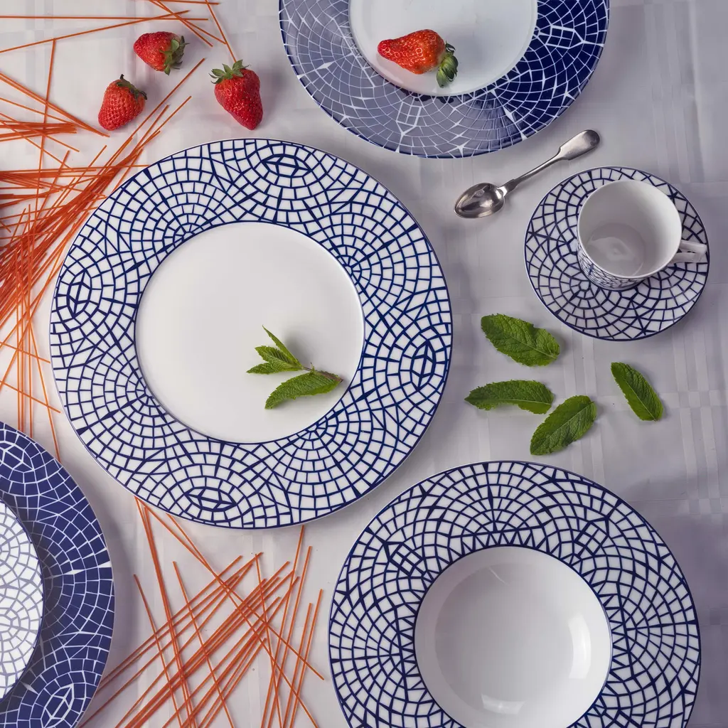 Set up a captivating dining room table for your guests with the Mia Light collection. Designed by Patrick Knoch, architect, designer, and founder of Extranorm, this tableware range offers a fresh take on the traditional blue on white decorative patterns. The abstract pattern creates symmetrical lines on the porcelain, with a striking visual effect. Like other Extranorm products, this collection is manufactured with care in Limoges, France. The complete line includes everything from dinner plates and soup plates to bowls and teacups with saucers. A darker version of the Mia design is also available.