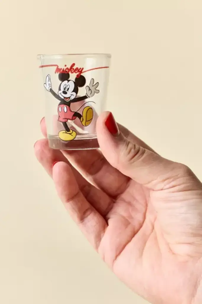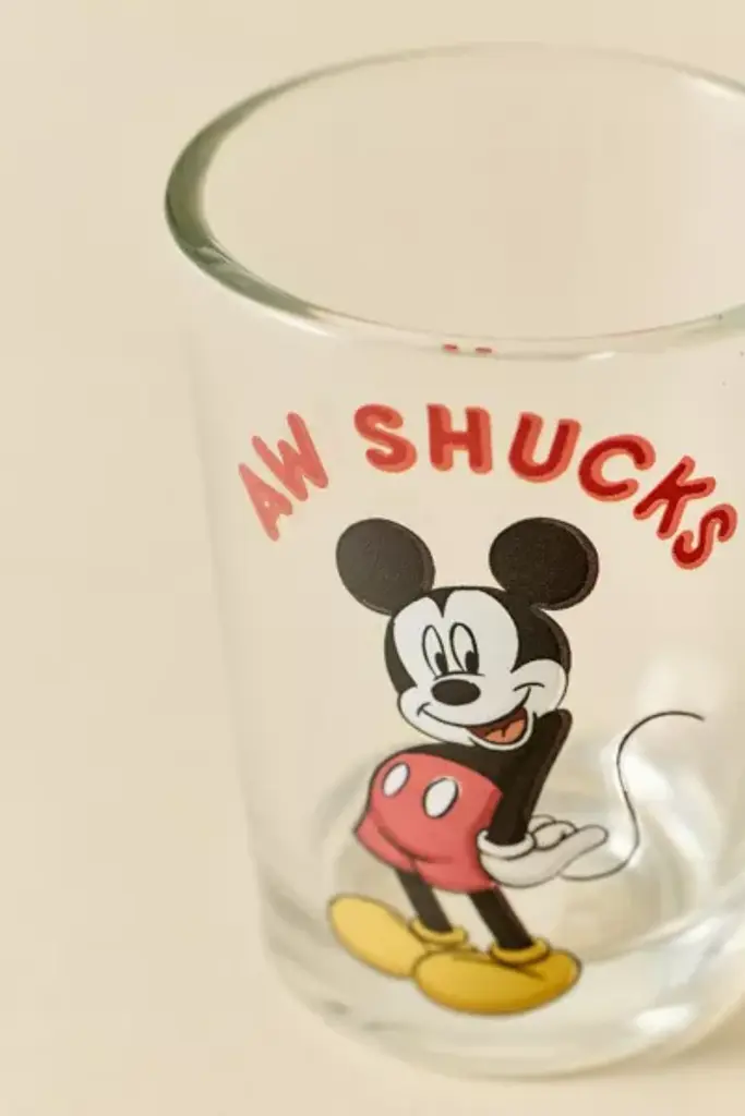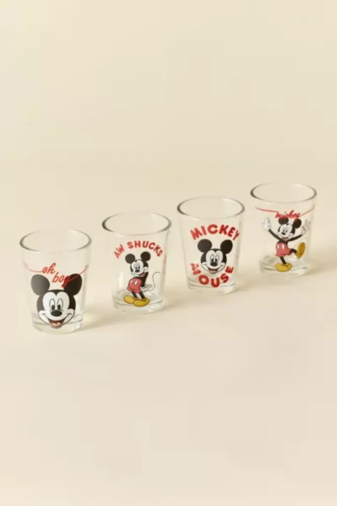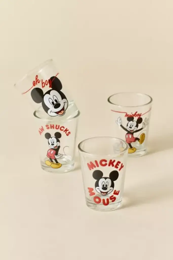Add vintage appeal to your bar cart with these mini shot glasses featuring retro Mickey Mouse graphics printed at the front of each glass. **Features** \- Mickey Mouse Mini Shot Glasses \- Four shot glasses with vintage-inspired Mickey Mouse graphics \- Perfect for gifting & collecting **Content + Care** \- Includes 4 shot glasses \- Glass \- Food safe \- Hand wash \- Not dishwasher, microwave or oven safe \- Imported **Size** \- Ounce capacity: 1.5 oz each \- Dimensions: 2.5"l x 2.25"w