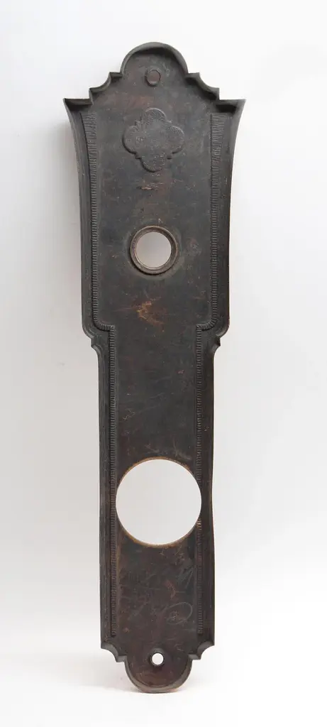 Antique Art Deco back plate made of brass with a thumb turn cut out. The original mounting screws are not available. Good condition with surface wear from prior use. Priced each. The manufacturer and exact date of creation are unknown. The dimensions are 9.25 in. H x 2.75 in. W x 0.5 in. D, collar 0.75 in. diameter, drop 3.75 in., lock hole 0.75 in. diameter.