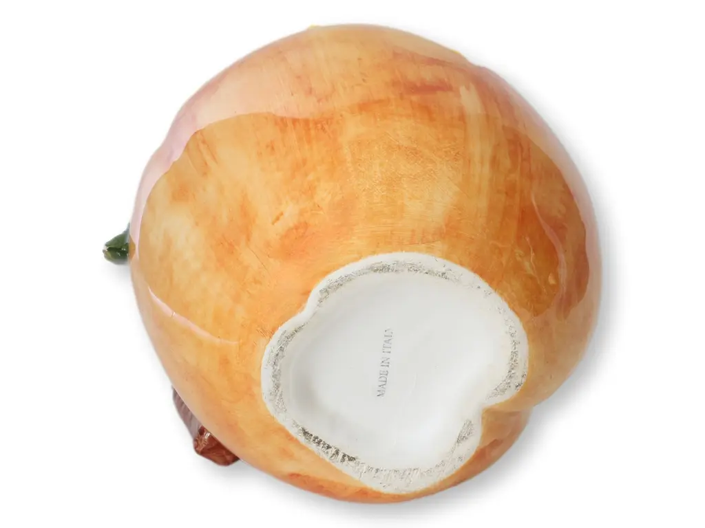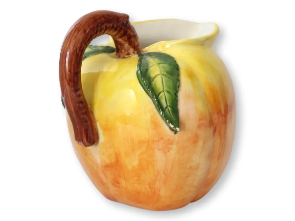 Midcentury Italian ceramic pitcher designed in the shape of a vibrant peach, featuring hand-painted details and a leaf-adorned handle. This charming piece captures the essence of Italian craftsmanship with its lifelike colors and organic form, making it a delightful addition to any kitchen or dining collection. Glazed interior making it usable for serving liquids.Made in Italy on bottom.