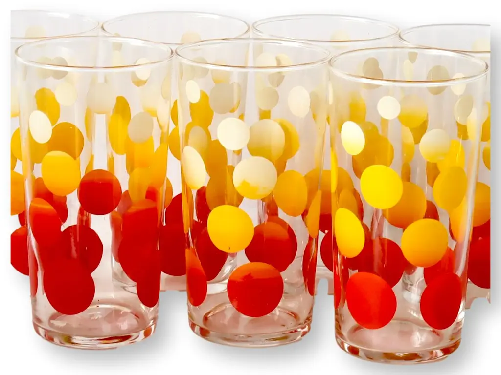 Dive into the vibrant 1970s with this set of 7 Dominion tumblers, boasting a captivating ombre of oranges, yellows, and reds. These glasses feature playful polka dots, delivering a charming retro touch to your table setting. They promise durability, preserving their nostalgic appeal for years. This set makes a perfect statement piece for any midcentury or modern decor. Hand-wash, with a soft cloth to avoid damage to ombre. Unsigned.