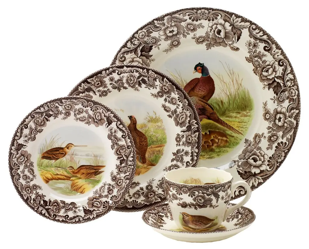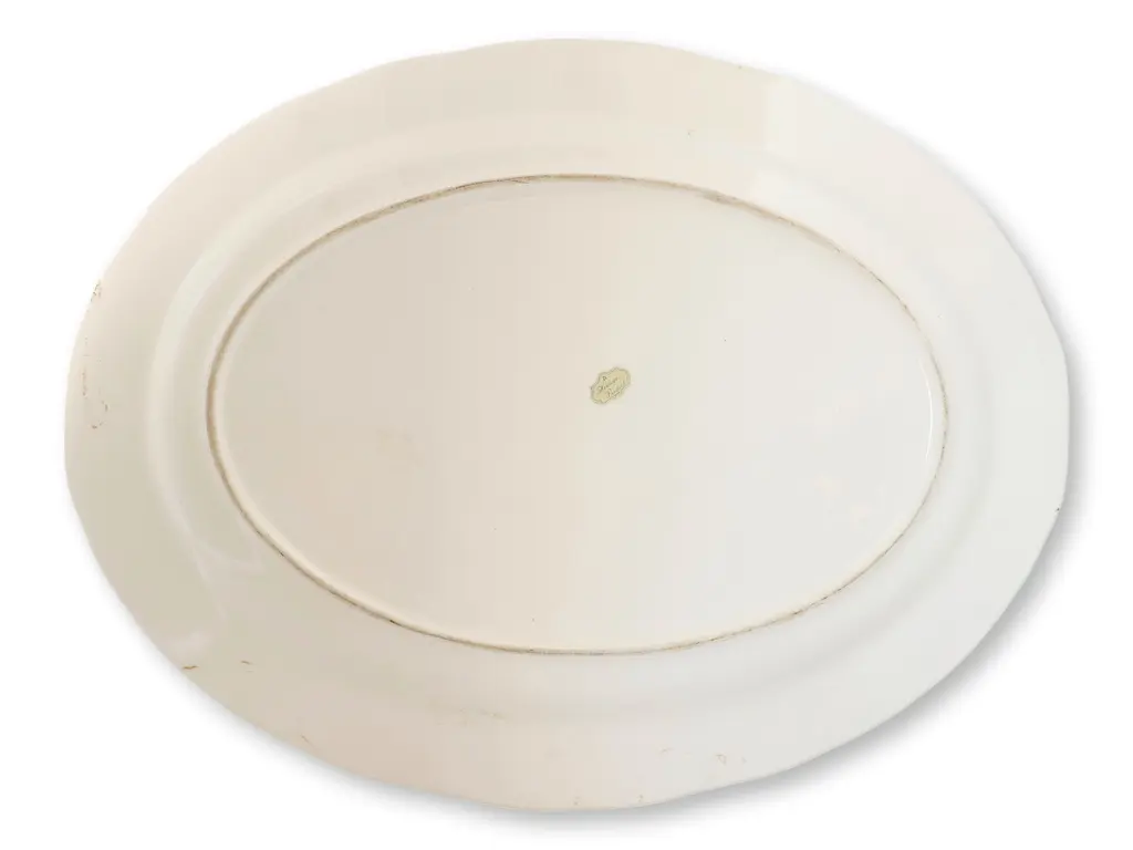 This midcentury pheasant game platter showcases a vibrant hand-painted scene of a pheasant in flight against a rustic countryside backdrop. The detailed border, adorned with fruits and foliage, adds charm and character to this piece. Perfect for serving or display, this platter captures the spirit of midcentury design and would make a stunning addition to any dining or decor collection. Original sticker on back.