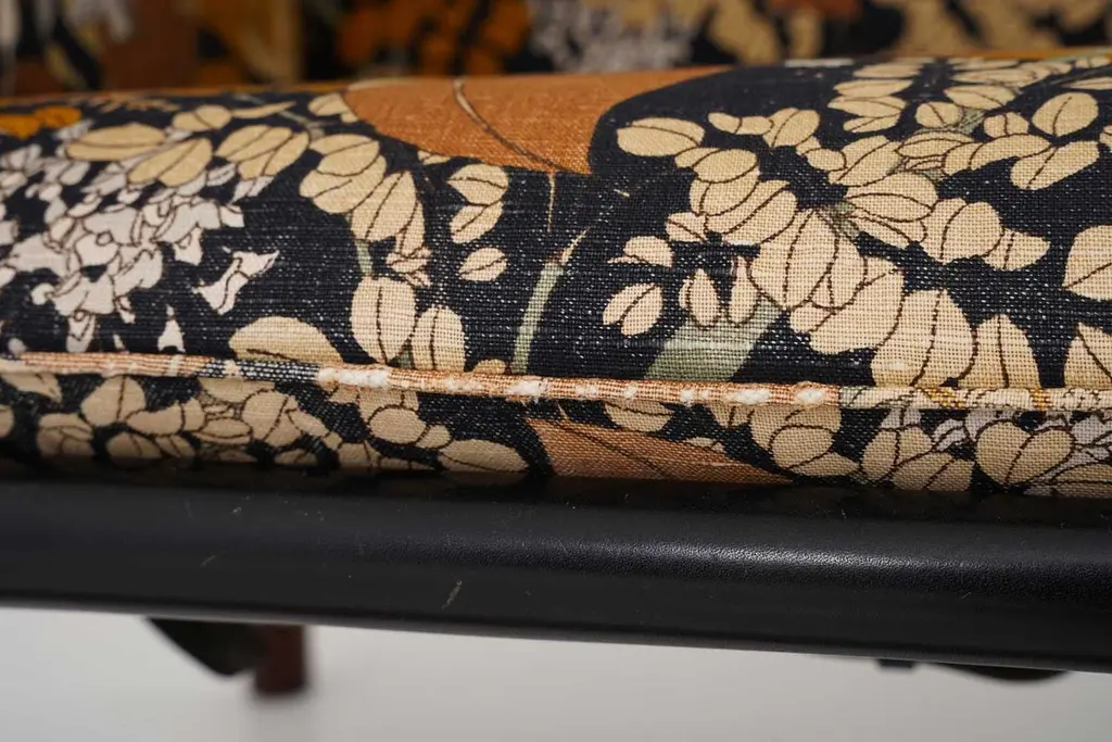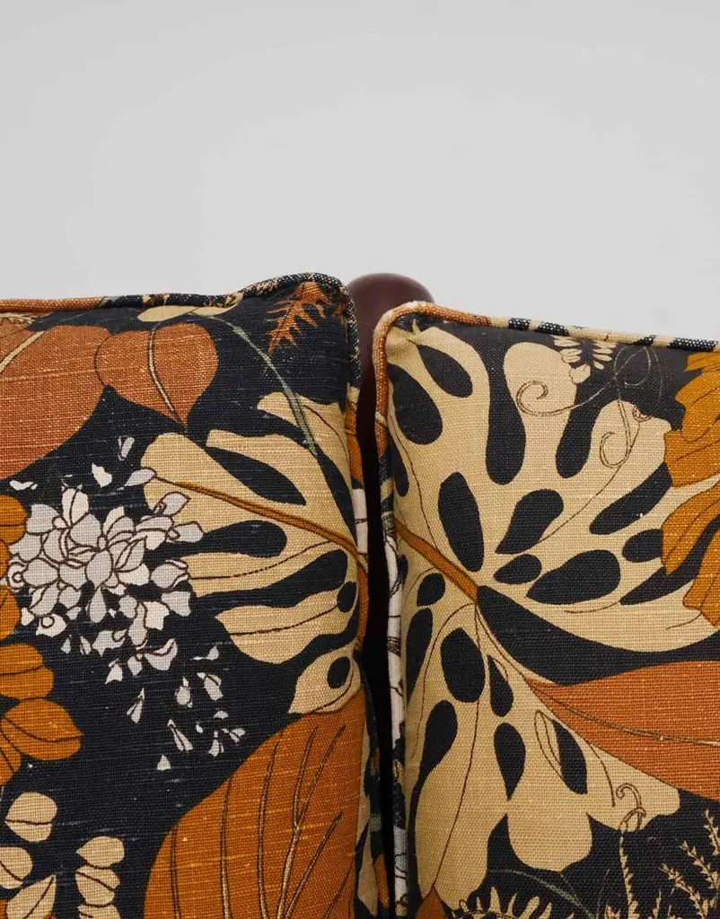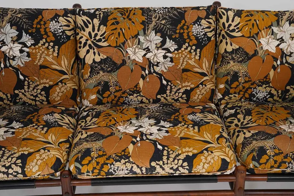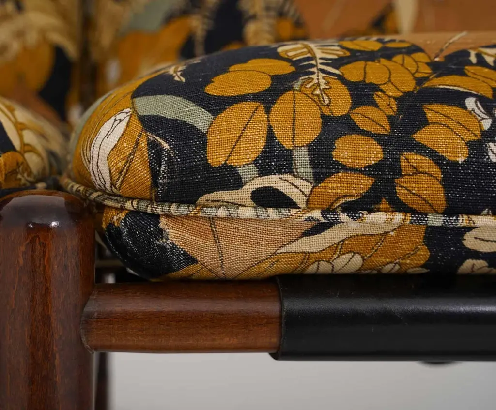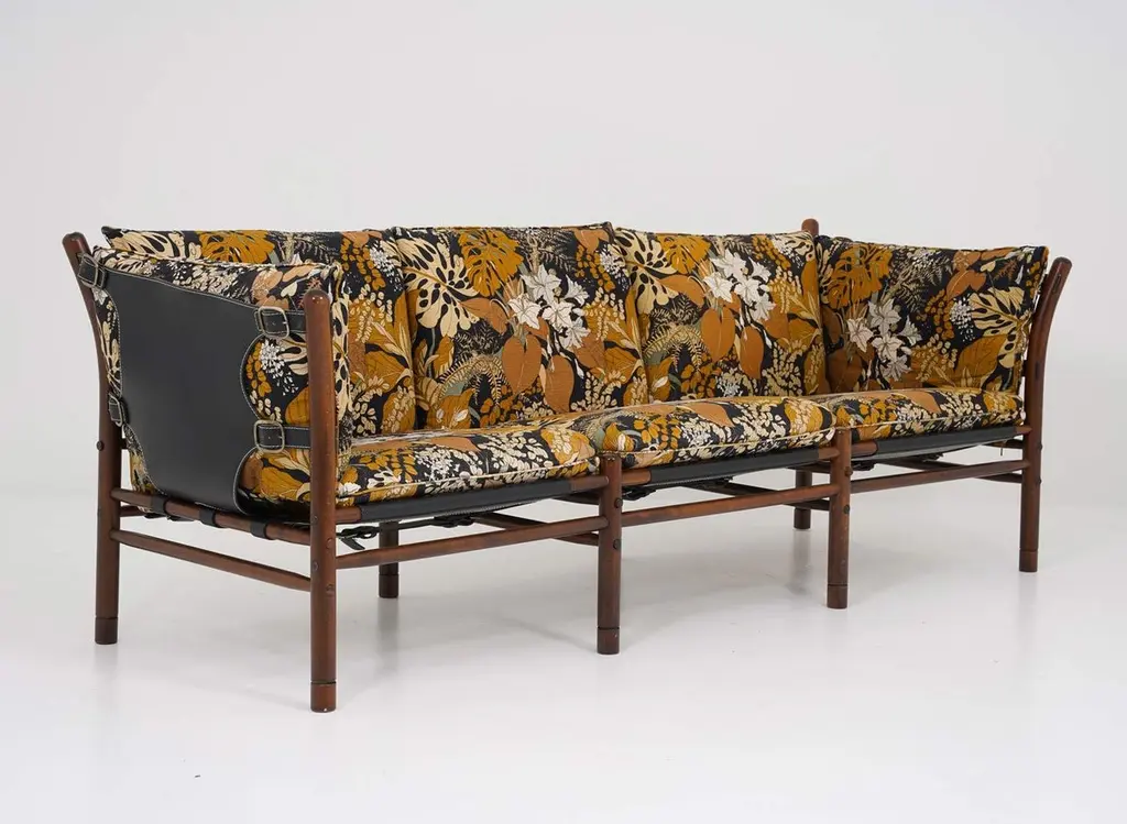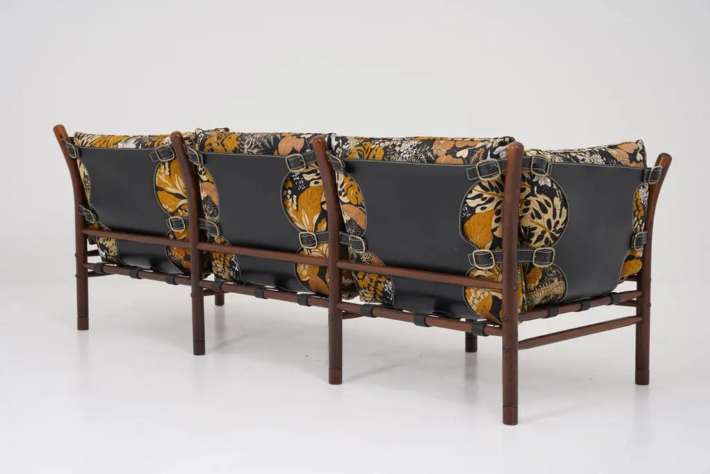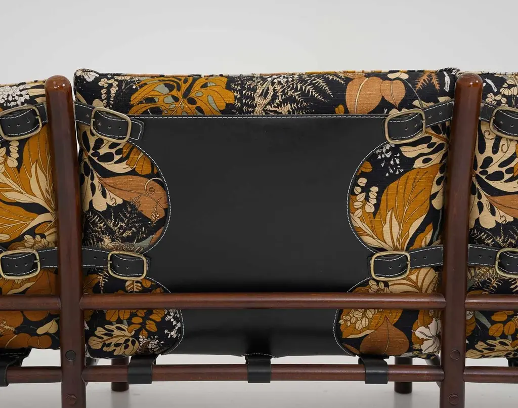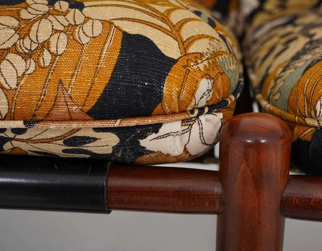 This striking "Ilona" sofa was designed by renowned Swedish designer Arne Norell and produced during the 1970s. Constructed from stained beech wood, the frame features Norell’s hallmark craftsmanship: a visible construction with strong, rounded joints and a suspended back in black leather, secured with decorative buckles — both functional and ornamental.The original cushions are upholstered in a vibrant, botanical-patterned fabric that reflects the bold aesthetic of the era, offering a rich contrast to the natural tones of the wood and leather. Generously proportioned and visually expressive, the Ilona sofa embodies the best of Scandinavian modernism — a balance of structure, comfort, and character.Two sofas are availableCondition: The cushions are in good condition considering its age, but shows some wear on the edges, shown in pictures. The frame remains in very good condition.The sofa will be delivered disassembled for safer and cheaper shipping.