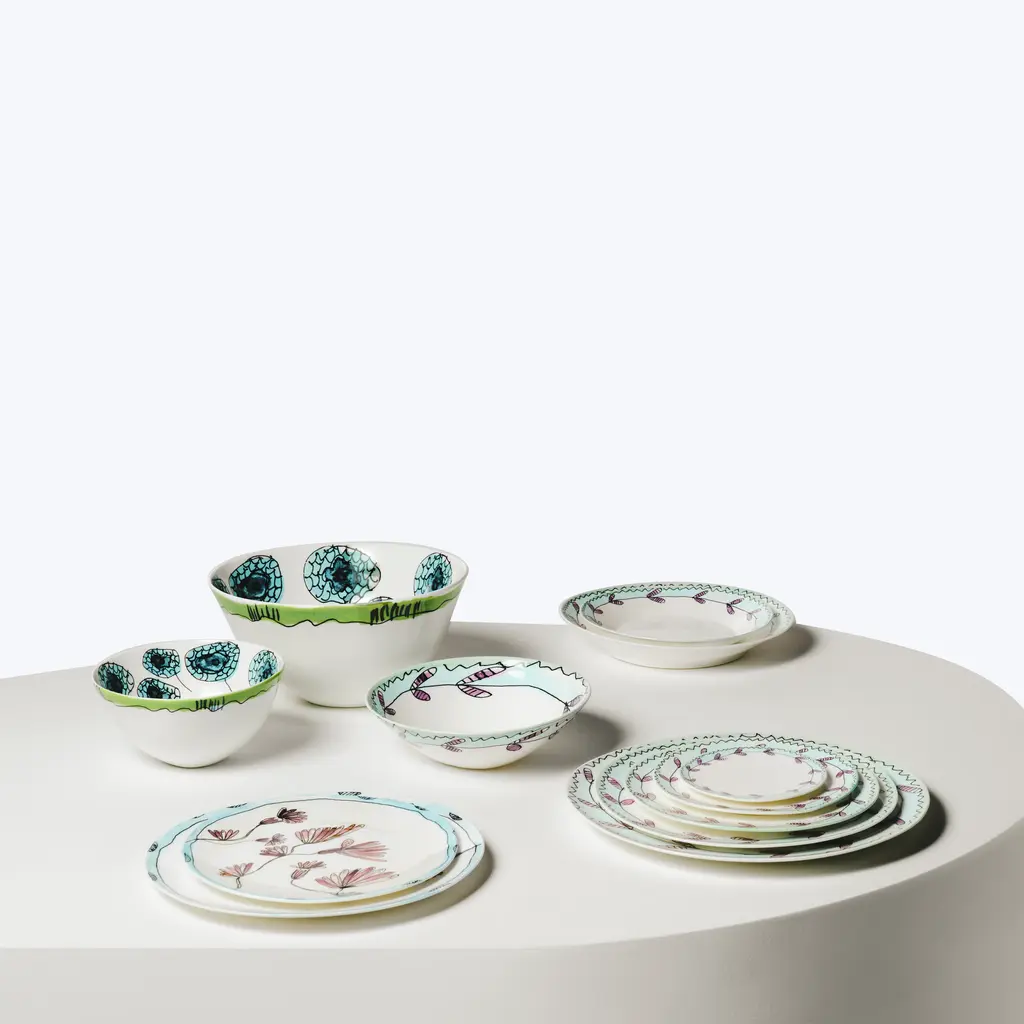 Serax + Marni is an elegant porcelain tableware set that celebrates the Italian fashion house’s artistic vision. Marni’s Creative Director Francesco Risso designed the flower motif, which is inspired by nature and playful blossoms. Decals are used to apply the pattern to the fine bone china, after which it is glazed to make it more wear resistant. The slightly asymmetrical shapes of the plates, bowls, cups, saucers, and tea pots only serve to accentuate the hand-finished porcelain’s quality.Recognized for their artistic, color-savvy, and full of life brand, Marni melds out of the box designs with luxury sentiments for a well-balanced tabletop. This collection of floral dinnerware is a celebration of individuality and quirky elegance for the avant-garde home.
