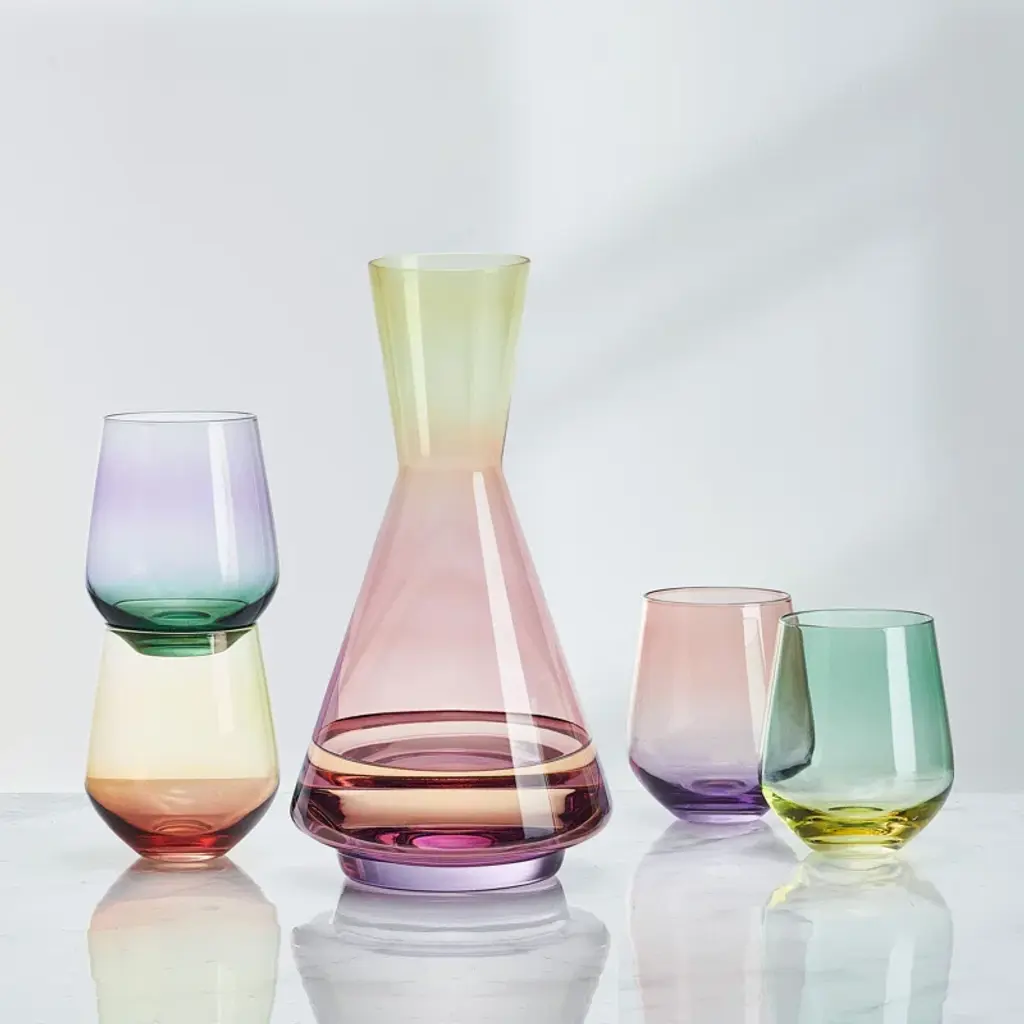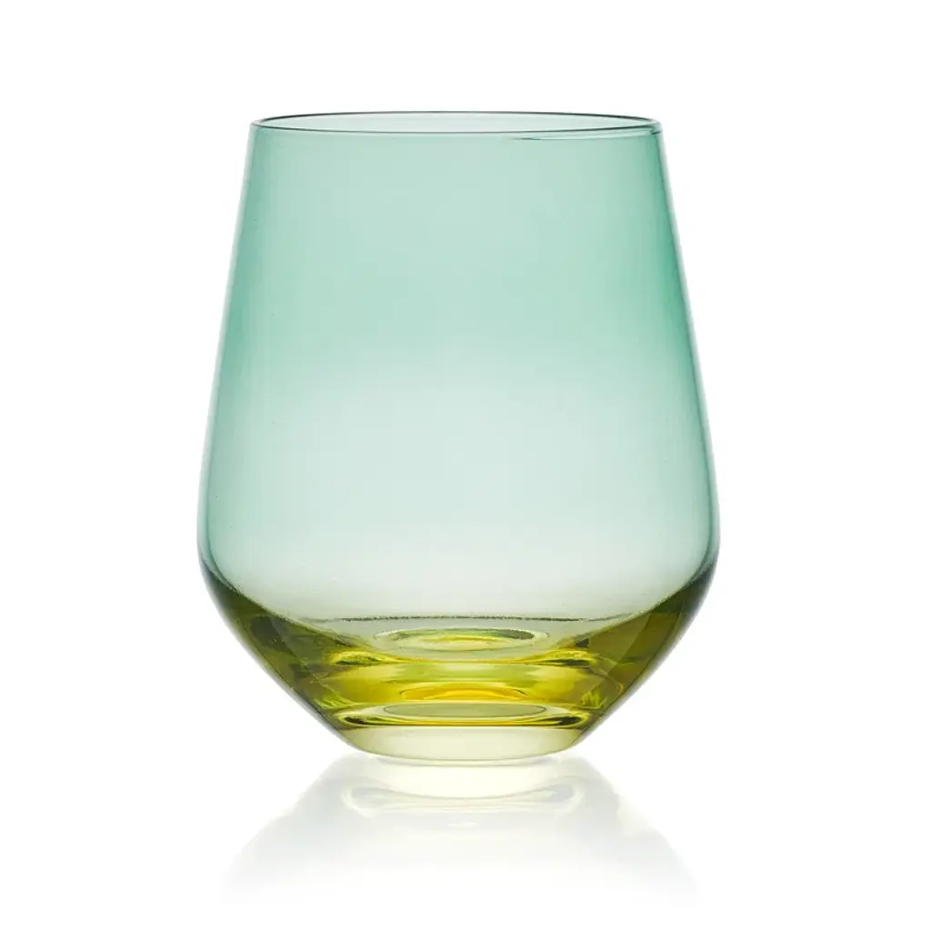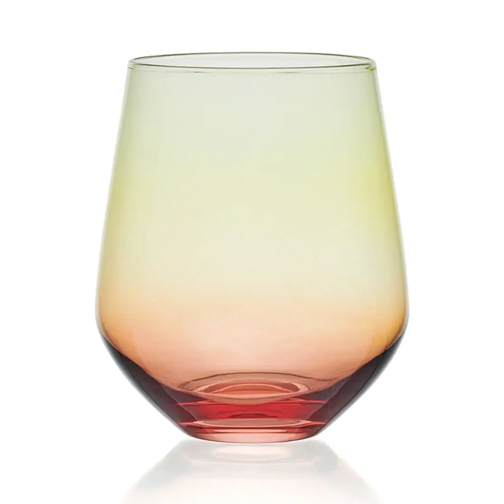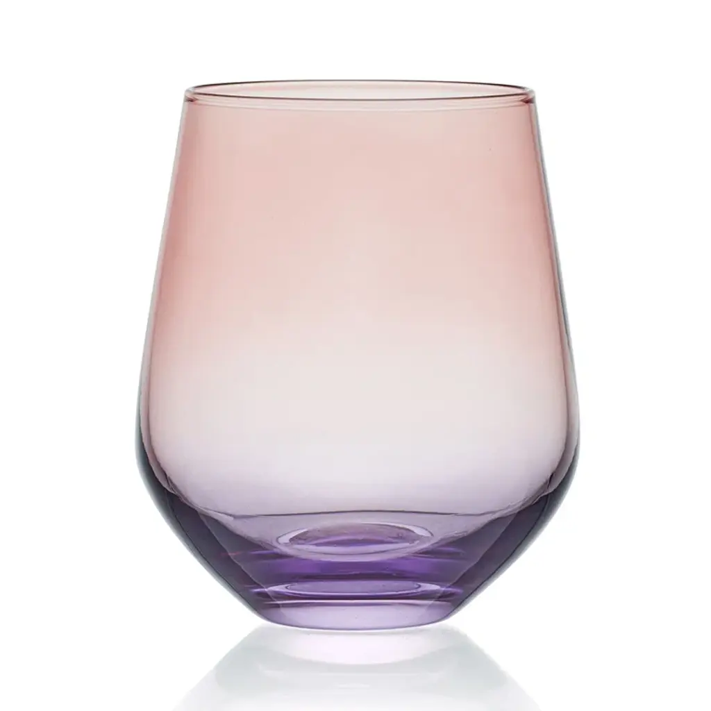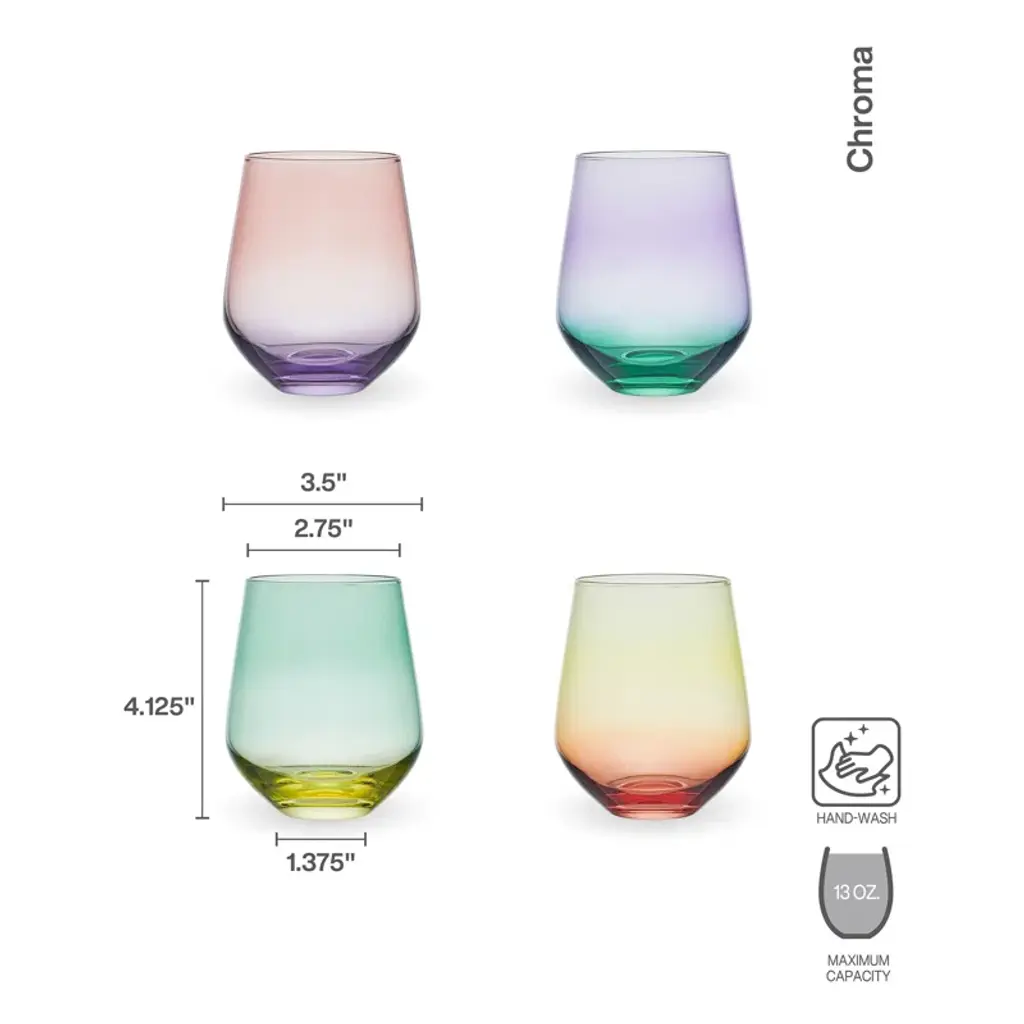 Bring modern mystique to any gathering or celebration with this Set of 4 Chroma Stemless Wine Glasses by Mikasa. Stunningly crafted of soda glass, each piece in the collection features a distinct color tint with an ombre fade effect. Stemless wine glasses are contemporary, stylish, and versatile, so they can also be used to serve a variety of cocktails or as drinking glasses for enjoying cold beverages. Each glass measures 4-1/8 inches high with a 3-1/2 inch diameter and 13-fluid ounce capacity. Set of 4. Hand-wash only.