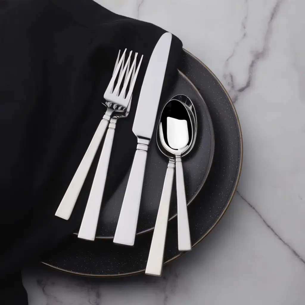 A striking addition to a contemporary tabletop display, this Greer 20-Piece Flatware Set by Mikasa elevates casual and formal place settings with a touch of sleek sophistication that complements any dinnerware or stemware. Stunningly crafted of 18/10 stainless steel for long-lasting beauty, this timeless set captivates with clean lines, bold angles, and square cut tips. 20-piece set, service for 4, includes 4 each of: dinner fork, saladfork, dinner knife, dinner spoon, and teaspoon. Dishwasher safe.