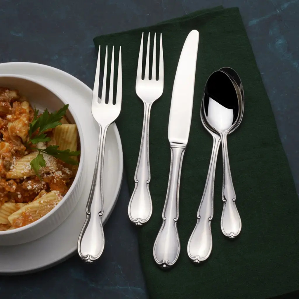 Mikasa Marseille pattern has a unique beaded design. 20-piece flatware set, service for four, includes 4 each of: dinner fork, salad fork, dinner knife, dinner spoon, and teaspoon. Crafted of 18.10 Stainless Steel. Dishwasher Safe.