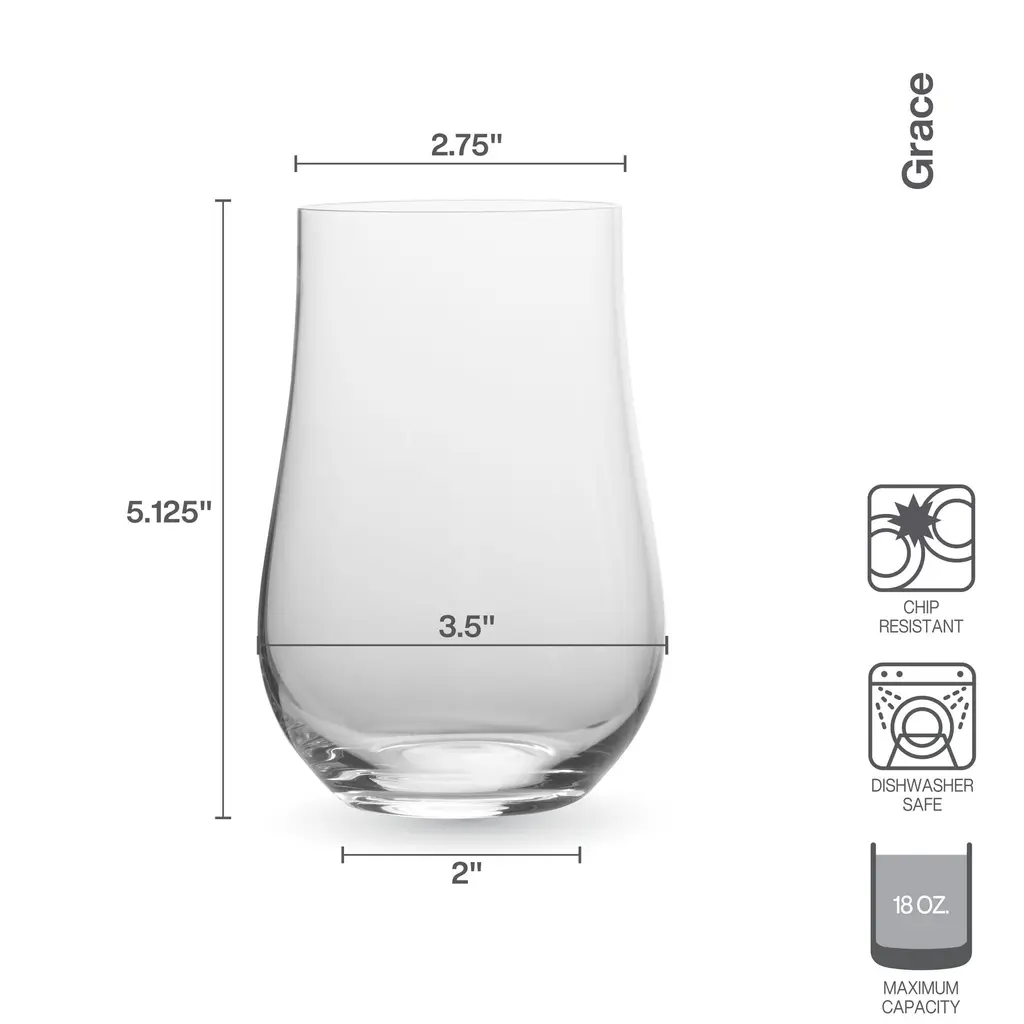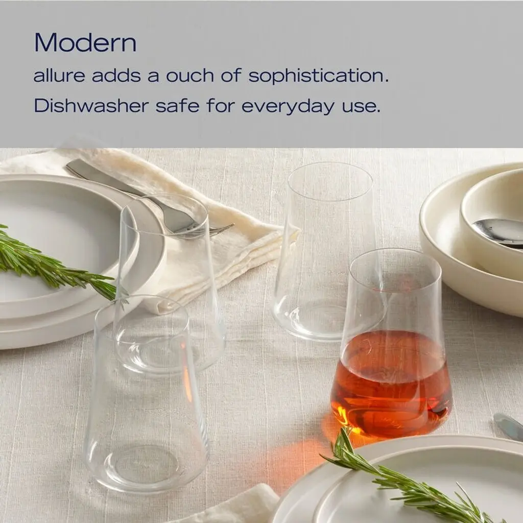 Elegant and sophisticated Aline Stemware by Mikasa captivates with unexpected curves that flare outward to wide bases. Beautifully crafted of lead-free crystal, this collection is machine-made and welded with fire-polished stems. These highball glasses bring modern appeal to your dining table or home bar, and are ideal for serving mixed cocktails. Set of 4, each measuring 5 inches tall with a 3-1/2 inch diameter and a 17-fluid ounce capacity. Dishwasher safe.