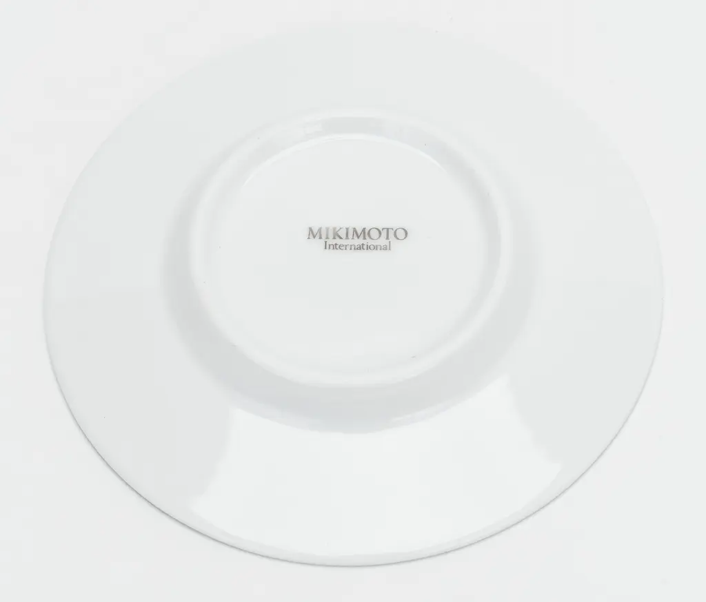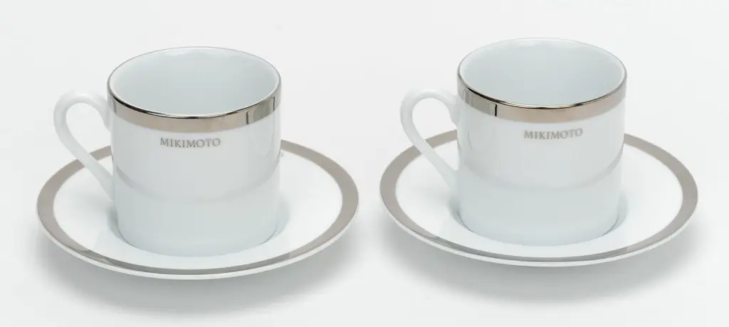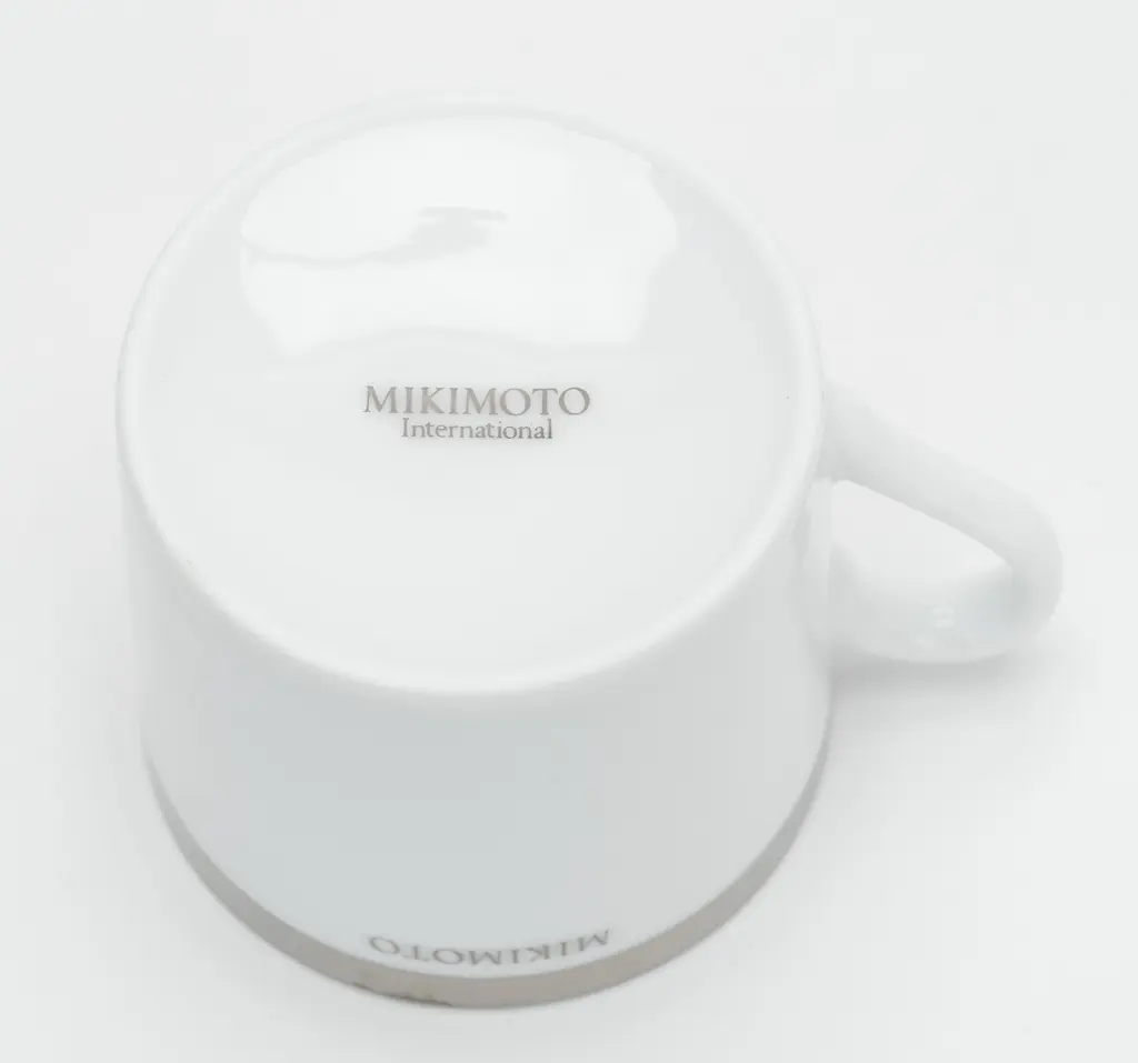 Mikimoto White and Platinum set of 2 coffee caps and saucers. Excellent condition. Comes with original box.