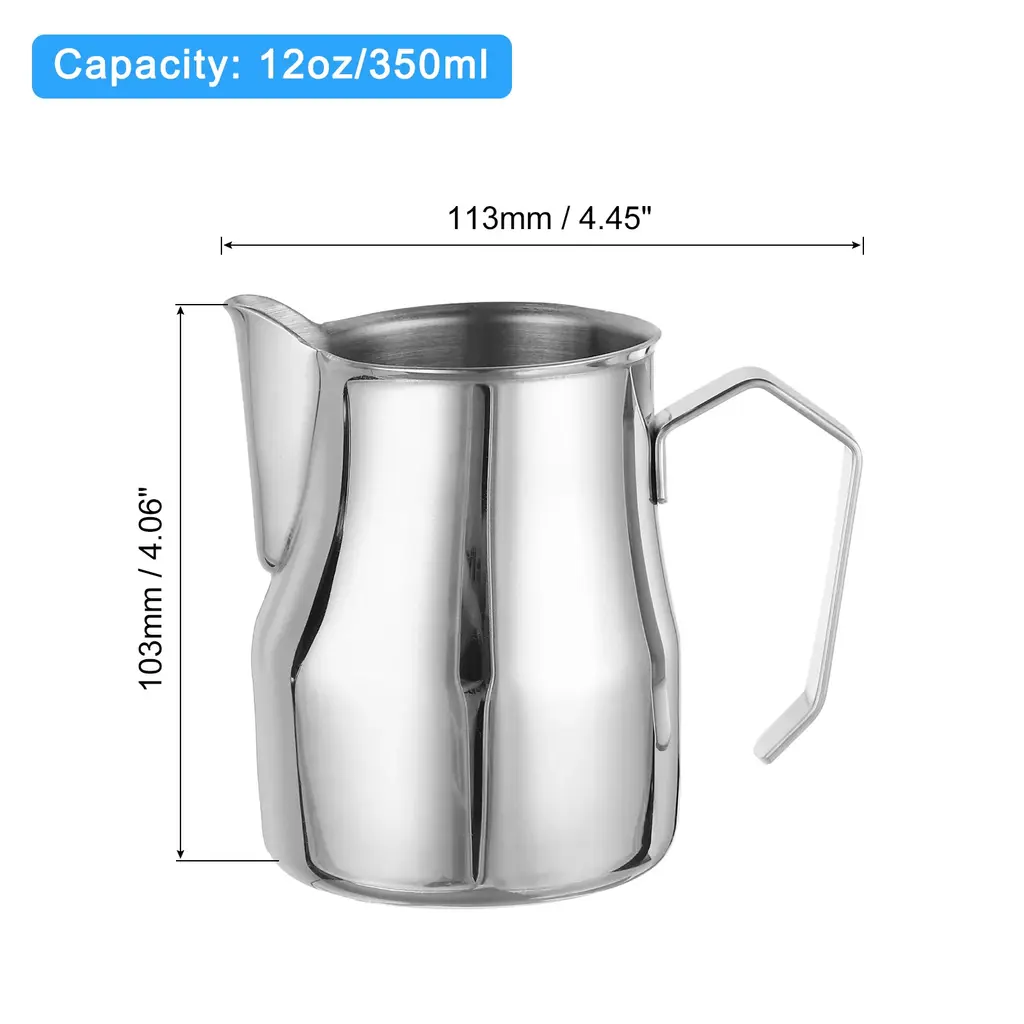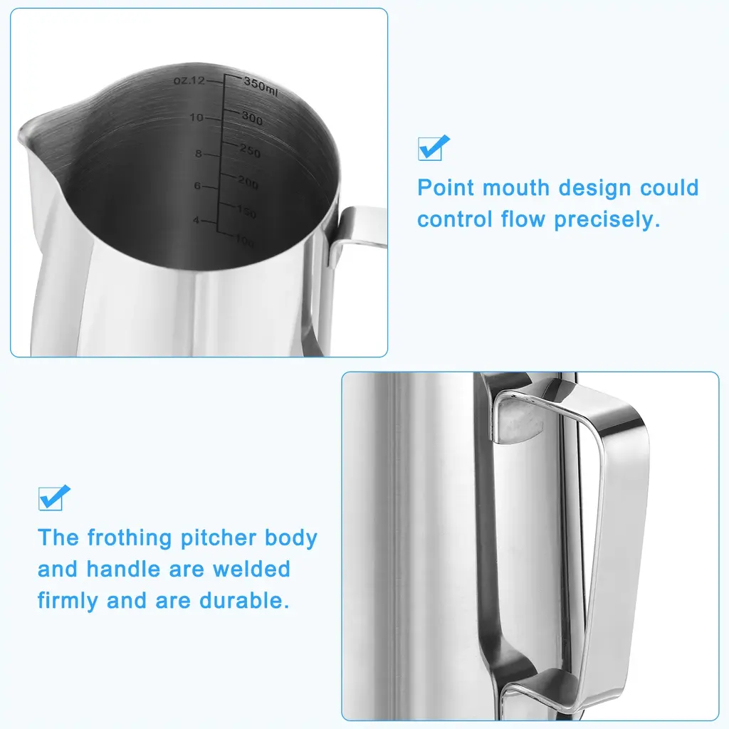 Description:[Stainless Steel] This milk frothing cup is made of stainless steel, strong and durable to use, rust-proof, stain-proof and crash-proof, heat-proof, unbreakable by daily use, and stylish appearance.[Mouth Design] Spout is designed for precise pours and won't make a mess of the countertop. The milk pitcher can help you to froth milk for coffee even at home.[Design] The frothing pitcher body and handle are welded firmly, and durable using. Point mouth design could control flow precisely, making the coffee pattern pretty. Etched measurement lines on the inside of the milk steaming pitcher could let you clearly watch the right amount of milk required.[Wide Application] For homes, cafes, bars, restaurants, hotels, and so on. Exquisite workmanship, unbreakable for daily use. The frothing cup is very easy to after use.Specification:Material: Stainless SteelSurface: ElectroplatingSize: 98x110mm/3.86"x4.33"(L*W)Product Content:1x Frothing Pitcher Set