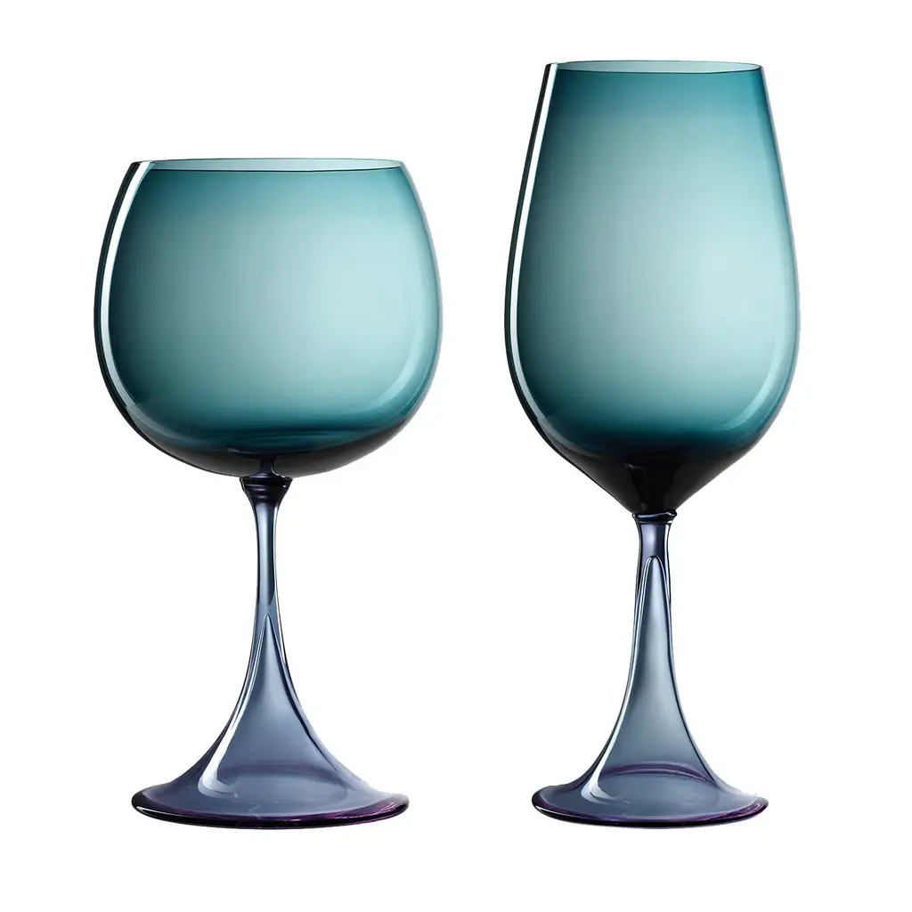 The mille e una notte collection features two distinct wine glasses: the bourgogne at 19 cm height and 9.5 cm diameter, and the bourgogne gran cru with a larger 24.5 cm height and 11.5 cm diameter. Designed by NasonMoretti and Stefano Marcato, the glasses come in transparent pastel shades inspired by dreamlike atmospheres. Each shape is crafted to enhance the organoleptic characteristics of specific wine varieties, combining refined aesthetics with precise functionality.