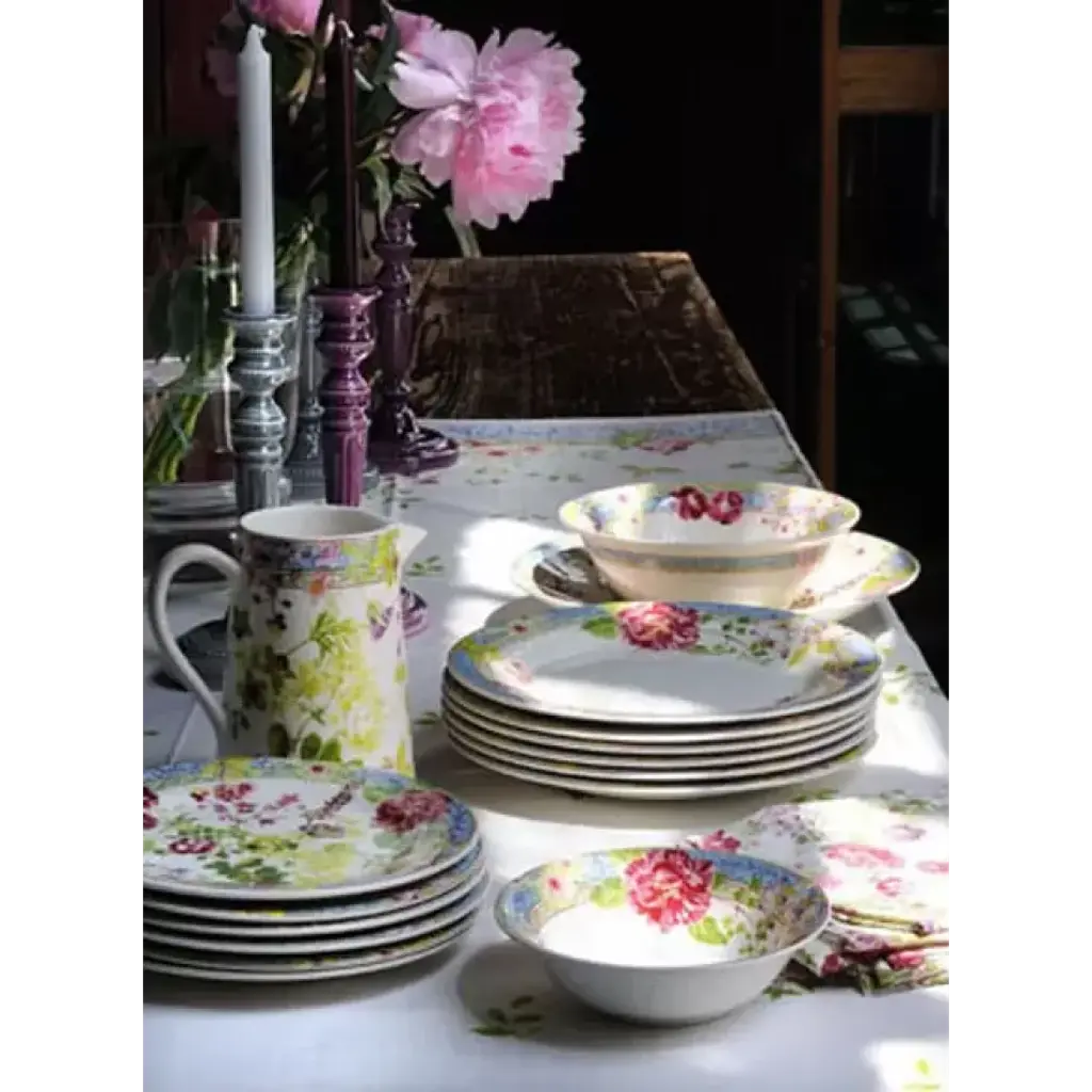 Like a burst of color from the garden, Gien's Millefleurs dinnerware is perfect for bringing the outdoors in. Faience earthenware made in France by Gien. Four-piece place setting includes dinner plate, dessert plate, bowl, and mug. Five-piece place setting includes dinner plate, dessert plate, canape plate, US tea cup, and saucer. Located near the Loire Valley castles, the Faïencerie de Gien has been synonymous with prestigious faience tableware and decorative objects since its founding in 1821. Gien pieces are renowned for their warm white clays decorated with traditional motifs reminiscent of the French countryside.