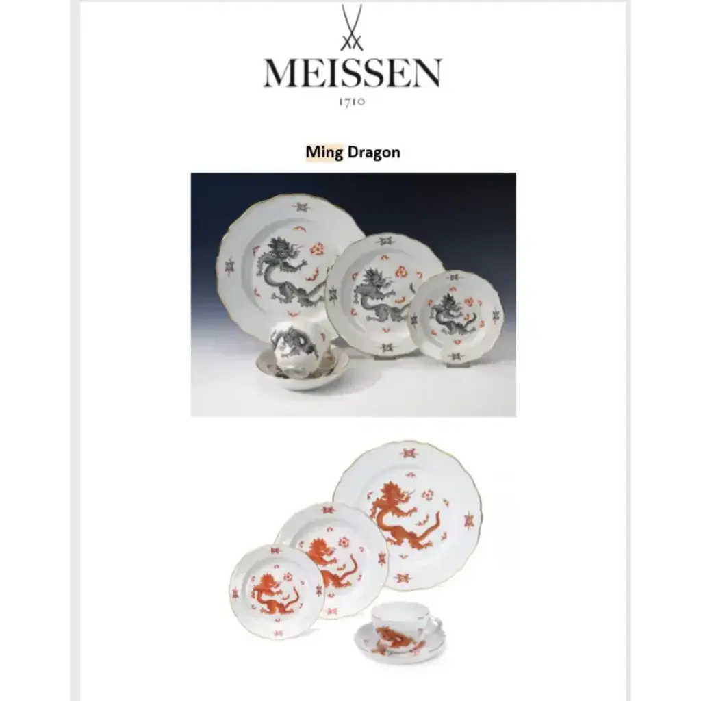 Symbolizing preternatural wisdom, the spirit of change, sun, light and the male power of the yang, the Chinese Ming dragon is one of the oldest and most popular designs by Meissen. Although created in 1740 based on Asian templates, its interpretation on clear, architectural shapes and a gold rim gives it a more classic look. Note the dragon with four toes: these were originally reserved for items used by royal princes in ancient China. Founded in 1710 by King Augustus the Strong, Meissen is the oldest porcelain manufactory in Europe and enjoys worldwide acclaim for its exceptional craftsmanship. Meissen and its crossed swords insignia are synonymous with the highest quality porcelain; every Meissen piece is entirely crafted in-house in the state of Saxony (Germany).