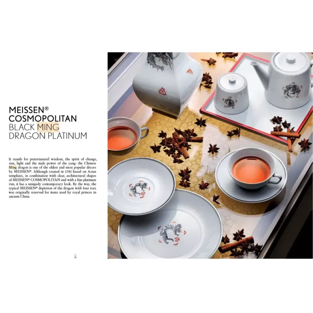 Symbolizing preternatural wisdom, the spirit of change, sun, light and the male power of the yang, the Chinese Ming dragon is one of the oldest and most popular designs by Meissen. Although created in 1740 based on Asian templates, its interpretation on clear, architectural shapes and a fine platinum rim gives it a contemporary look. Note the dragon with four toes: these were originally reserved for items used by royal princes in ancient China. Founded in 1710 by King Augustus the Strong, Meissen is the oldest porcelain manufactory in Europe and enjoys worldwide acclaim for its exceptional craftsmanship. Meissen and its crossed swords insignia are synonymous with the highest quality porcelain; every Meissen piece is entirely crafted in-house in the state of Saxony (Germany).