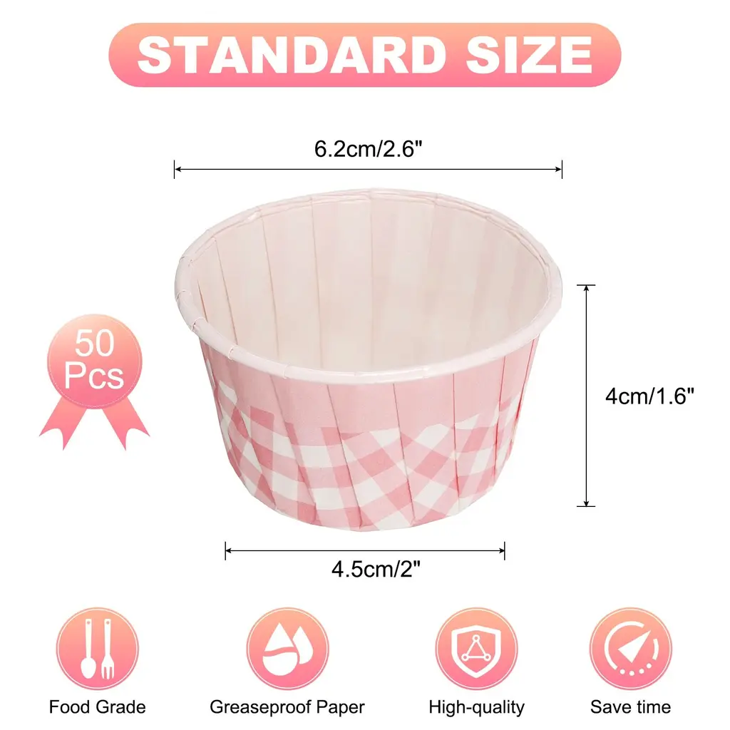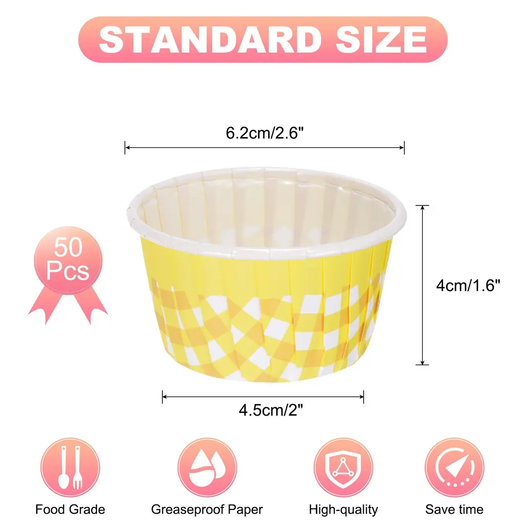 Advantage:Material: Crafted from quality greaseproof paper, these disposable cupcake muffins liners are designed to be sturdy and durable while providing a greaseproof barrier to prevent the cupcakes from sticking to the paper. Minimize Clean-Up: These muffins minimize clean-up by letting your treats spring out when they are done. This means no more scrubbing or wiping down many muffins cups to remove baked mess. Non-Stick: These mini cupcake liners are non-stick, allowing easy removal of your baked goods without any residue left behind. This feature ensures that your cupcakes maintain their shape and presentation when removed from the liners.Wide Occasions: Cupcake Liners are suitable for most occasions, salads, mousse brownies, muffins, brûlée, apple pies, puddings, cupcakes, cheesecakes, etc. It's a sweet gift for Mother's Day.Note: Do not bake the empty cupcake liners in the oven.Specification:Material: PaperColor: Light Blue and WhiteShape: CupHeight: 4cm/1.6inchOpen Diameter: 6.2cm/2.6inchBottom Diameter: 4.5cm/2inchPackage Included: 50Pcs x paper baking cups