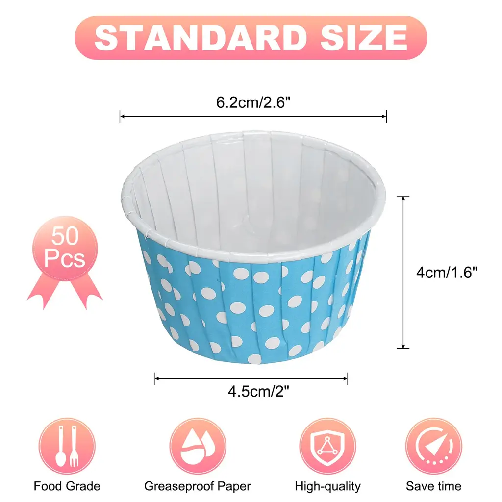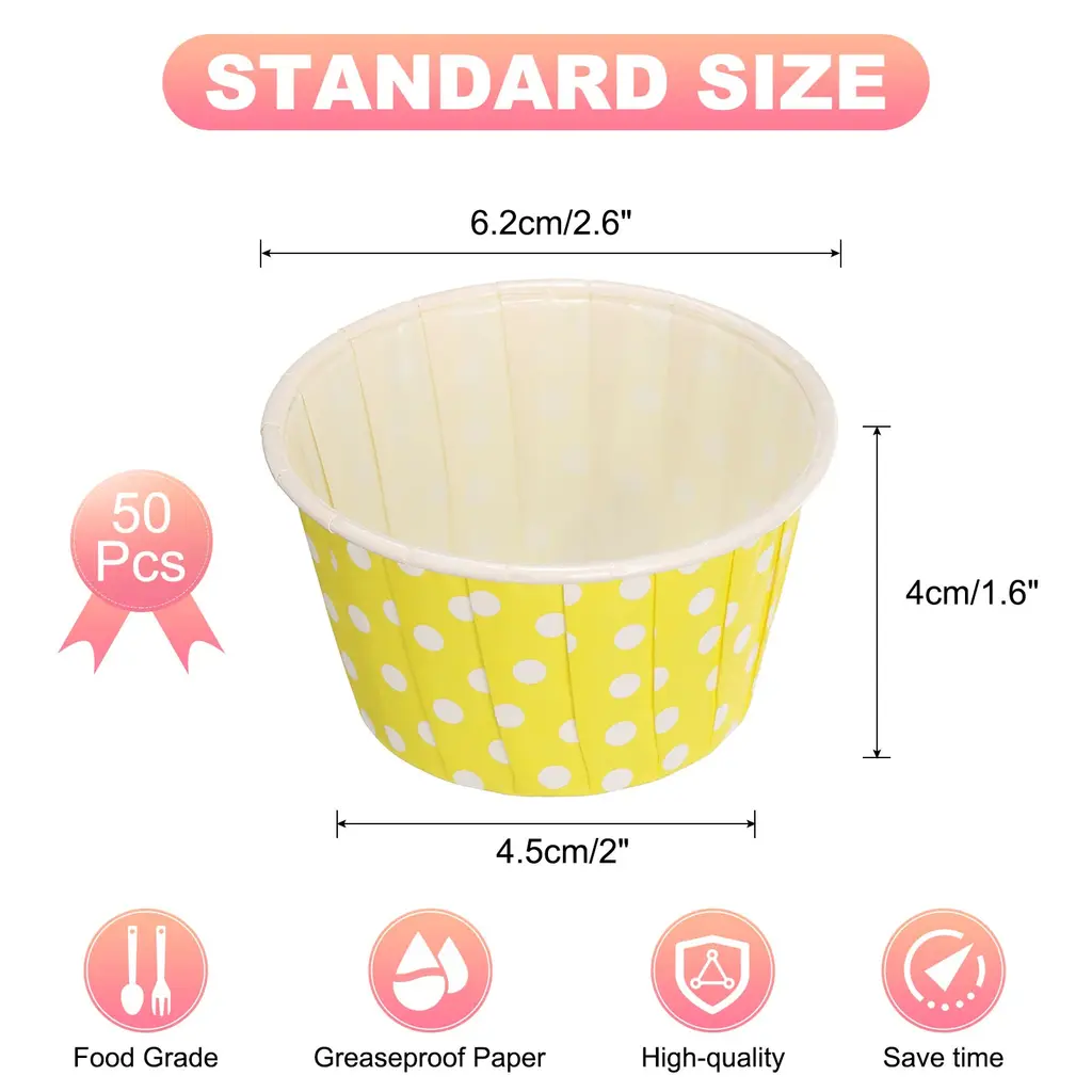 Advantage:Material: Crafted from quality greaseproof paper, these disposable cupcake muffins liners are designed to be sturdy and durable while providing a greaseproof barrier to prevent the cupcakes from sticking to the paper. Minimize Clean-Up: These muffins minimize clean-up by letting your treats spring out when they are done. This means no more scrubbing or wiping down many muffins cups to remove baked mess. Non-Stick: These mini cupcake liners are non-stick, allowing easy removal of your baked goods without any residue left behind. This feature ensures that your cupcakes maintain their shape and presentation when removed from the liners.Wide Occasions: Cupcake Liners are suitable for most occasions, salads, mousse brownies, muffins, brûlée, apple pies, puddings, cupcakes, cheesecakes, etc. It's a sweet gift for Mother's Day.Note: Do not bake the empty cupcake liners in the oven.Specification:Material: PaperColor: RedShape: CupHeight: 4cm/1.6inchOpen Diameter: 6.2cm/2.6inchBottom Diameter: 4.5cm/2inchPackage Included: 50Pcs x paper baking cups