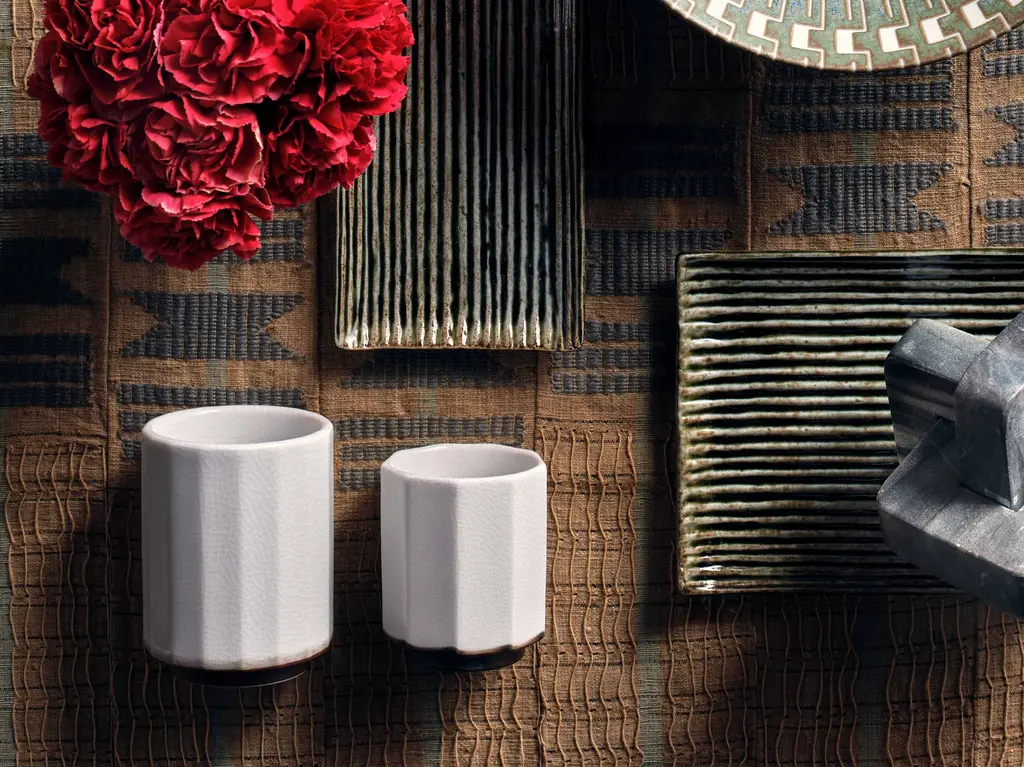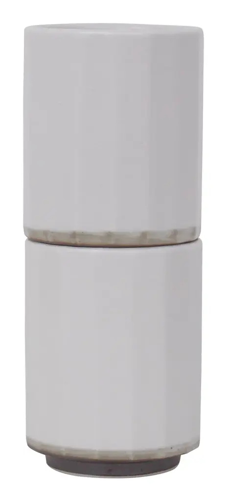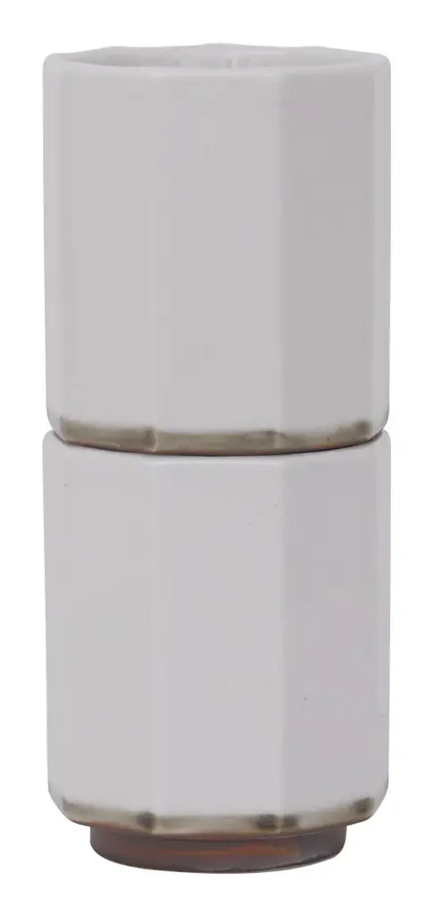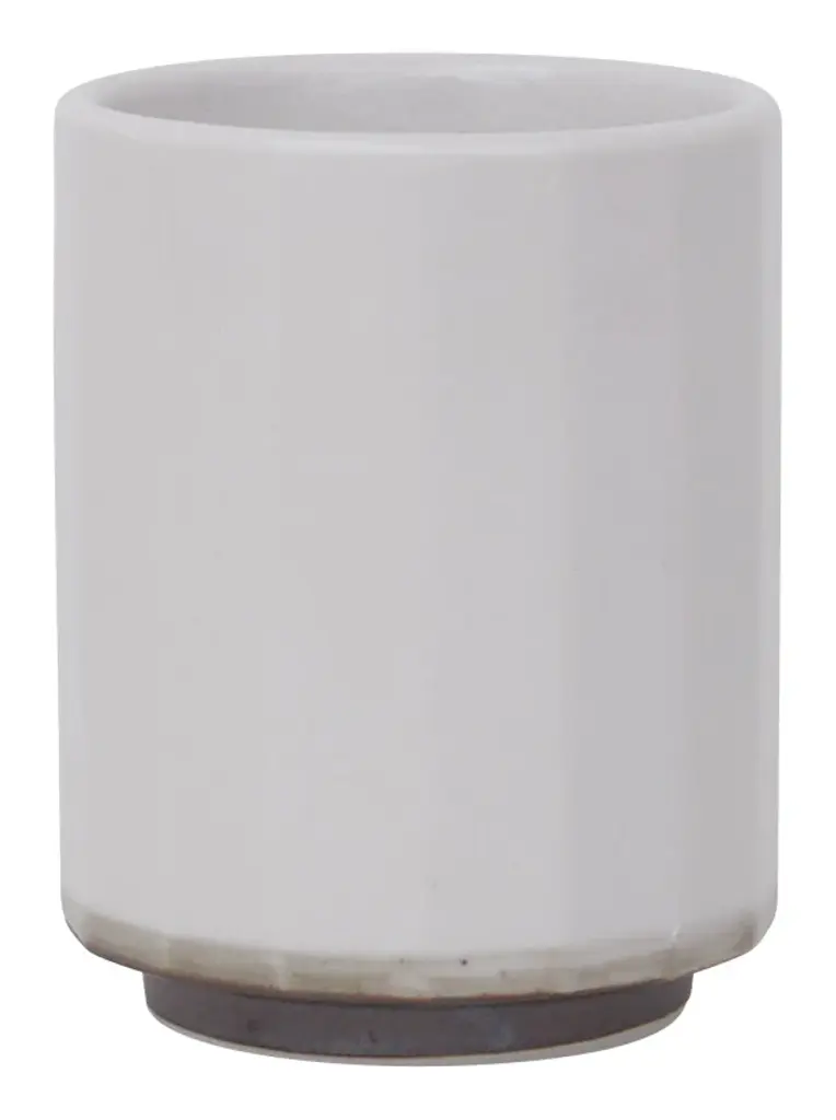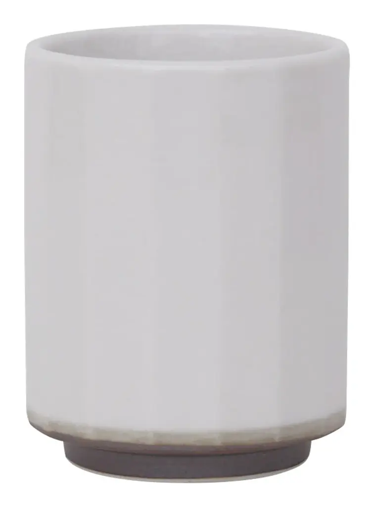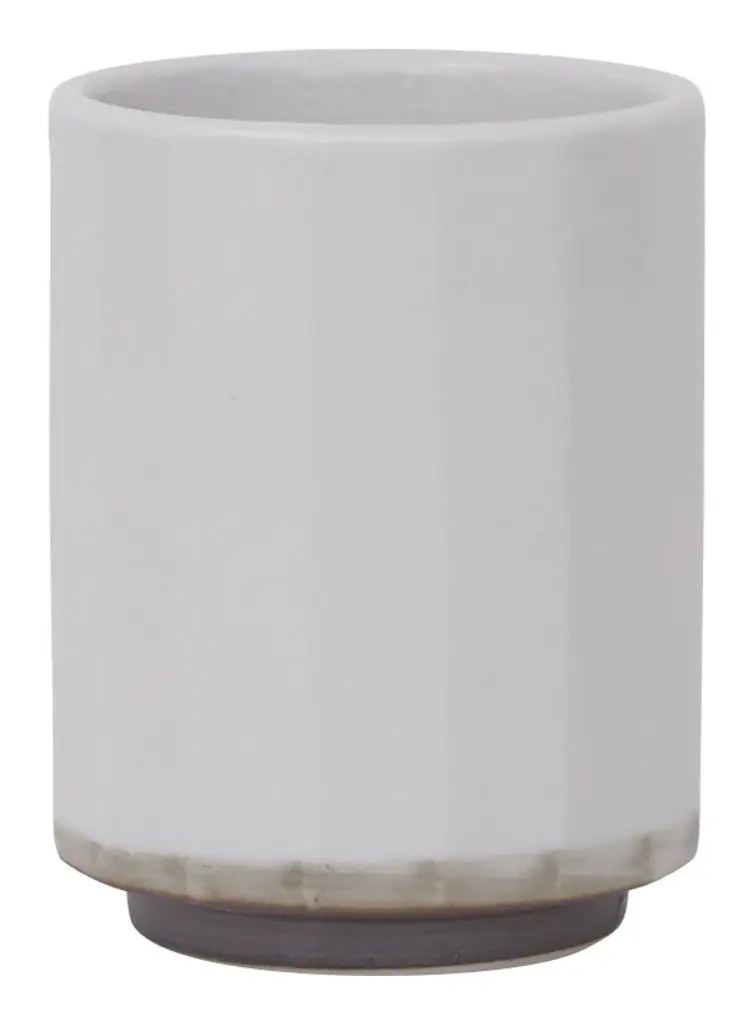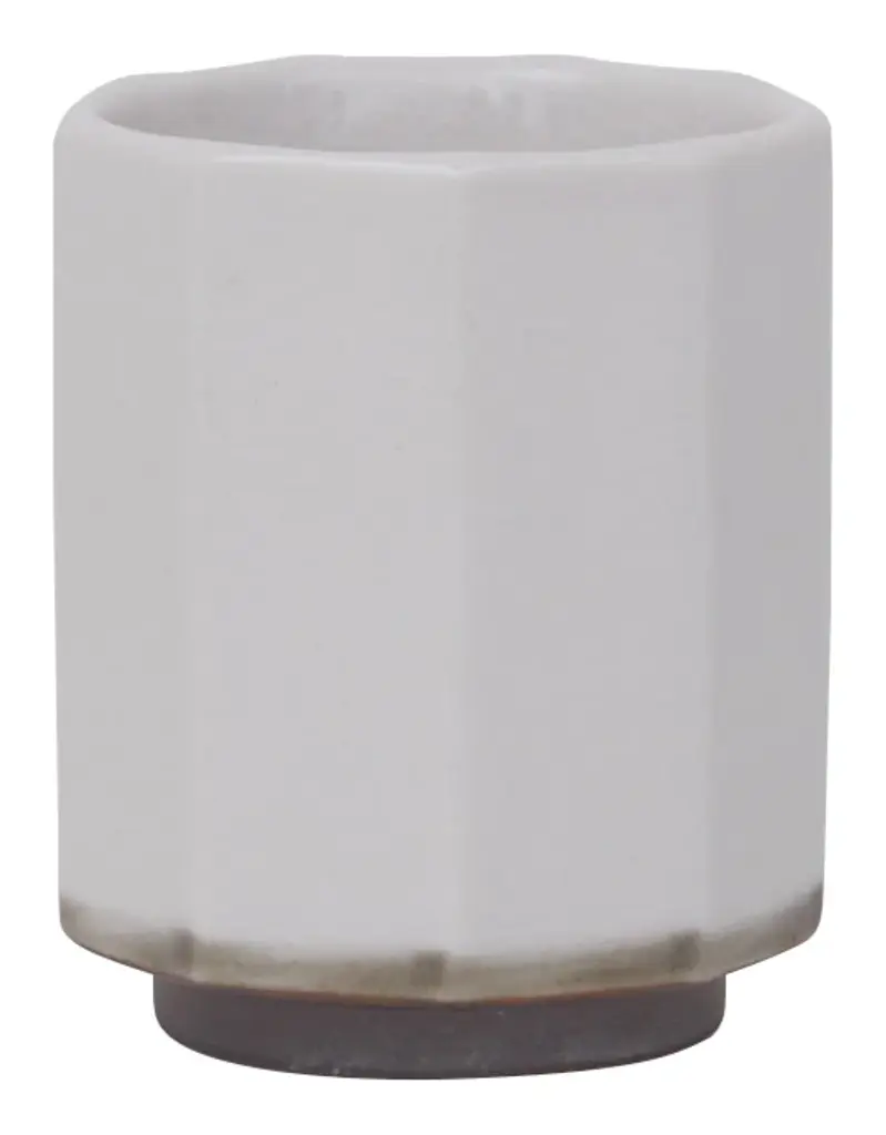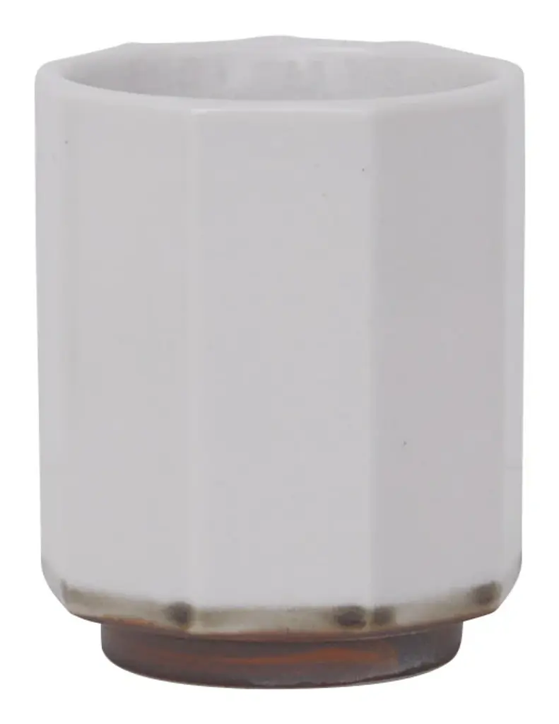Modern in design yet steeped in tradition, our Mitsu Cups are ready to harmonize with any serveware collection. Taking their cue from Japan’s timeless yunomi tea cups with their simple, cylindrical shapes, these pretty little porcelain vessels get a fresh feel thanks to their faceted sides and glossy, bright white crackle glaze. We love how their bases have been left unglazed, revealing a bit of that raw clay color for a touch of earthy contrast. Perfect for serving up tea, our Mitsu Cups would also be great for sips of water at a chic dinner table. •porcelain •glossy white crackle glaze •unglazed brown base•food safe •dishwasher and microwave safe •each is unique Dimensions •small: approximately 2.5" diameter x 3.25"H•large: approximately 3" diameter x 4"H