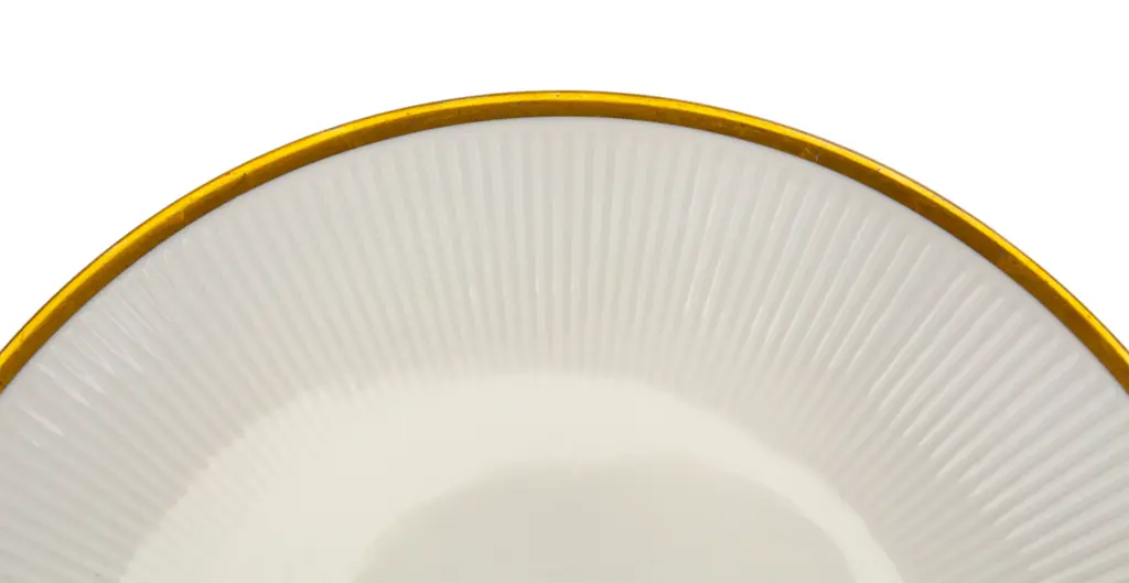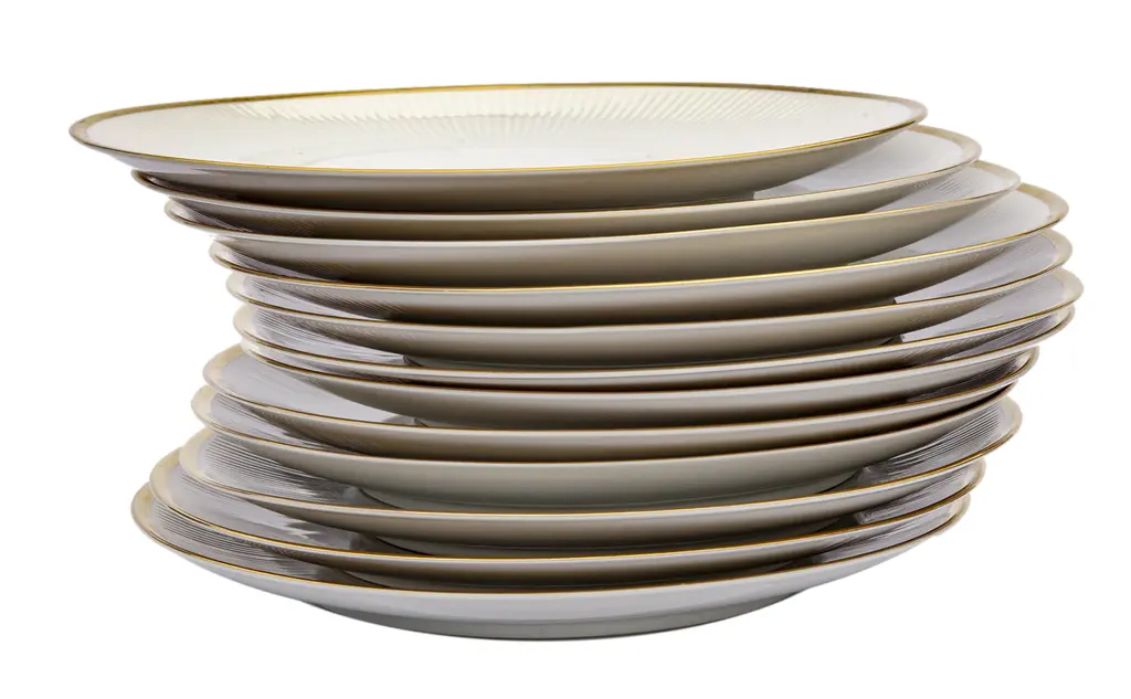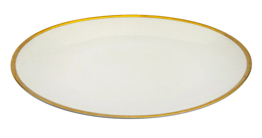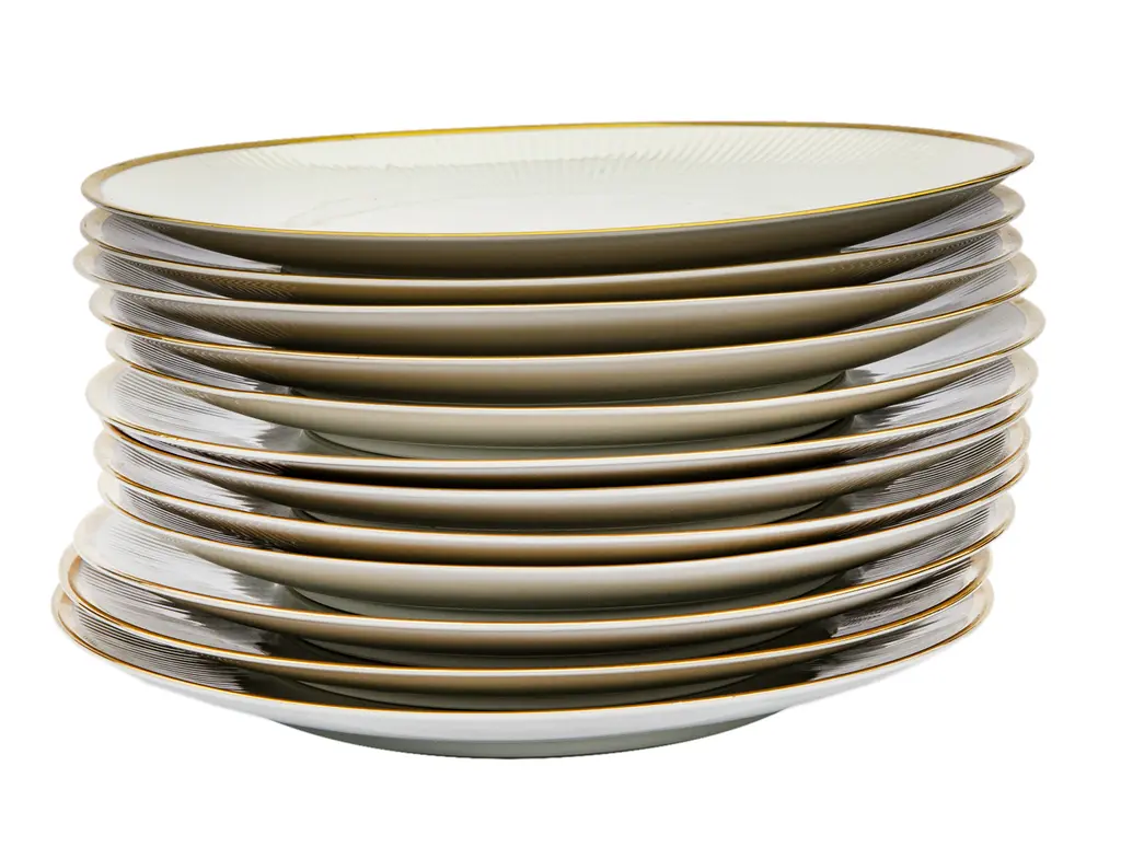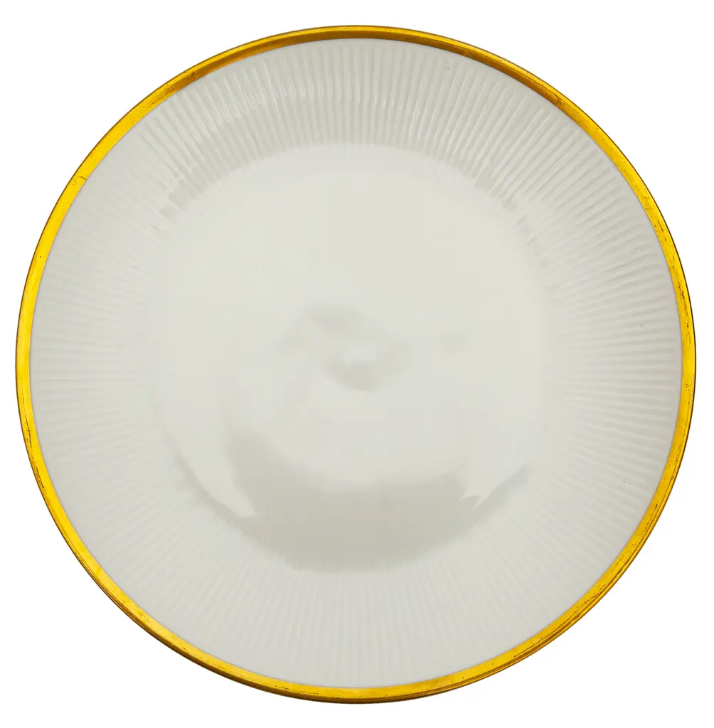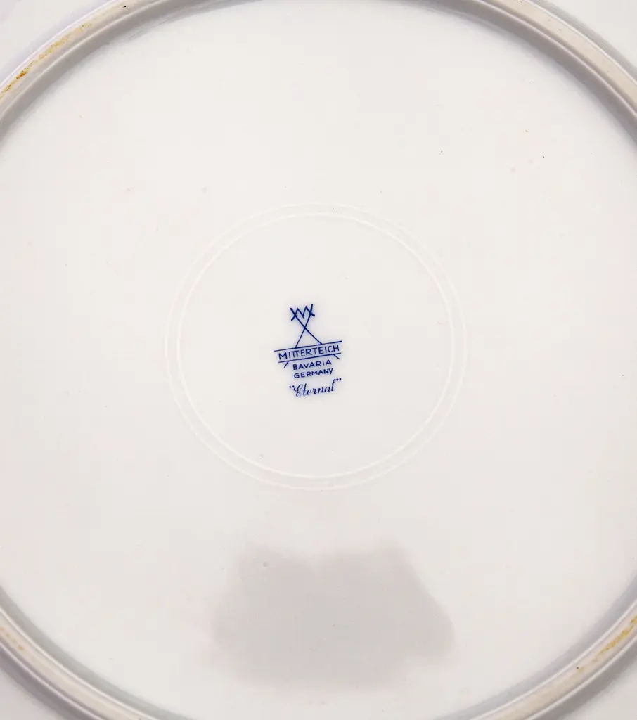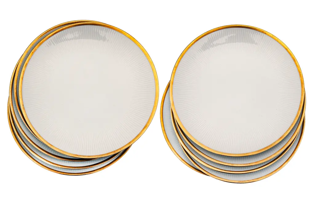 Mid-century Bavarian dinner plates by Mitterteich in bright white with gold rim. Set/12