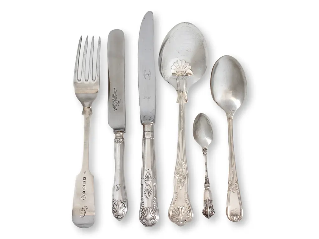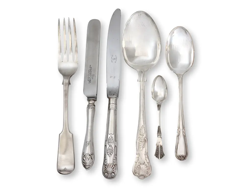 This exquisite set of antique mixed English flatware offers service for six, each piece showcasing unique craftsmanship from renowned English silversmiths. The set includes an array of patterns, beautifully blending classic designs with elegance. Perfect for collectors or those seeking a touch of history at their dining table. Classic oversized European pieces, ranging in size from dinner knife, 9.25"L x .75"W x .25"H to espresso spoon, 4.25"L x .5"W x .25"H. Hallmarked.