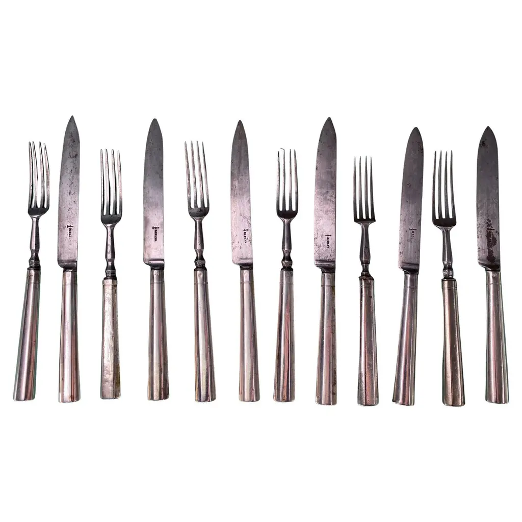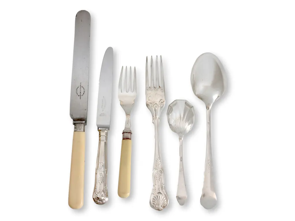 English flatware service for eight, featuring a unique mix of antique and vintage complementary patterns, creating a truly one-of-a-kind collection. Each piece is English, showcasing exceptional craftsmanship and quality. Unique set includes soup spoons and bakelite-handle knives. Classic oversized European pieces, ranging in size from dinner knife, 10.75"L x .75"W x .25"H to small spoon, 5.5"L x 1.5"W x .5"H. Hallmarked.
