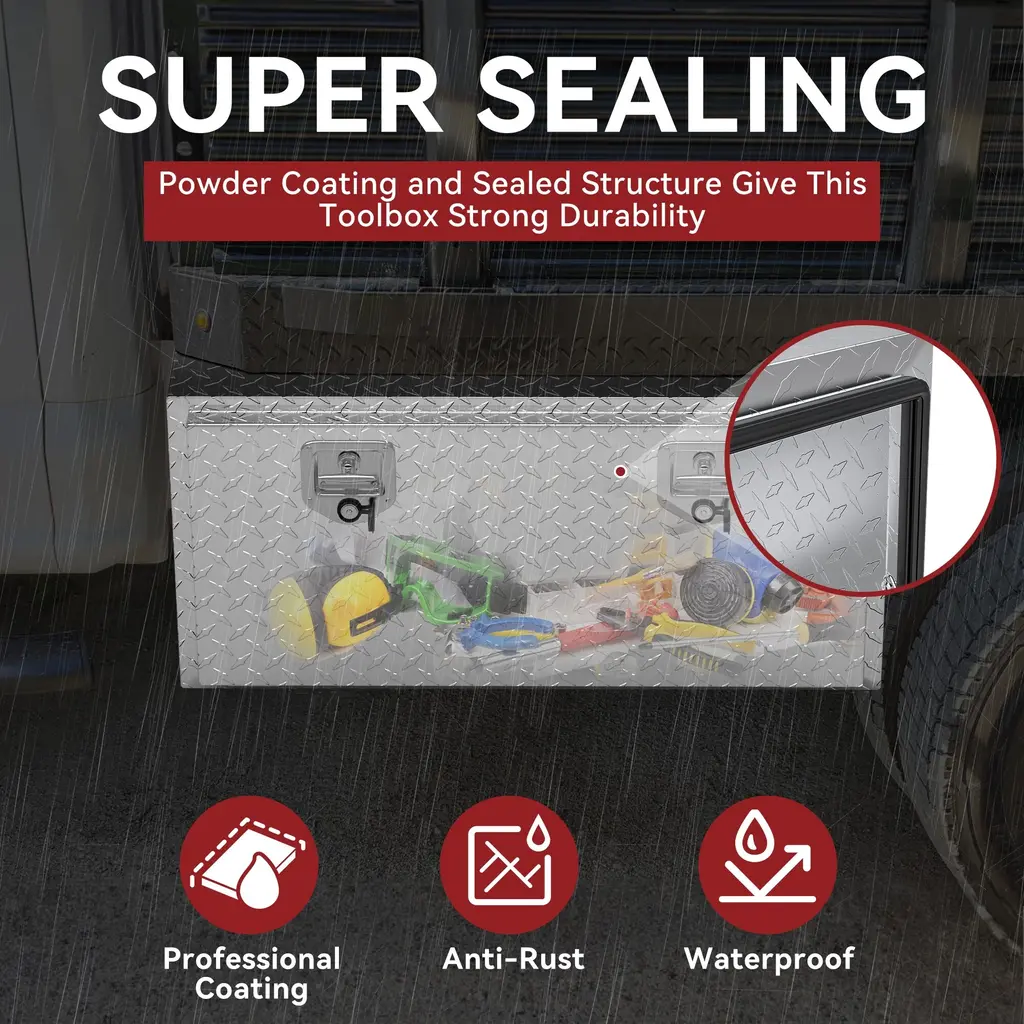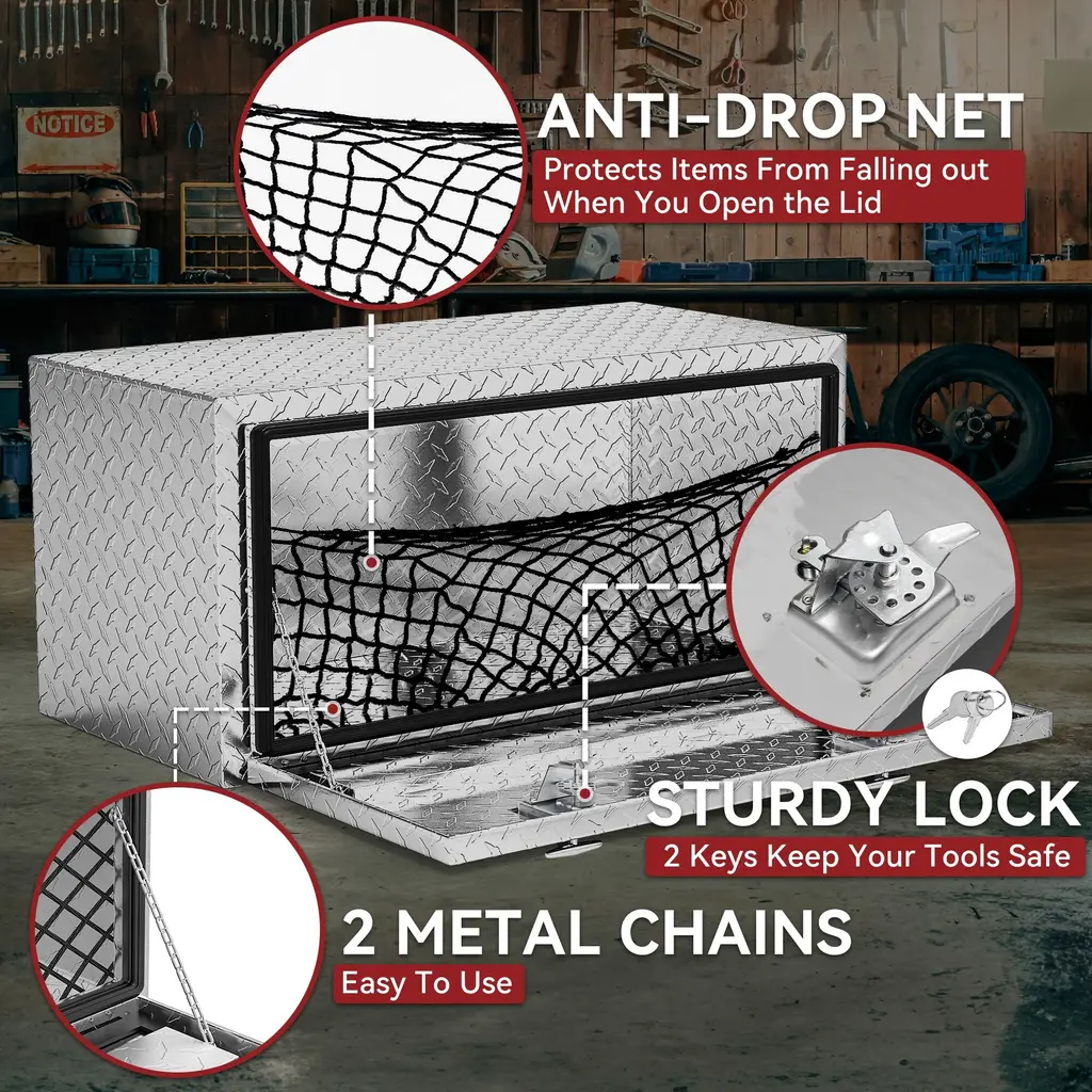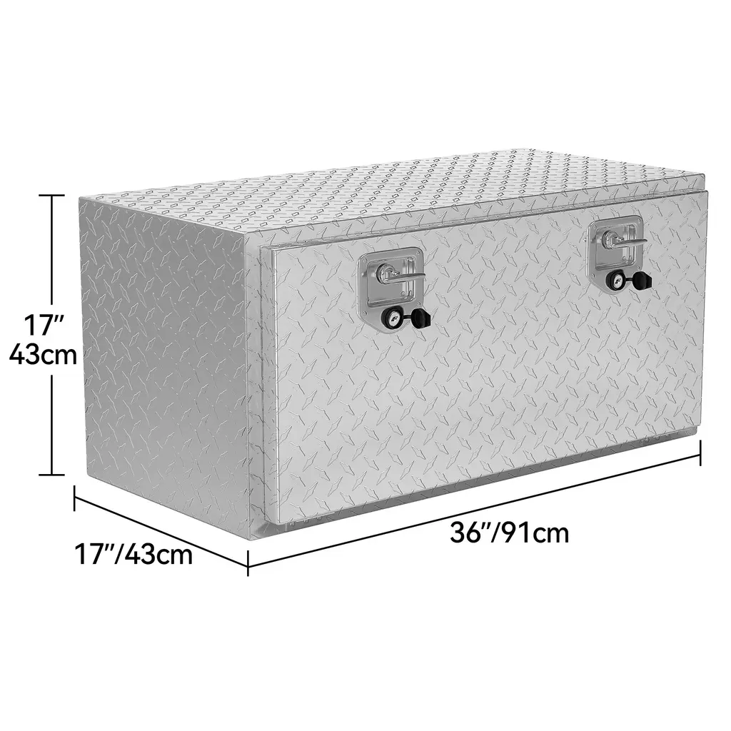 Our toolbox is designed to save space and provide extra storage in your truck bed. It is constructed of textured aluminum for maximum durability. The door features an over-hanging lip which resists water from getting inside. The fold-up door provides full access. The built-in lock ensures all items are kept safe and secure. A perfect toolbox for ATV, home, job site, car, truck bed, trailer, tool box, etc. This aluminum underbody toolbox is perfect for storing your tools in your vehicle or at homeFeatures:Dimensions: