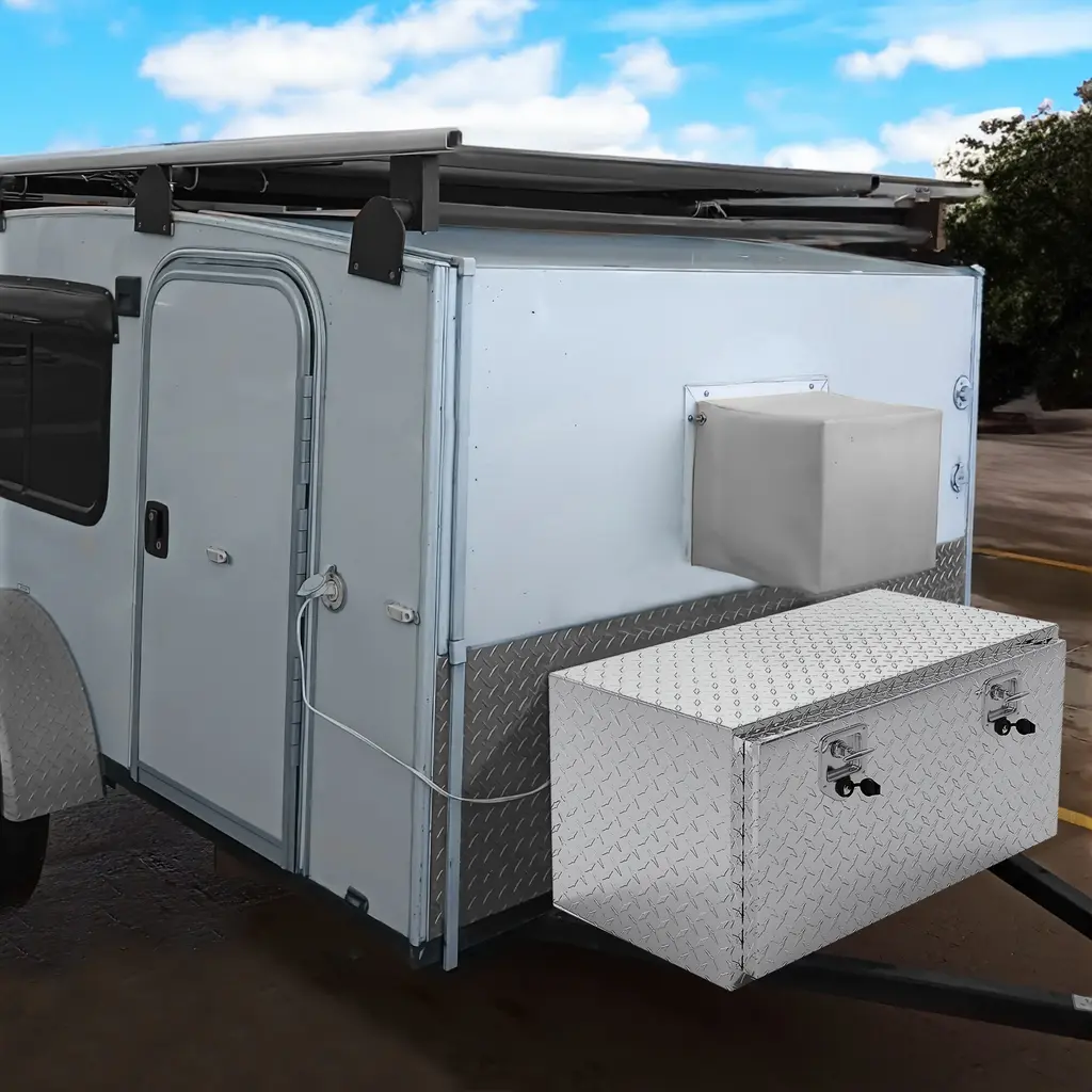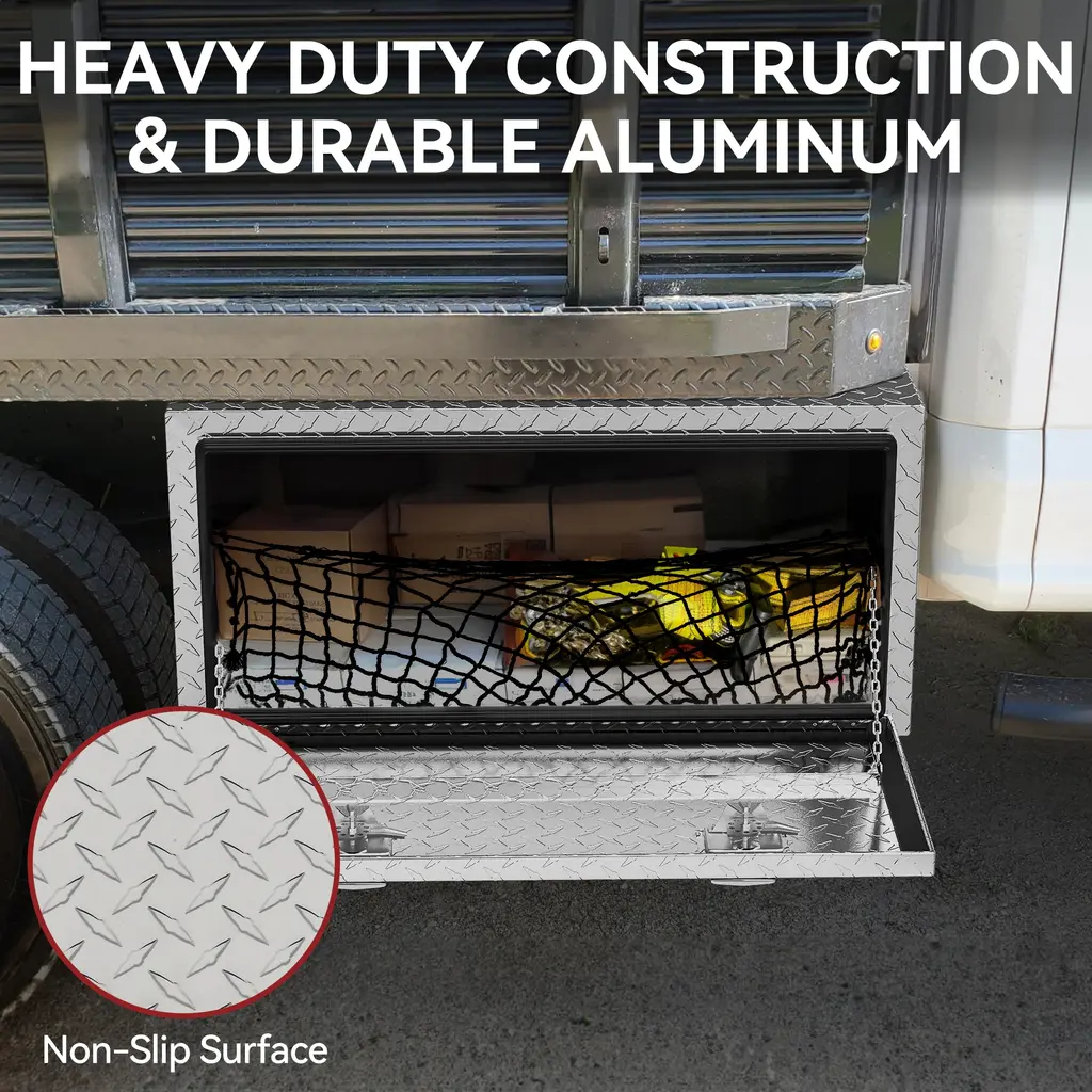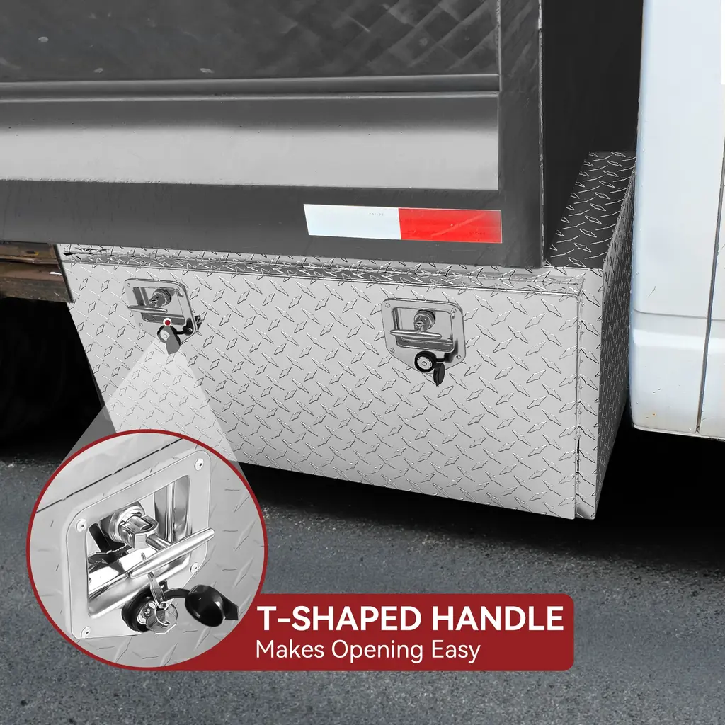 Our toolbox is designed to save space and provide extra storage in your truck bed. It is constructed of textured aluminum for maximum durability. The door features an over-hanging lip which resists water from getting inside. The fold-up door provides full access. The built-in lock ensures all items are kept safe and secure. A perfect toolbox for ATV, home, job site, car, truck bed, trailer, tool box, etc. This aluminum underbody toolbox is perfect for storing your tools in your vehicle or at homeFeatures:Dimensions: