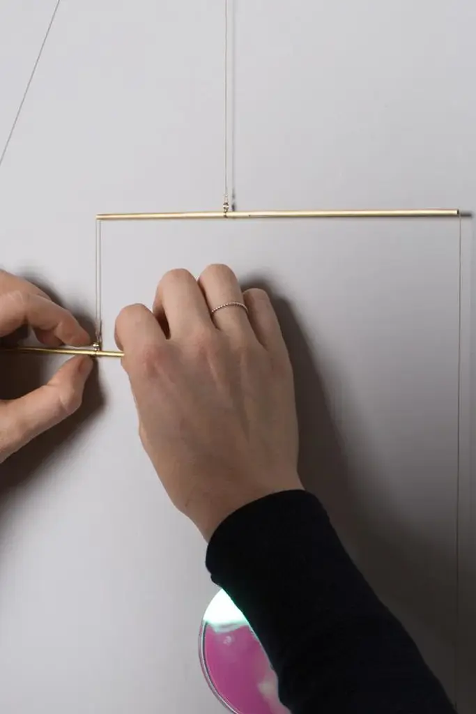 made of 2 brass sticks and 3 round dichroic glasses colours vary- please contact me for special glass selection Camilla Richter works with dichroic-coated glass creating pieces of art that play with light and colour. Always in motion, the coloured glasses of their mobiles cast alternating points of light into the room. Depending on the angle of view and the incidence of light, the glasses appear from intensely coloured, subtly shimmering, to shiny or transparent. The mood they emanate reflects space and time, as it is created by the interplay of environment and light and the perception of the observer. All mobiles are handmade in Munich, the filter glasses are made in Germany.