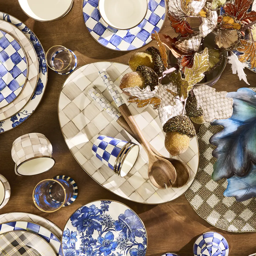 The Mocha Check Large Oval Platter is a great addition to the dinner or buffet table. It features checks hand-painted in a range of espresso-inspired hues over a steel underbody and is trimmed with a bronzed stainless-steel rim. This platter brings both functionality and style to your table setting. Pair with Rosy and Sterling Check patterns, or go Mocha all the way!