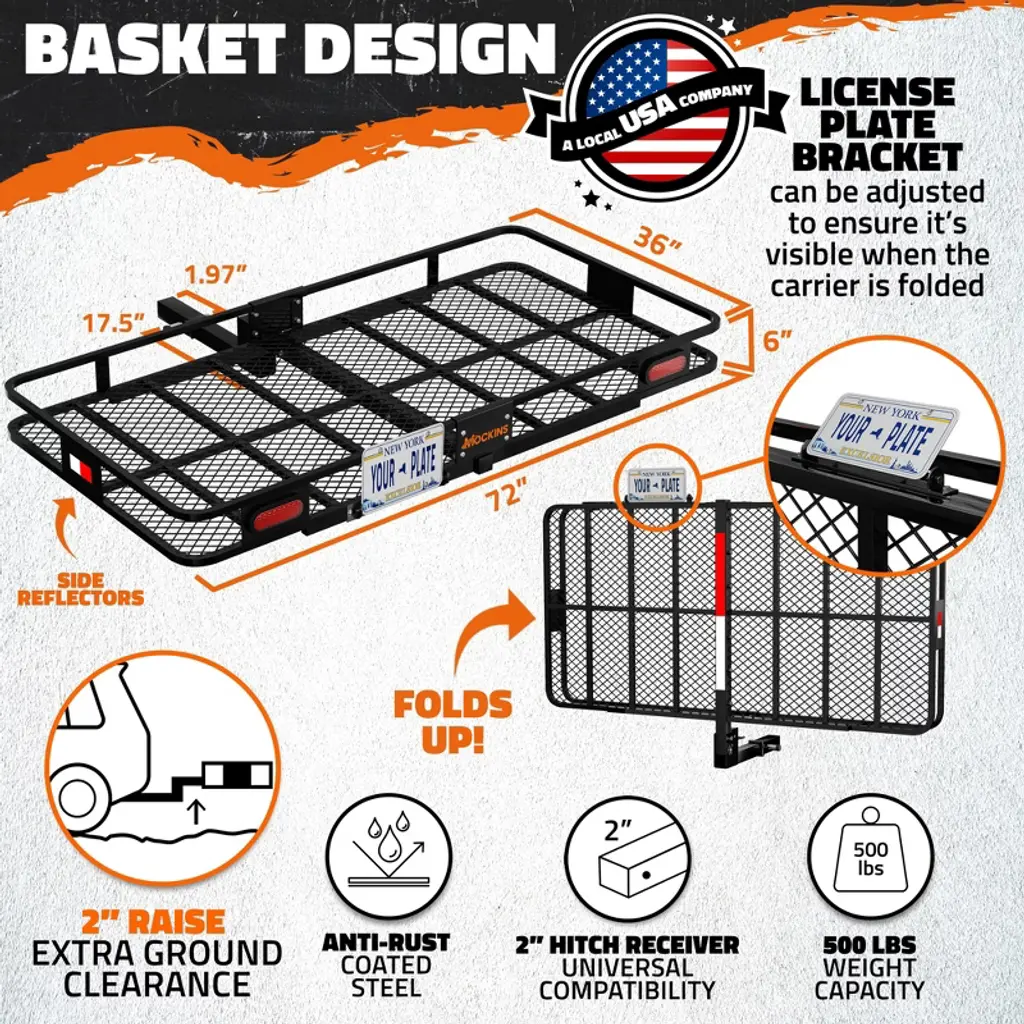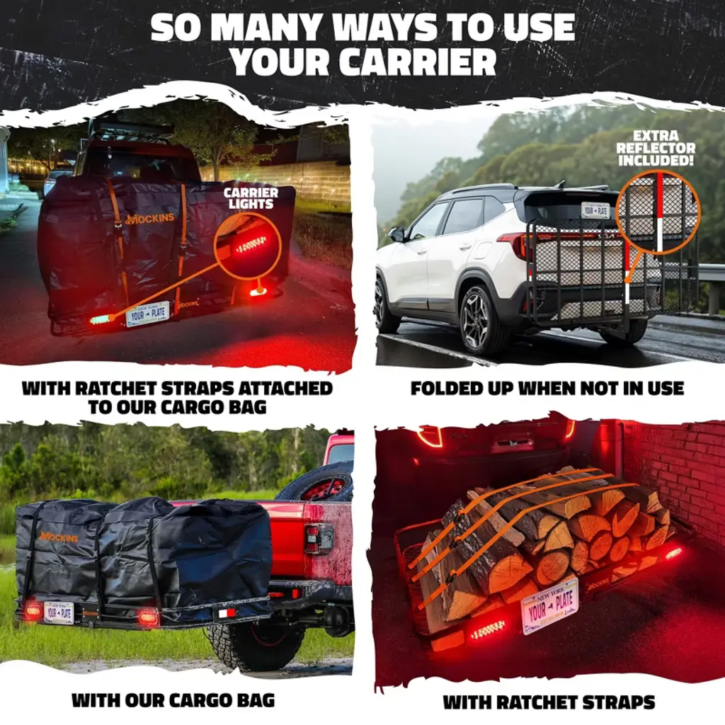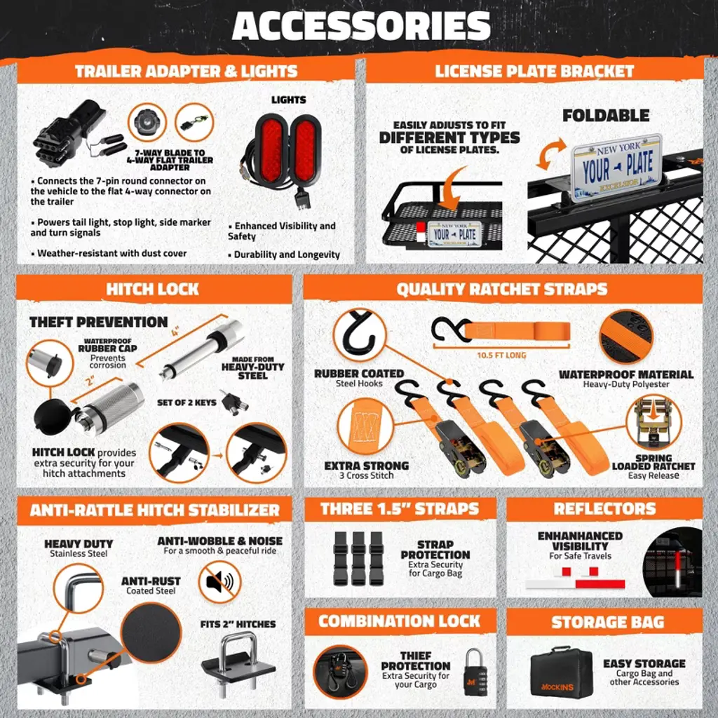 With the Mockins 72"x36"x6" XXL Trailer Hitch Cargo Carrier Set, you can enjoy hassle-free hauling on your next adventure. With the 500 lbs. capacity of the rust-resistant, heavy-duty steel tow hitch rack, you'll have extra room inside your vehicle for increased comfort while you travel. The built-in license plate holder and rear lights provide peace of mind in instances where cargo obstructs the rear of your vehicle, or when driving at night. Plus, the hitch cargo rack bundle also includes a 50 cubic feet waterproof hitch cargo bag, as well as a bag lock, three buckle straps, three ratchet straps, a hitch lock, a hitch stabilizer and a storage bag for additional security and stability. Keep your stuff safe and you confident every time you hit the road with the Mockins XXL Receiver Hitch Cargo Carrier!