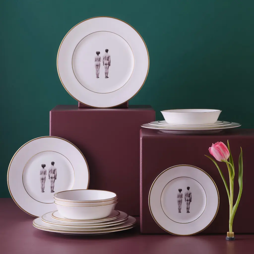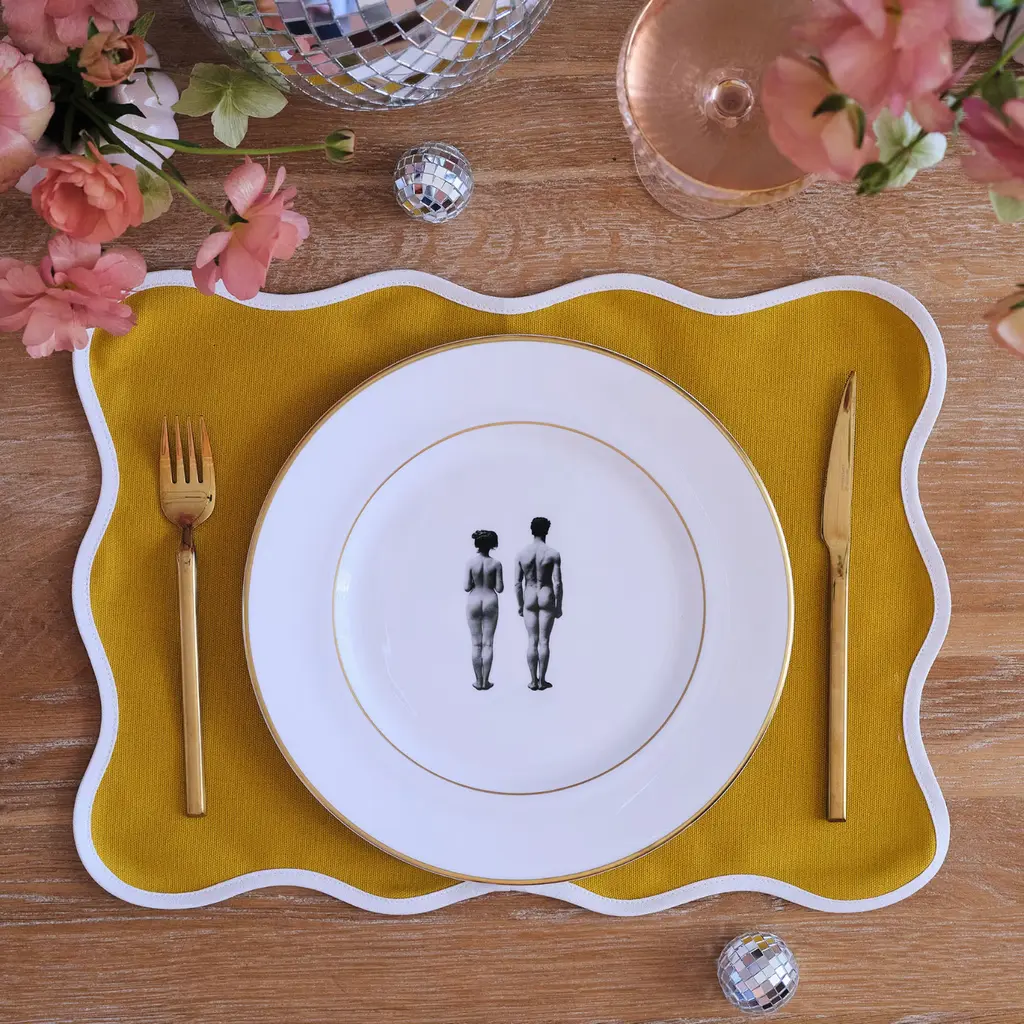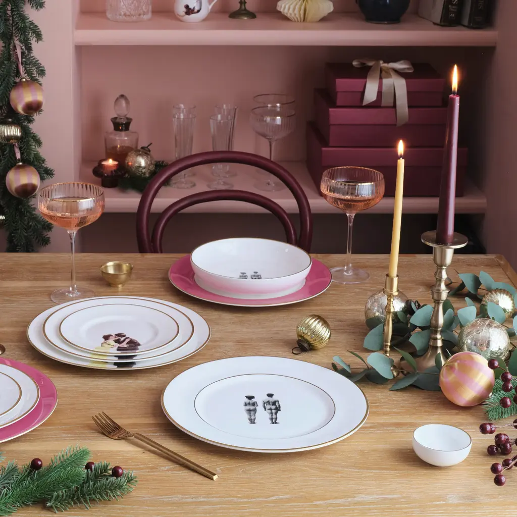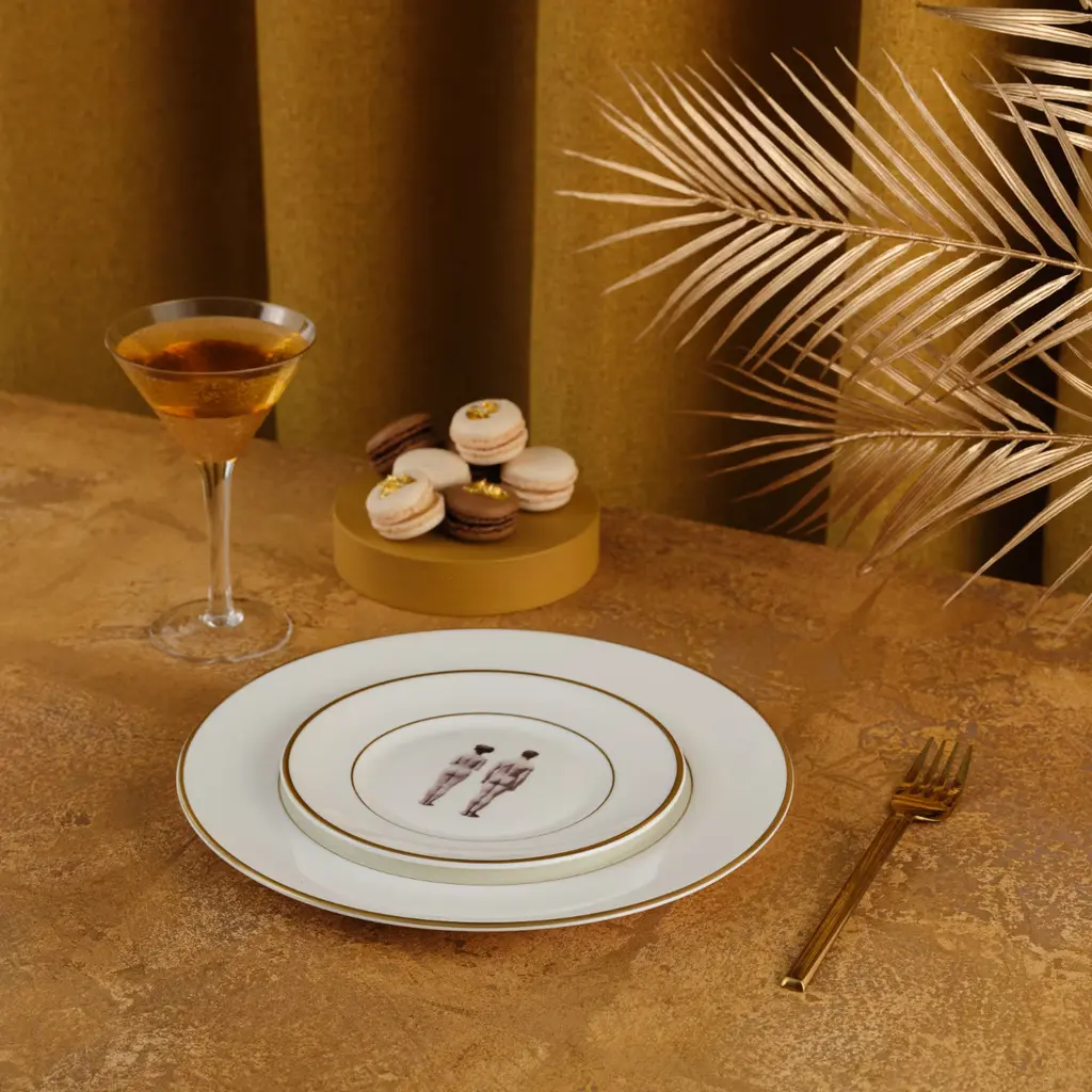 Set the table in style with an exquisitely handcrafted fine bone china dinner plate featuring the cheeky Models design from the Melody Rose Modern Surrealist Collection.Each plate features a hand painted 22kt burnished gold trim for a luxurious and dishwasher friendly finish.The playful design paired with the best of British craftsmanship makes a delightful gift for foodies, design lovers and everyone in between.Perfect on it's own or mix, match and layer the Melody Rose collection to create a unique heritage tableware set with a 21st century twist.