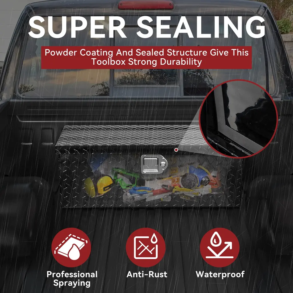 This toolbox is designed to save space and provide extra storage in your truck bed. It is constructed of textured aluminum for maximum durability. The door features an over-hanging lip which resists water from getting inside. The fold-up door provides full access. The built-in lock ensures all items are kept safe and secure. A perfect toolbox for ATV, home, job site, car, truck bed, trailer, toolbox, etc. This aluminum underbody toolbox is perfect for storing your tools in your vehicle or at home.Features: