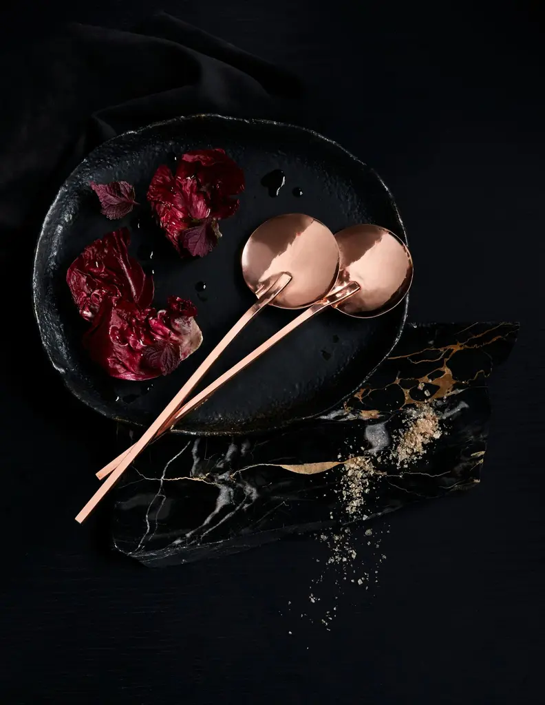 Two-piece set of modern high-polished copper serving spoons. Fabricated in rich copper and then finished by hand in his Brooklyn, NY studio, these pieces are the creation of silversmith and jewelry designer Heath Wagoner under HW. Studio. Designed for a hearty salad or an elegant touch to a family-style pasta, these mirror-finish copper serving spoons will pair perfectly with any handmade ceramics.Each piece is hand fabricated from copper sheets. The basins are domed and then soldered to the forged handles. After each piece is brought to a mirror finish. The set consists of two spoons. Given the nature of handmade objects, no two pieces or sets are truly identical. HW. Studio's work is meant to re-invigorate modern dining while employing jewelry techniques and craft to create objects that are jewelry for dining and for the table.