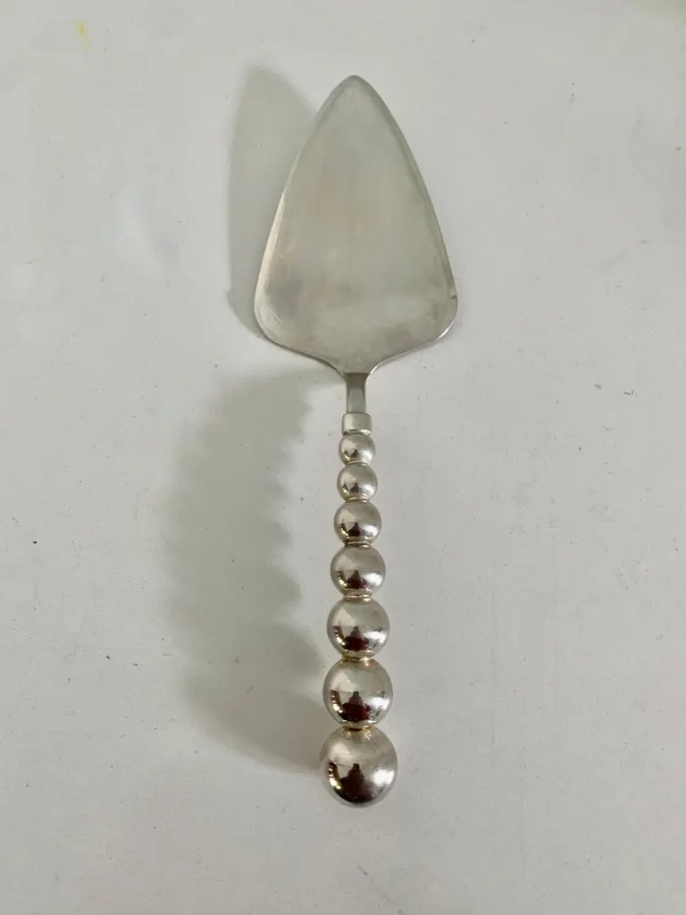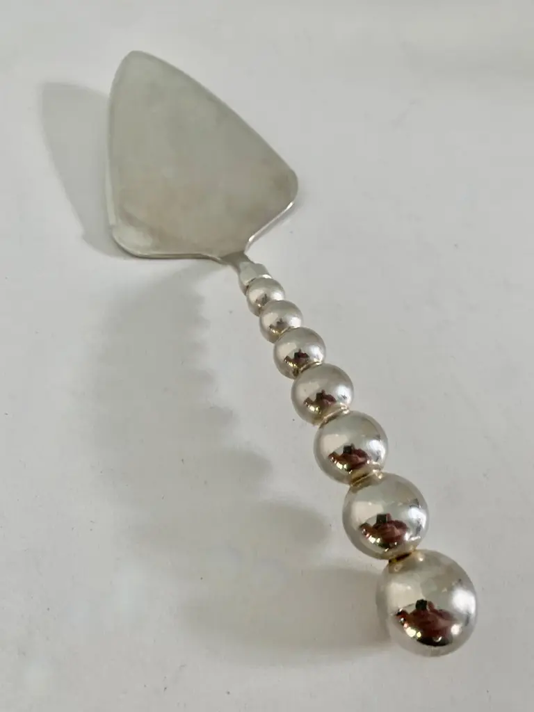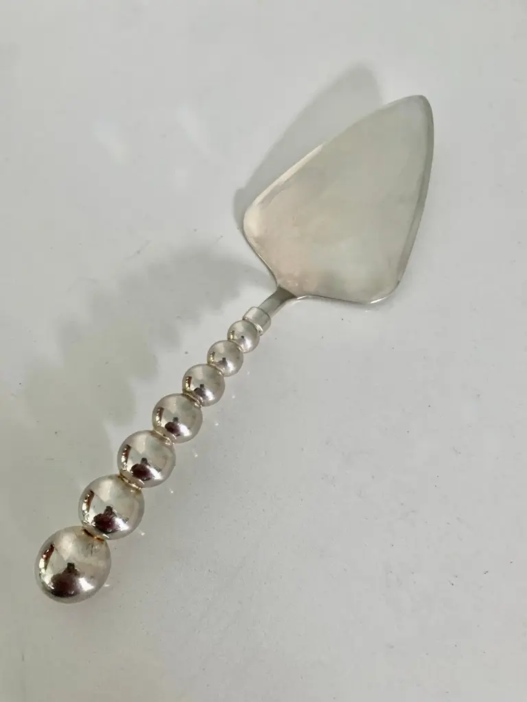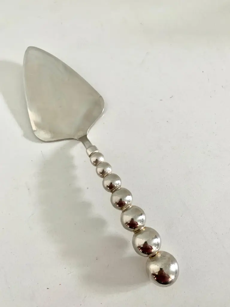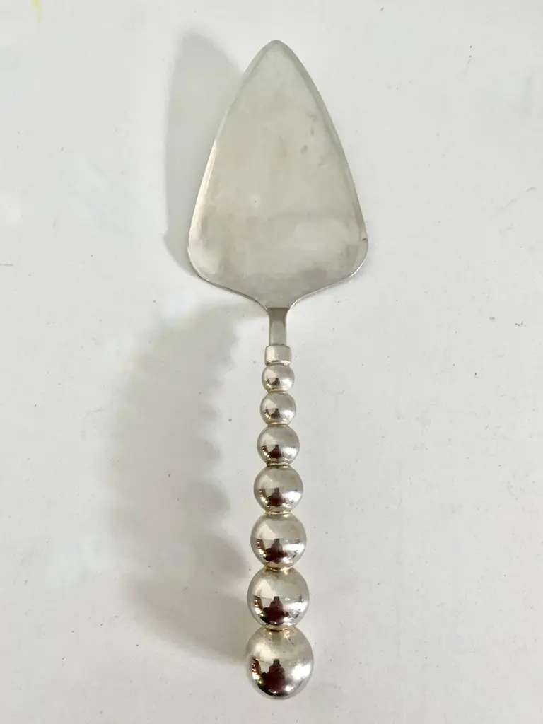 A Modernist Cake Server in silver plate. The piece has consecutive spheres leading to the server - a modern and chic piece for the sophisticated hostess. A very nice piece. We have two available. A wonderful Hostess or wedding gift. Two available.