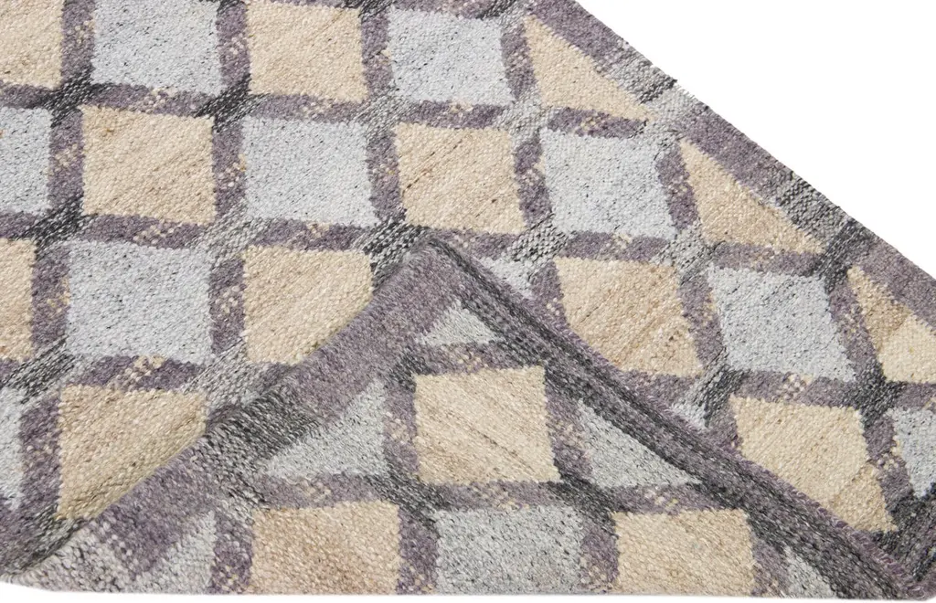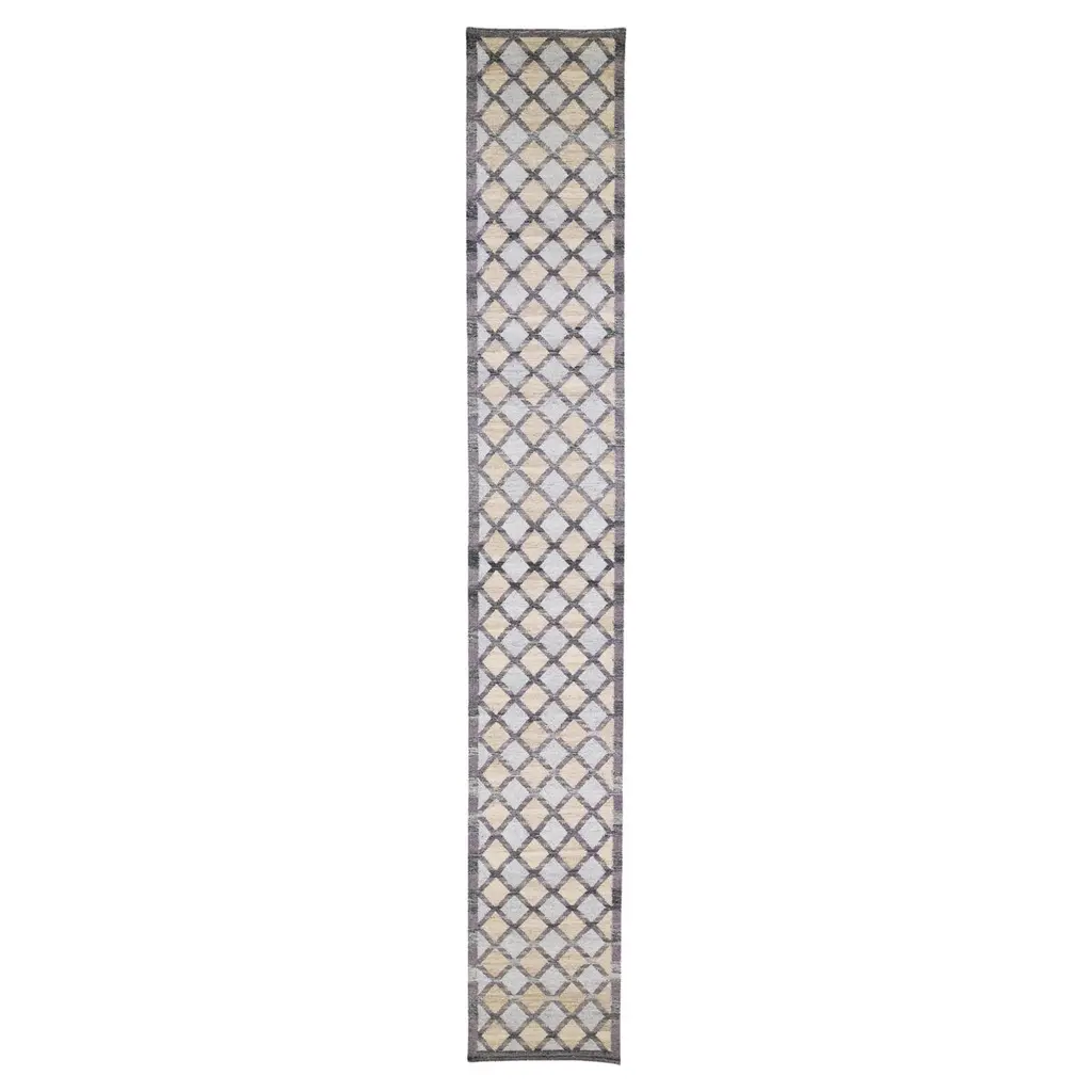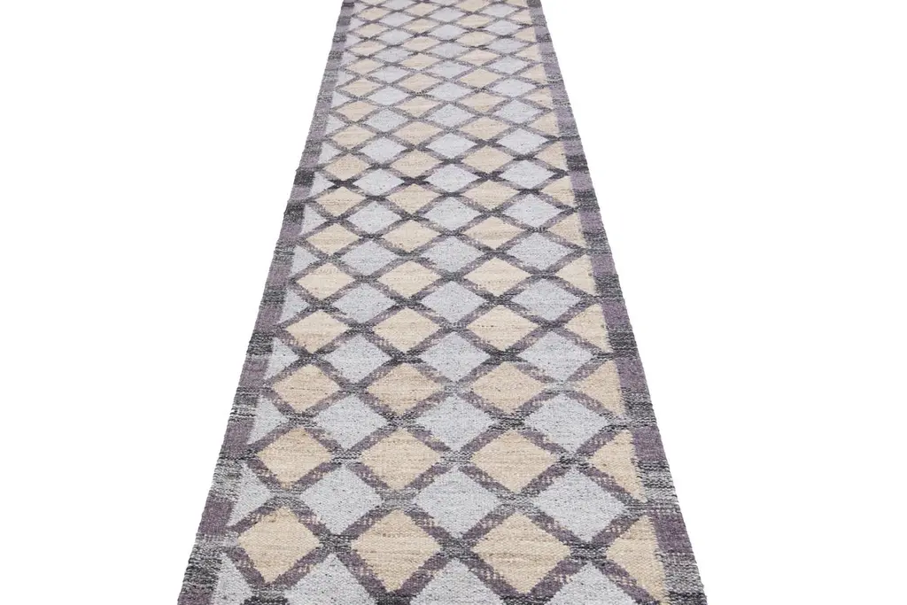 Beautiful modern Swedish-style wool rug with a gray field. This piece has beige and purple accents featuring a gorgeous all-over geometric design. This runner measures: 3'1" x 20'2''.Our rugs are professional cleaning before shipping.