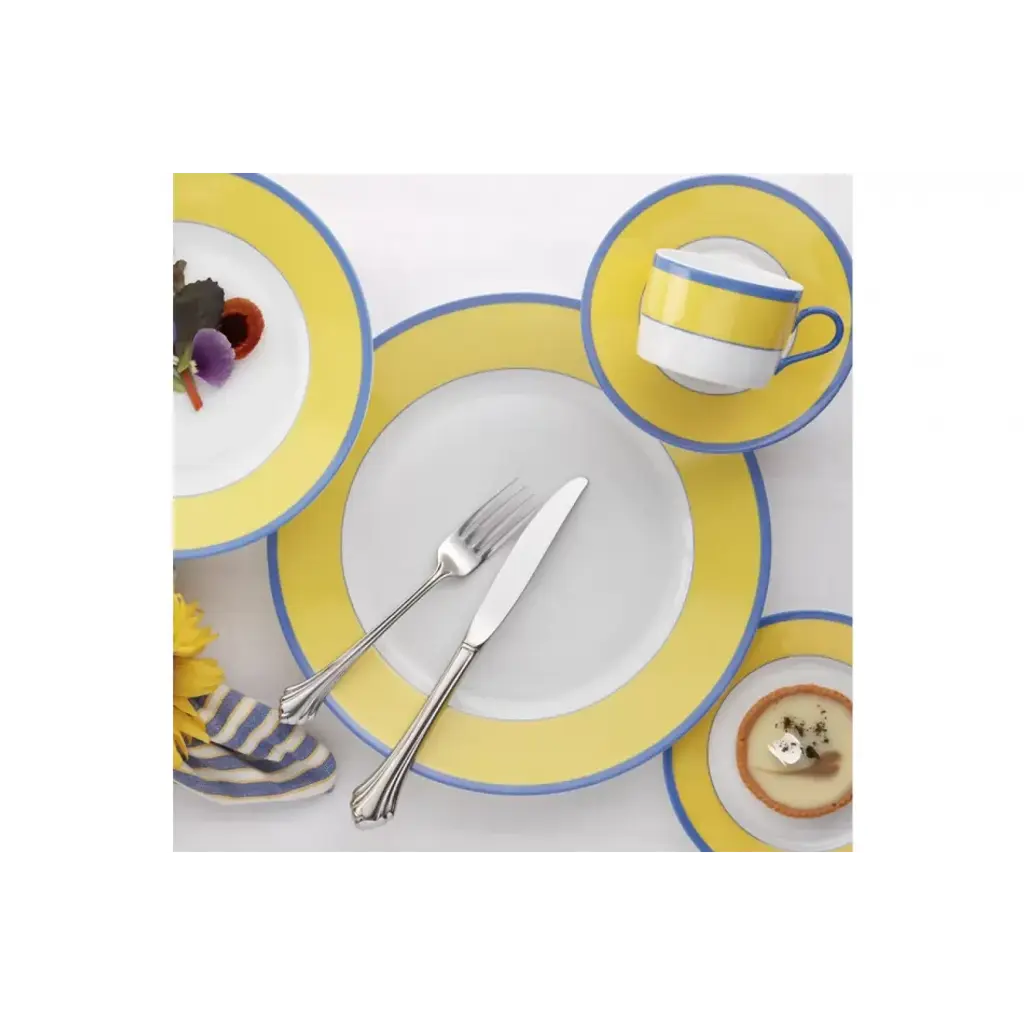 Colorful pastels summon the light artistic spirit of French impressionism. Produced in Limoges, France in Haviland & Parlon's world-renowned factory dating from 1924. Five-piece place setting includes dinner plate, salad plate, bread/butter plate, teacup, and saucer. In 1924, Robert Haviland collaborated with Camille Parlon to form Robert Haviland and C. Parlon. Robert Haviland was from a family with a long history in the porcelain business and was able to maintain the quality that his family was known for. The company produces its fine porcelain in Limoges, a French town well known for this coveted material.