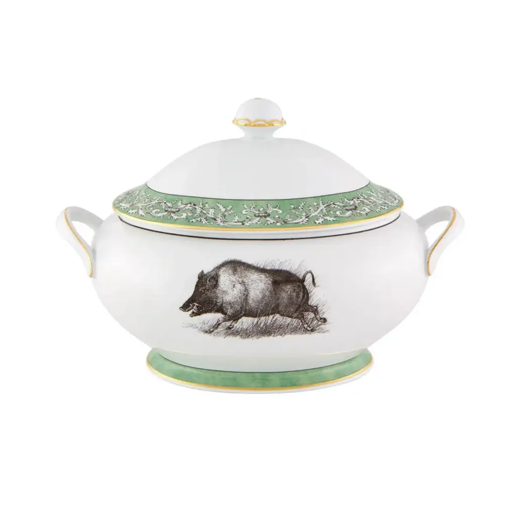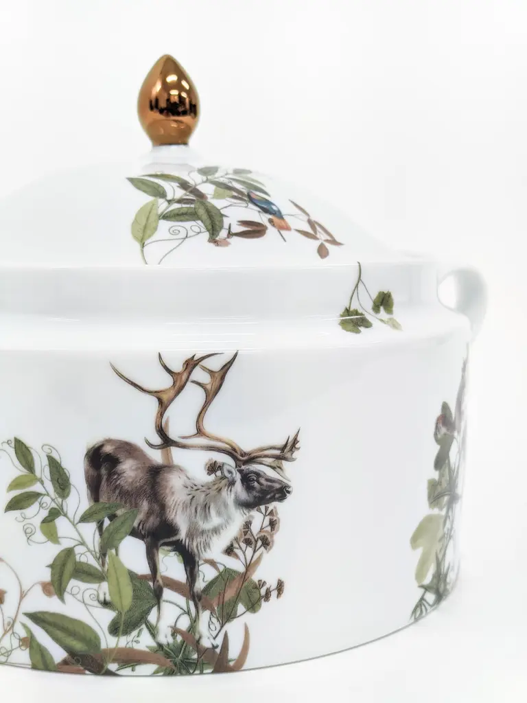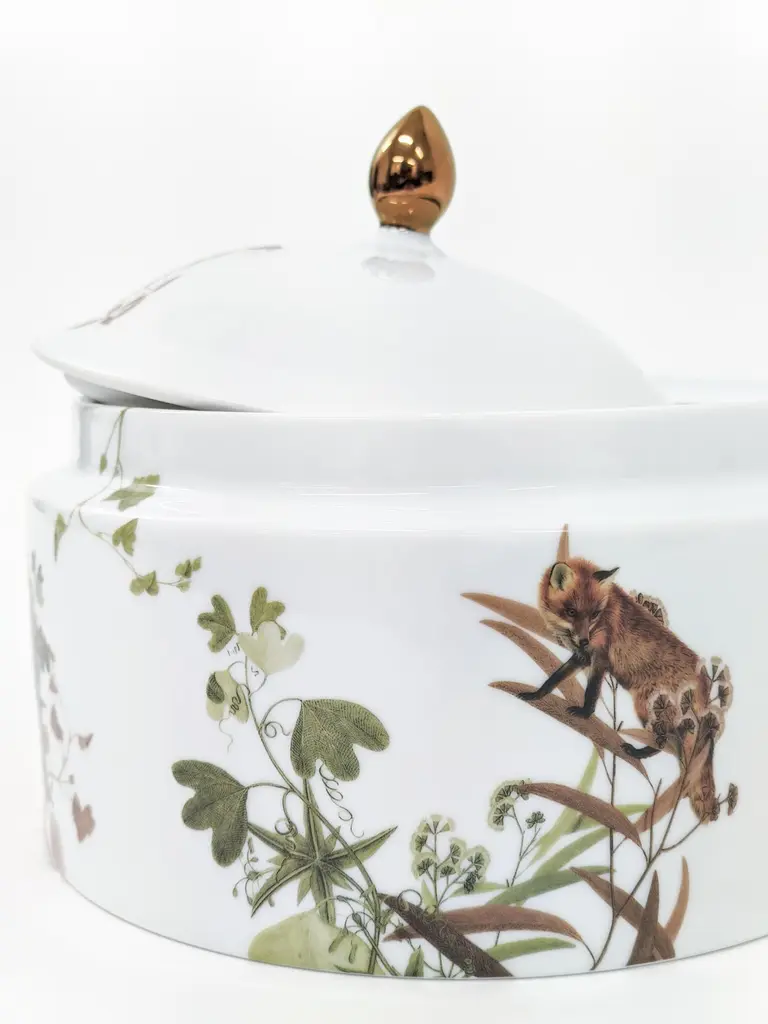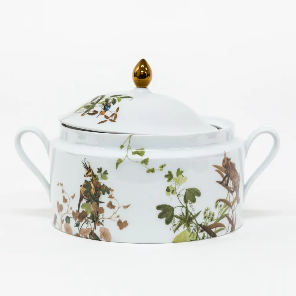 This soup tureen is a Grand Tour piece by Vito Nesta that is part of the Mont Blanc porcelain collection, Inspired by the highest mountain of the Alps, the Mont Blanc, this collection is a photography of the changing seasons. Winter is here and all the animals of the woods are enjoying the glazing air, playing hide and seek among the leaves.