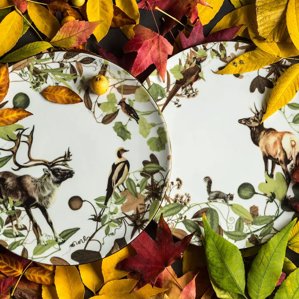 Check out our unique hunting scene Mont Blanc dinnerware set. The autumn leafage provides the perfect frame for the beautifully drawn mountain animals. A moose and a goose dominate the scene, while a bird is perched on a branch in the background. These timeless plates are fit for rustic or country house décor.