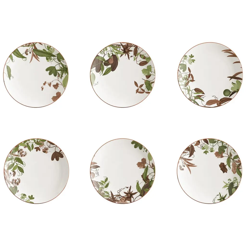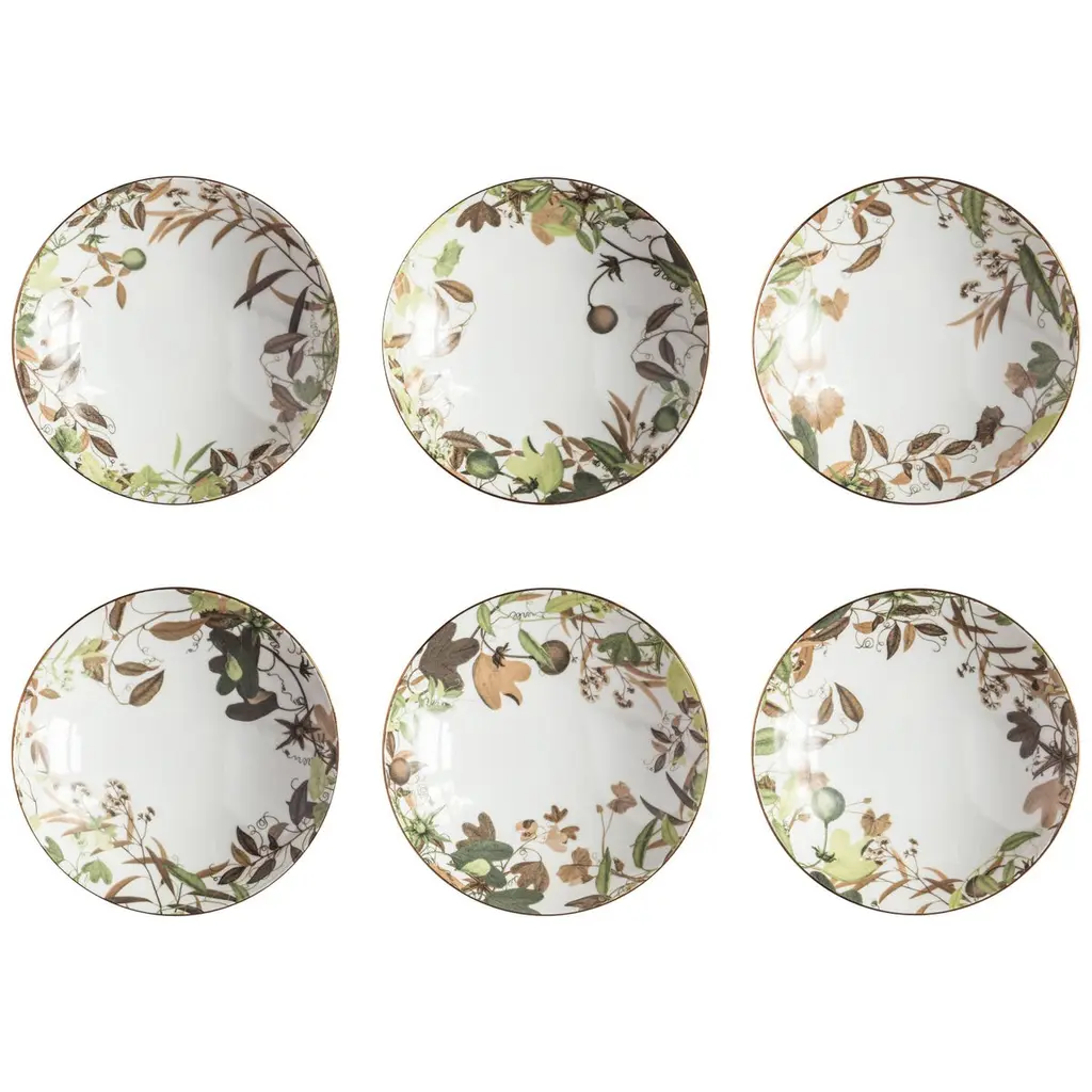 Adorning a modern dining table with exquisite sophistication, this set of six fruit plates is entirely handcrafted of fine porcelain. Delicately painted by hand, each piece flaunts a captivating forest foliage decoration enhanced with realistic earthy hues, typical of the hunting-themed Mont Blanc series from Vito Nesta's Grand Tour Collection.