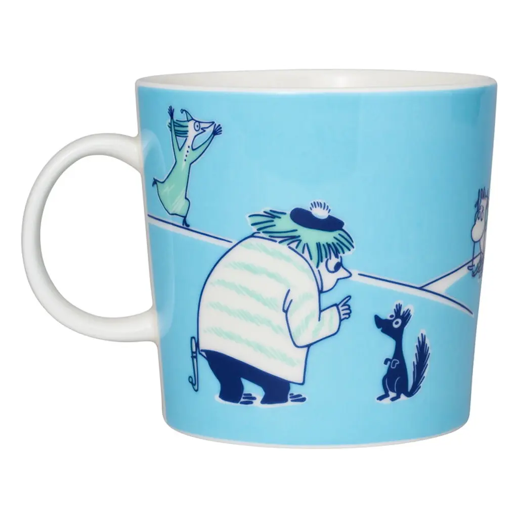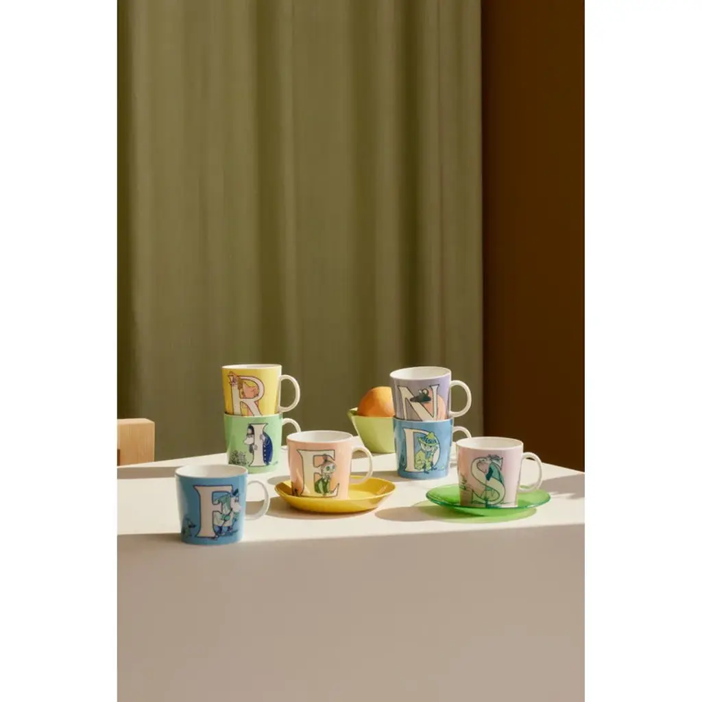 The Moomin ABC mugs are decorated with adorable initials featuring various Moomin characters. In the illustration of the "F" mug, winter has arrived at Moominvalley. Hemulen tries to get everyone outdoors and skiing with him, but Too-ticky is afraid that the smaller creatures might get frostbite. The illustration is based on the novel Moominland Midwinter. The F mug is part of the “Reading, writing and the Moomins” initiative that promotes the importance of literacy and the joys of reading. The mugs' Moomin alphabet is based on Tove Jansson’s hand-drawn initial capitals and lettering created for the book The Memoirs of Moominpappa as well as her maps of Moominvalley. The mugs' form is familiar from the Iittala Teema series, but in contrast to most Moomin mugs, the ABC mugs’ size is larger: 13.53 x 0 fl oz (4 x dl. dl). Which words would you form with the Moomin letters?